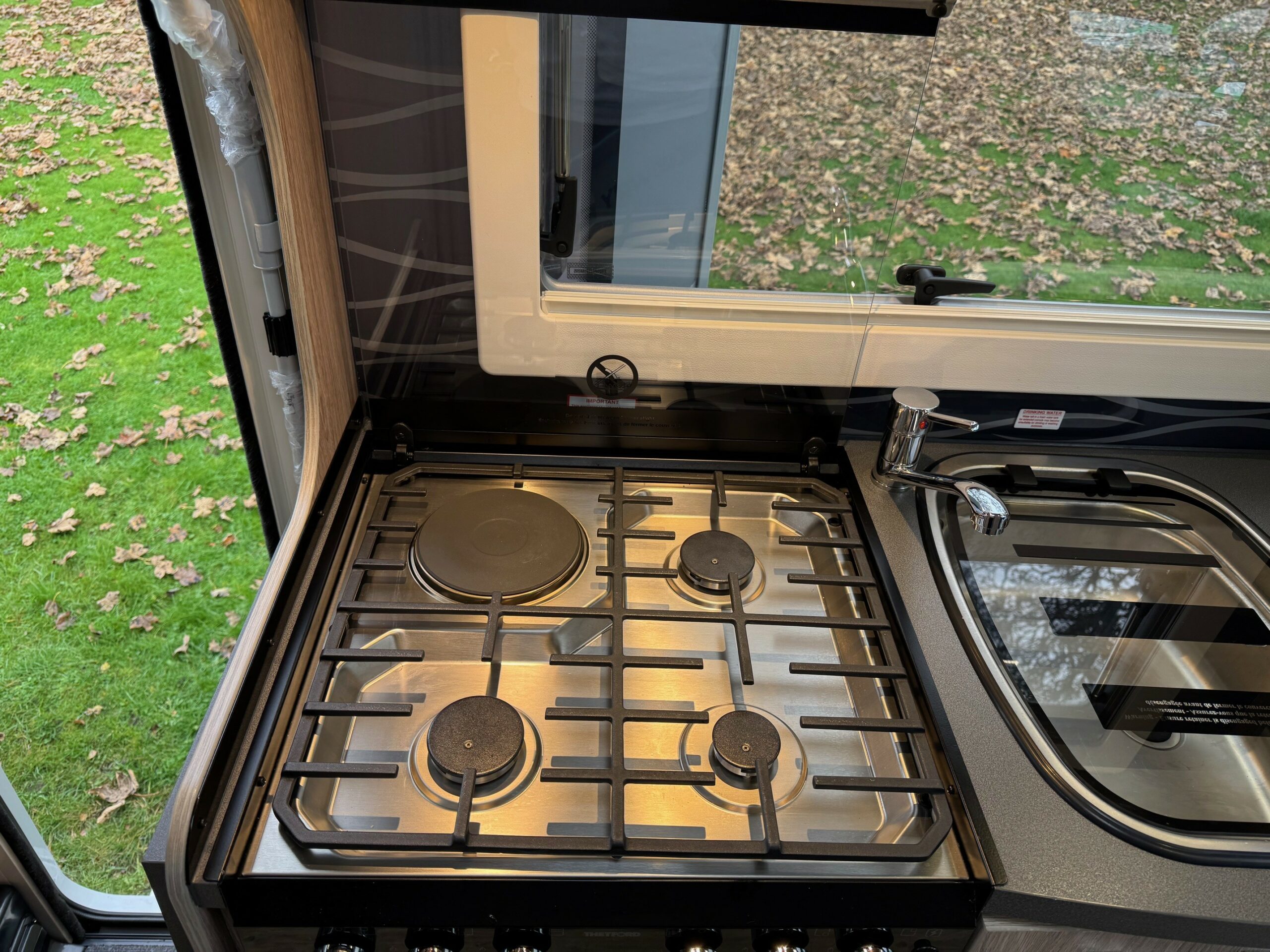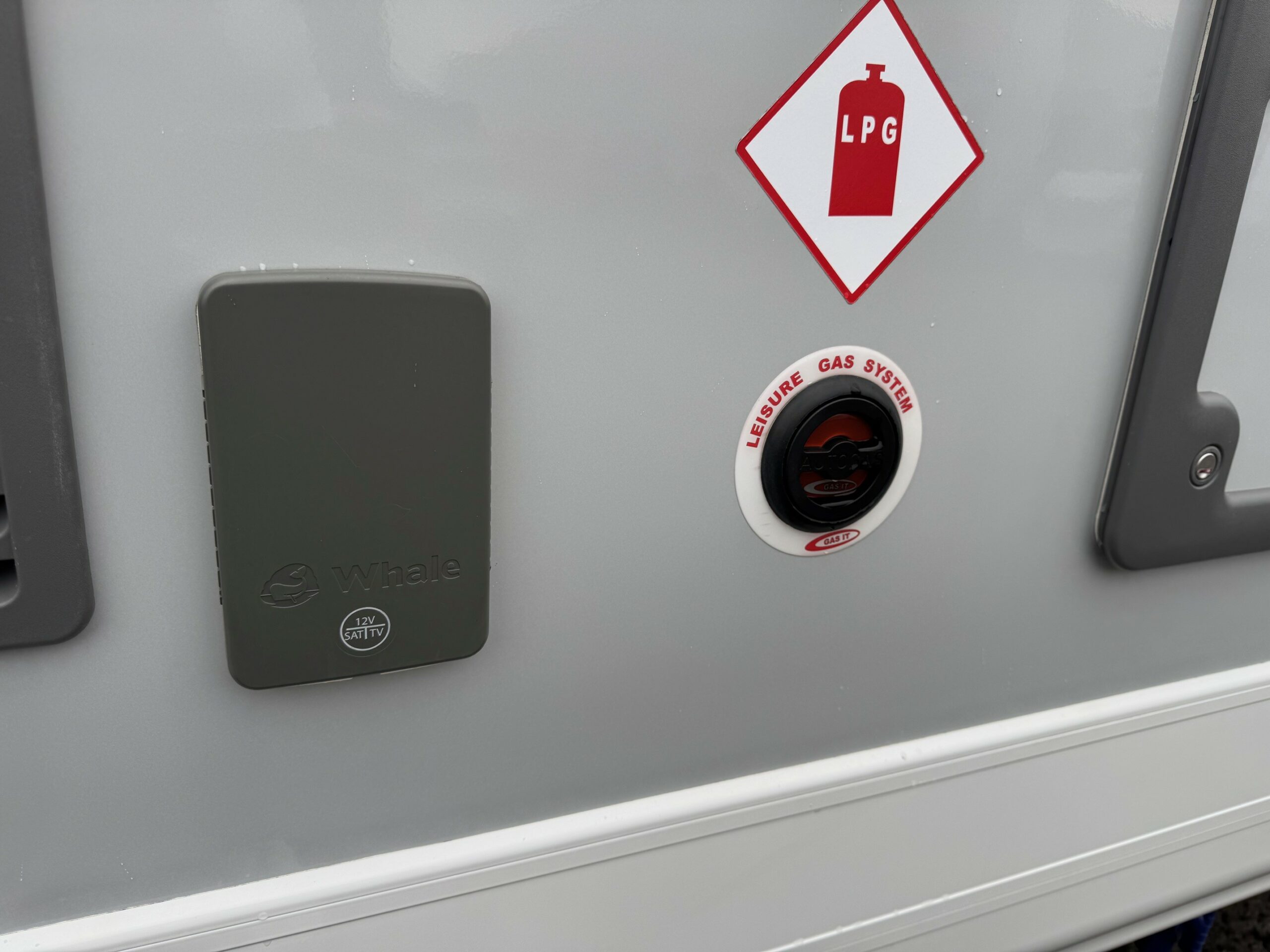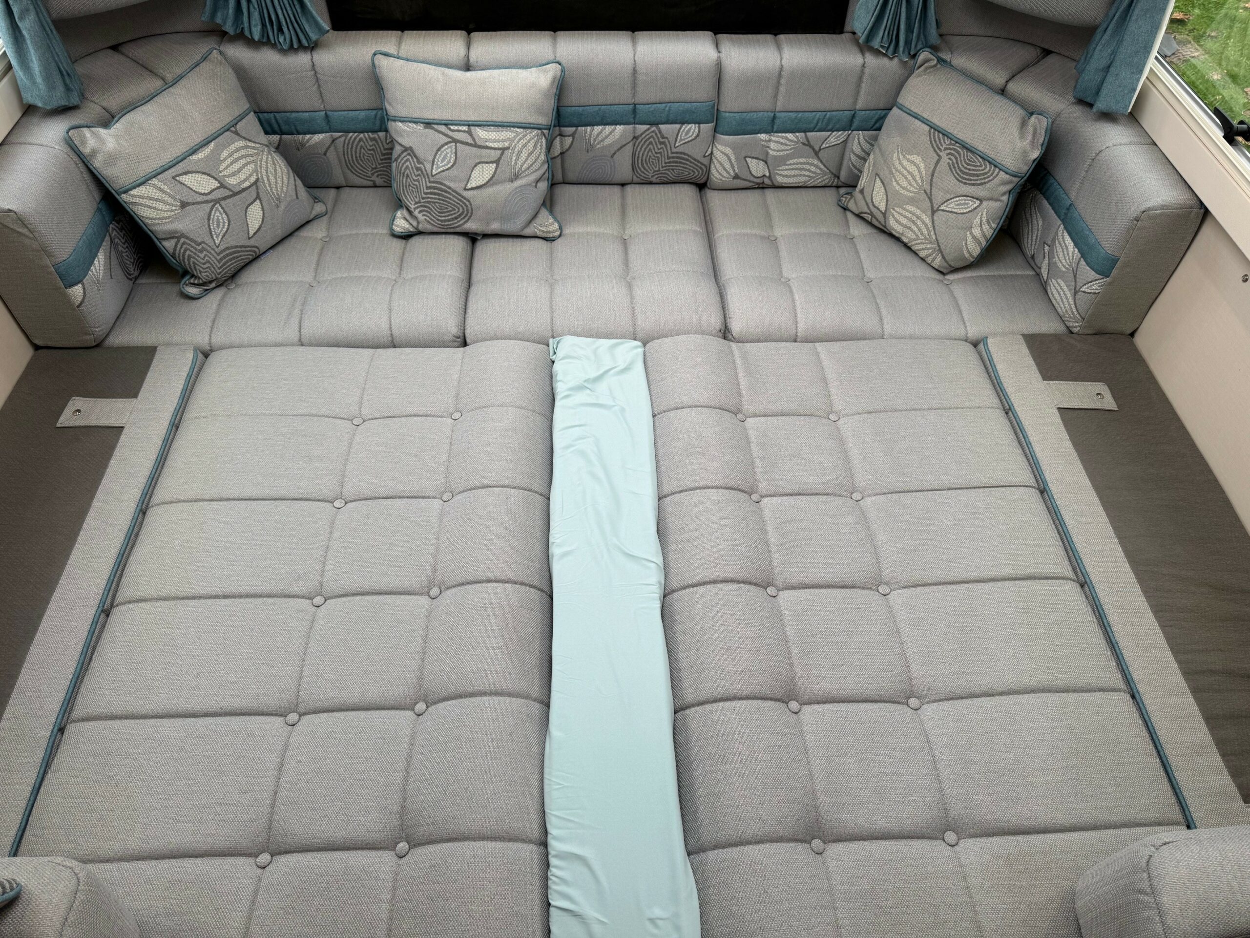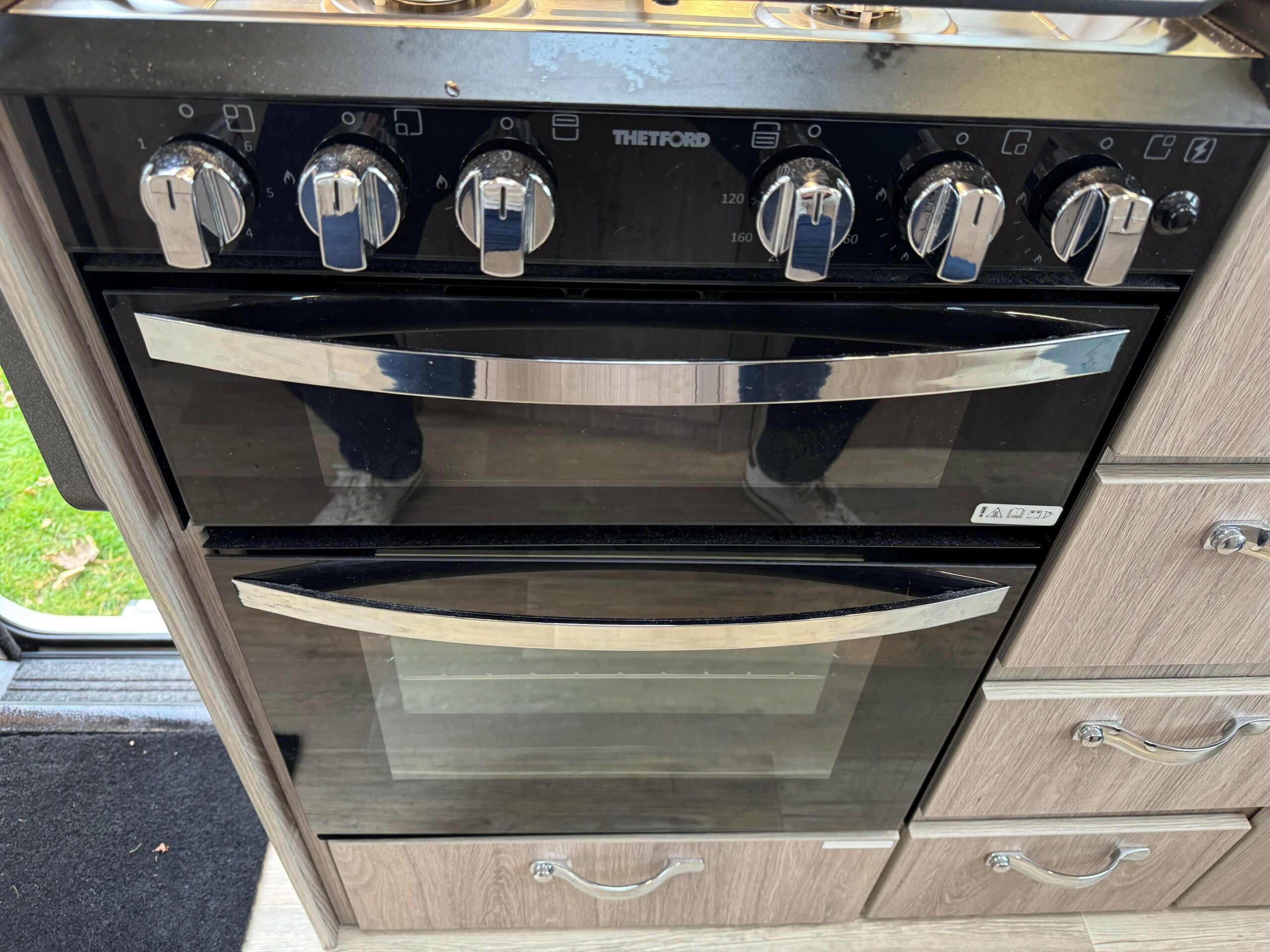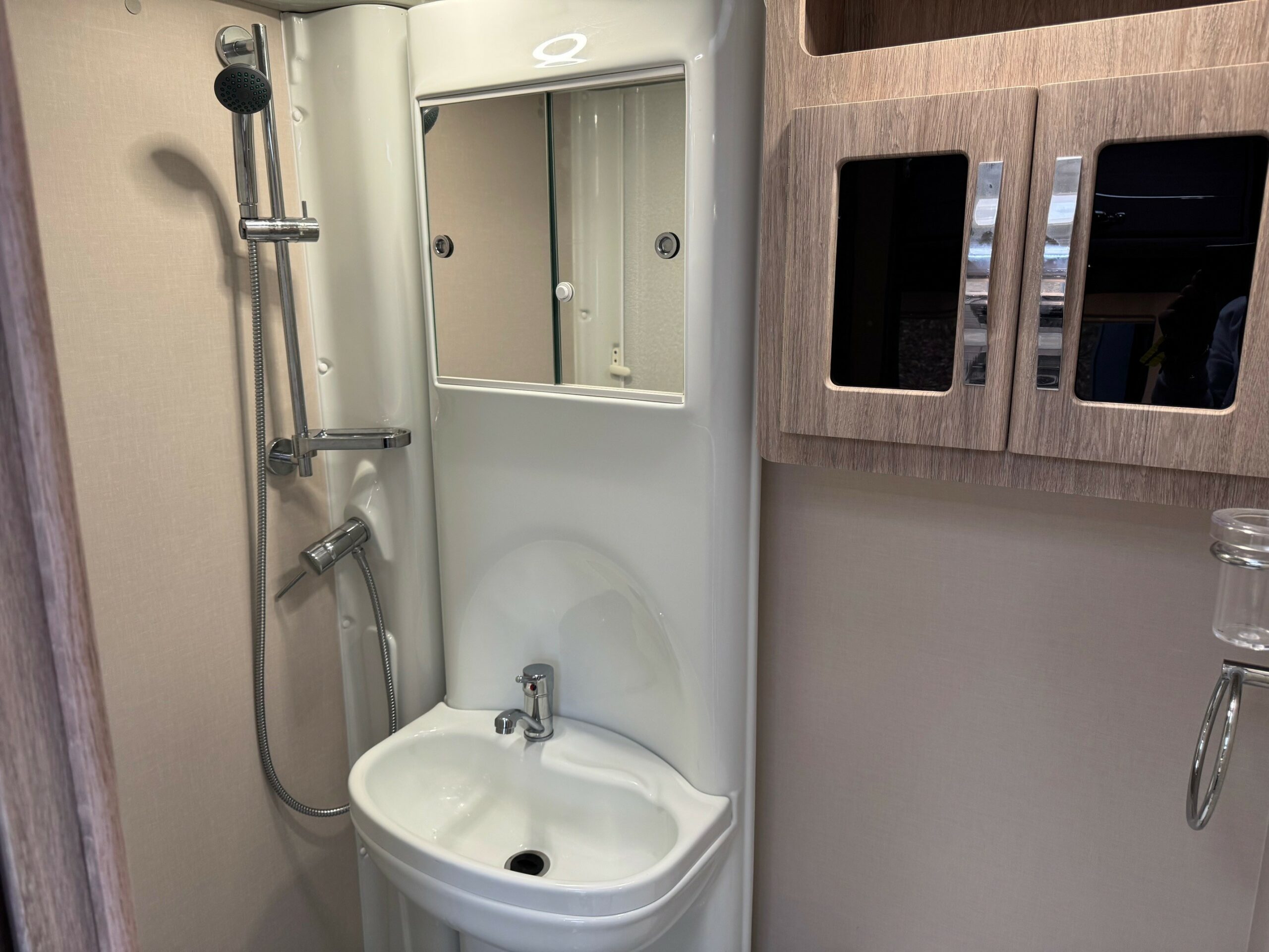 Large rear lounge that creates either a large double or 2 single beds. Mid washroom with folding shower wall to create an enclosed shower cubicle. Very well equipped kitchen with electric hot plate, 3 ring gas hob, oven & grill. 145l fridge/freezer, extractor fan, microwave.