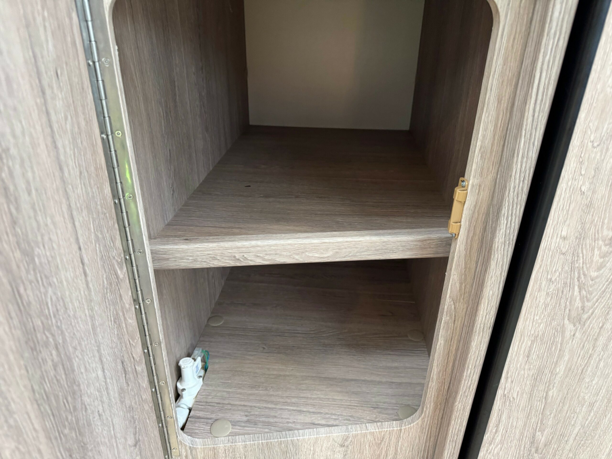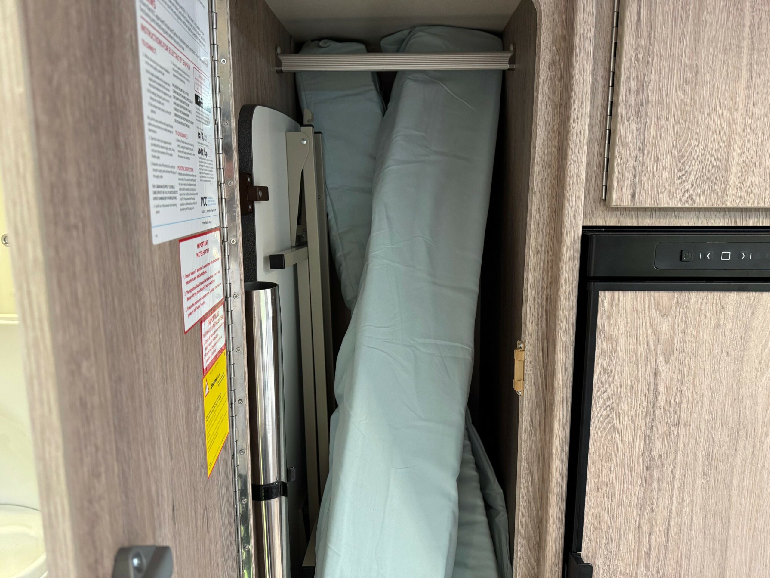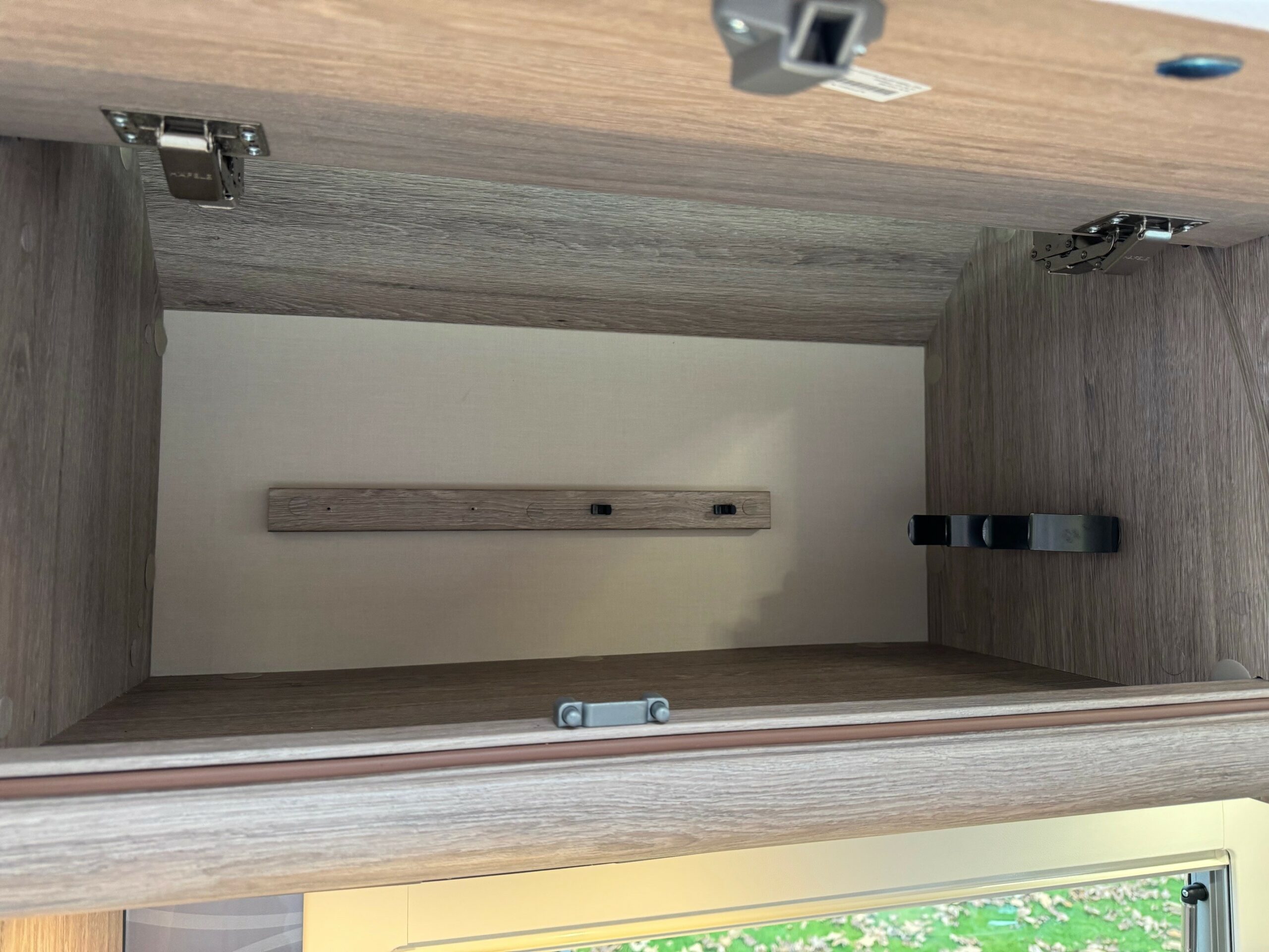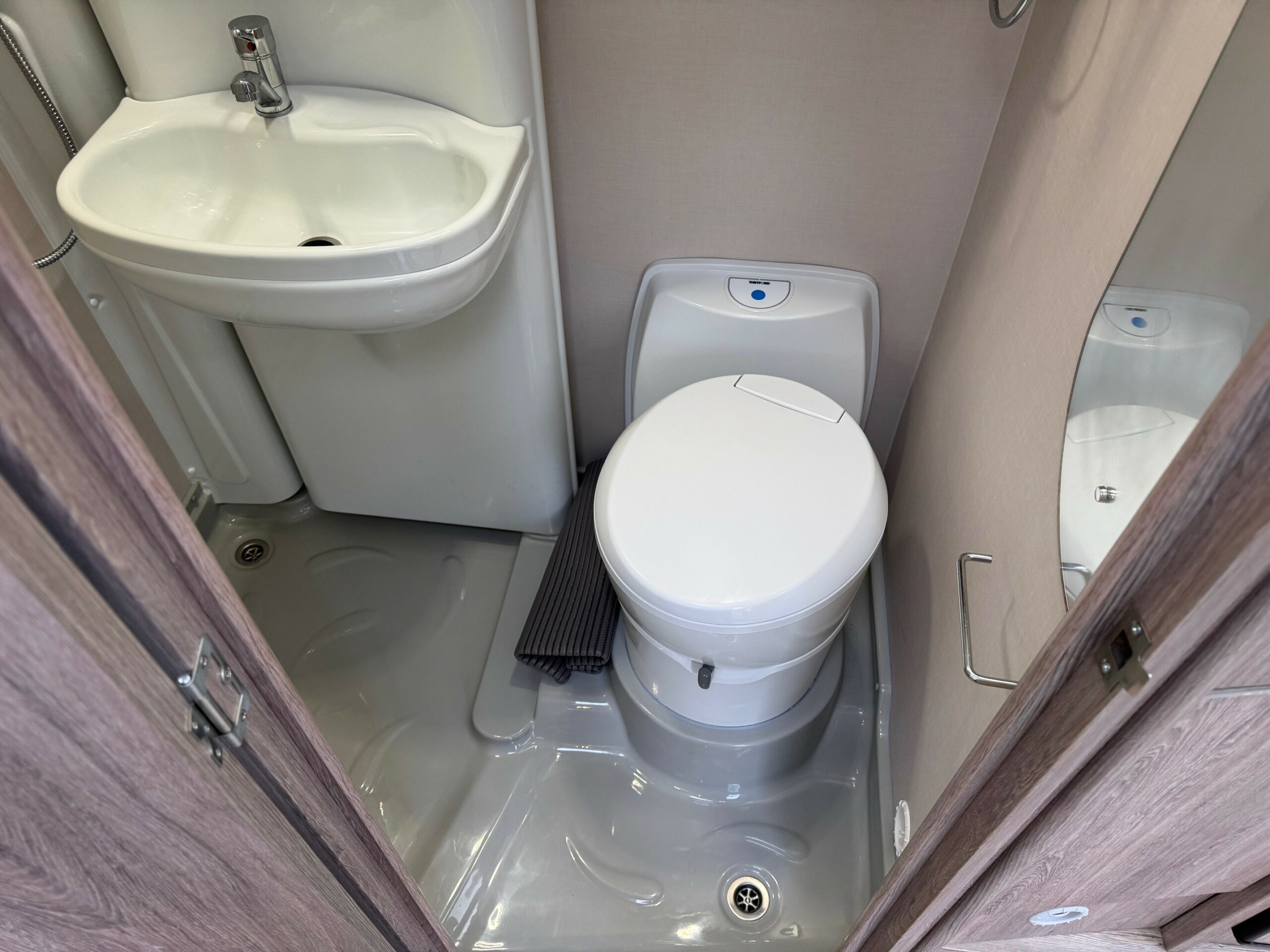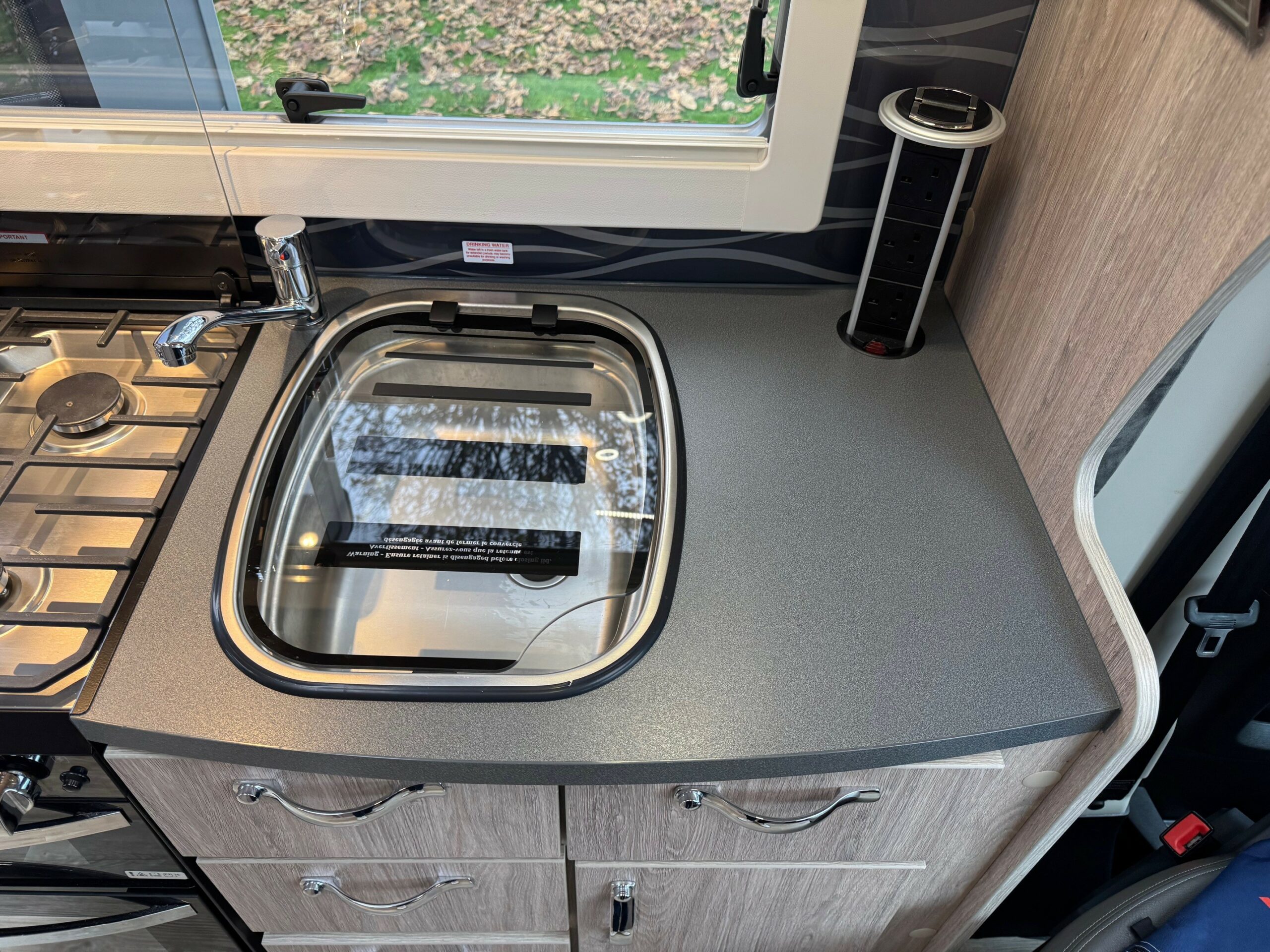 Large rear lounge that creates either a large double or 2 single beds. Mid washroom with folding shower wall to create an enclosed shower cubicle. Very well equipped kitchen with electric hot plate, 3 ring gas hob, oven & grill. 145l fridge/freezer, extractor fan, microwave.