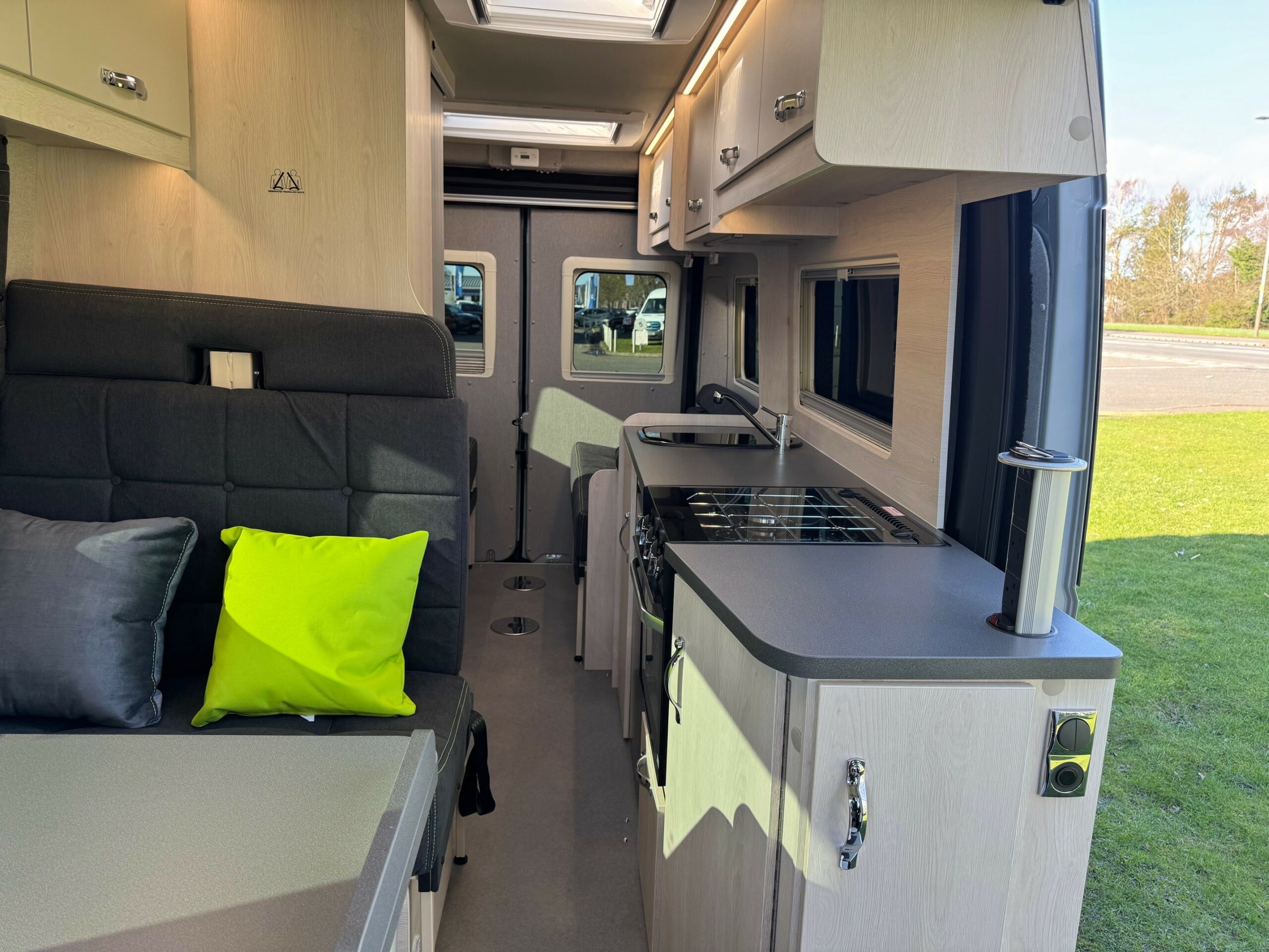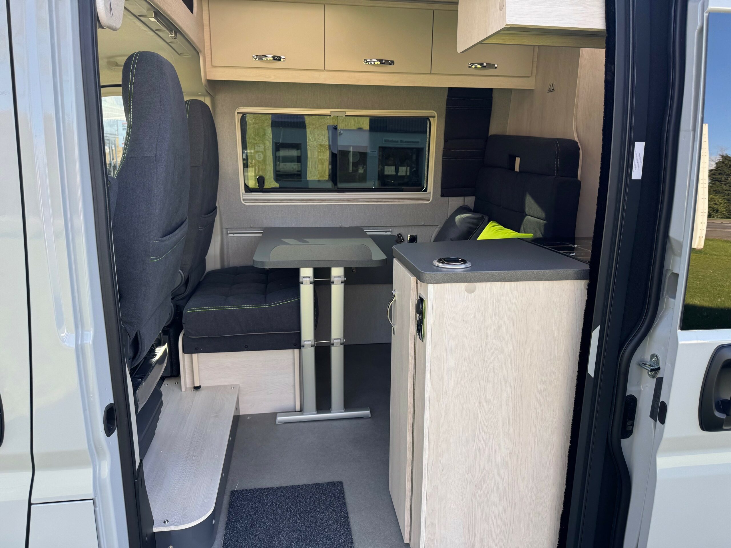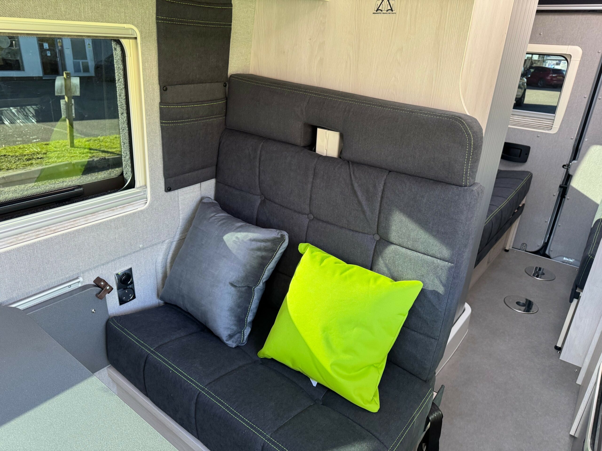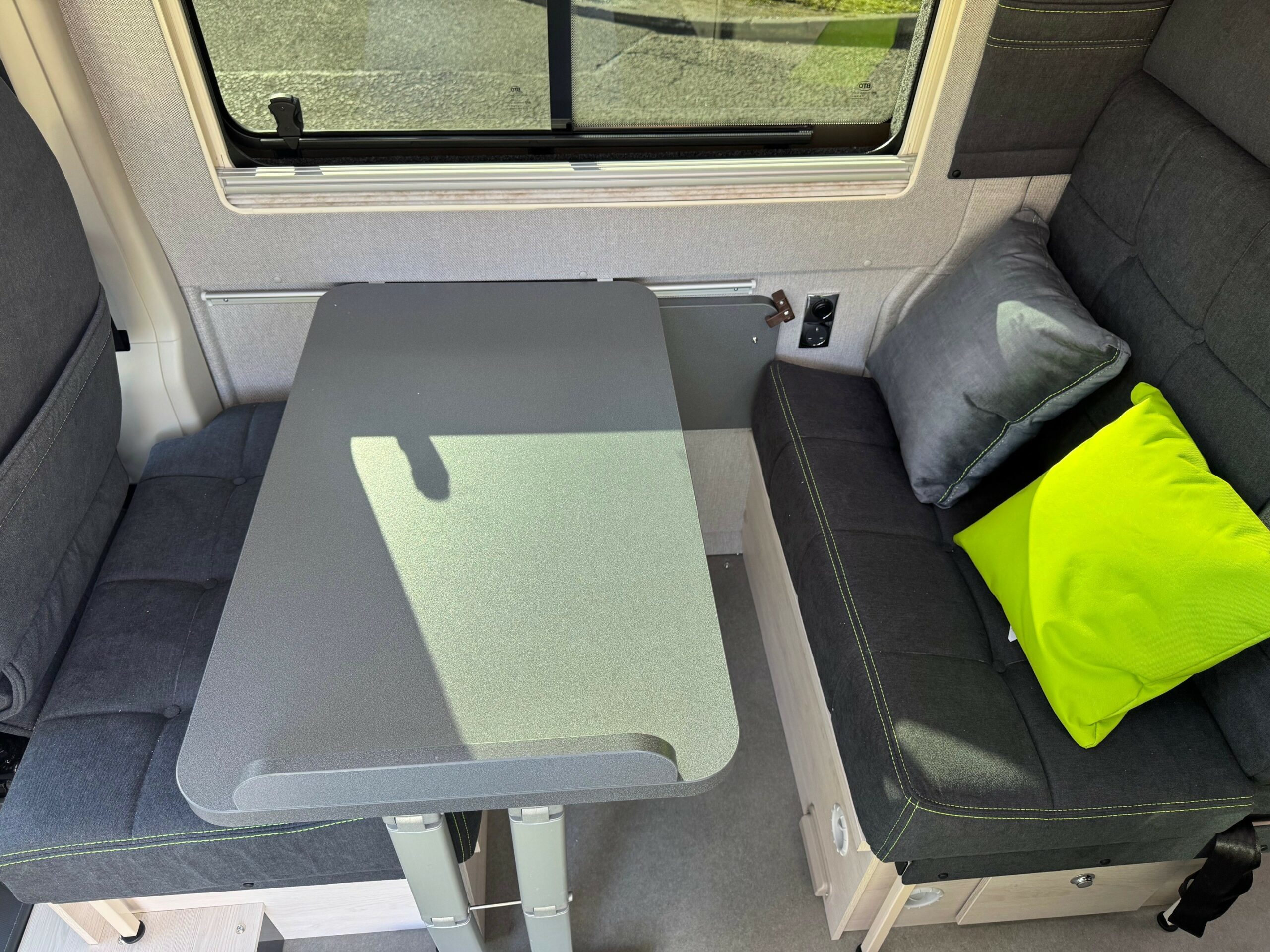 Stunning 4 berth 4 belt van conversion. Featuring a versatile twin lounge layout with practical dinette seating in the front that flows through to a generous rear living area, the Active FL 635 delivers maximum flexibility for every journey and is available with the option of a pop-top roof to offer the perfect blend of comfort, space, and innovation. Explore the all-new family-focused campervan range.