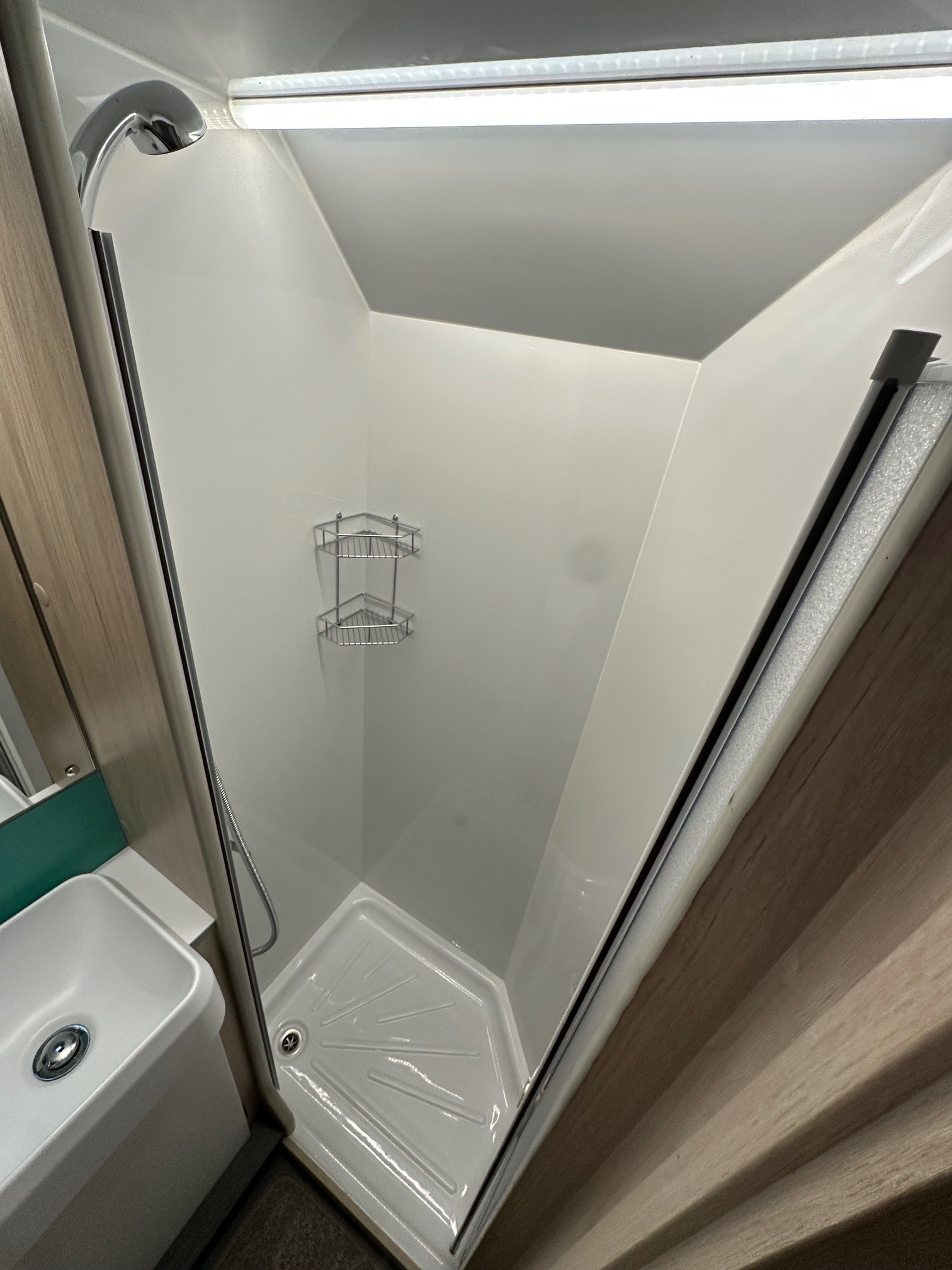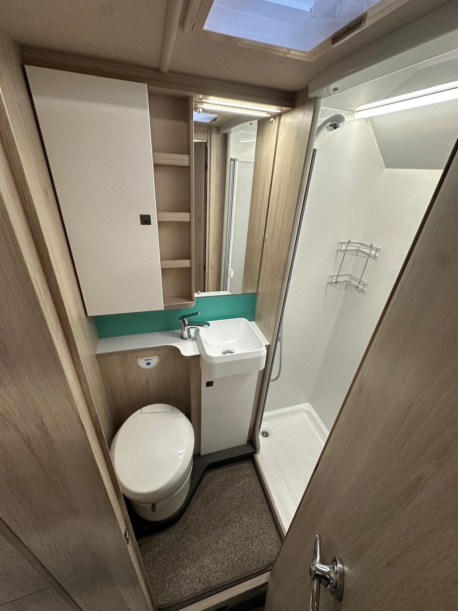 - Luxury Washroom:Â A spacious rear bathroom featuring a separate shower cubicle, vanity basin, and electric flush cassette toilet.