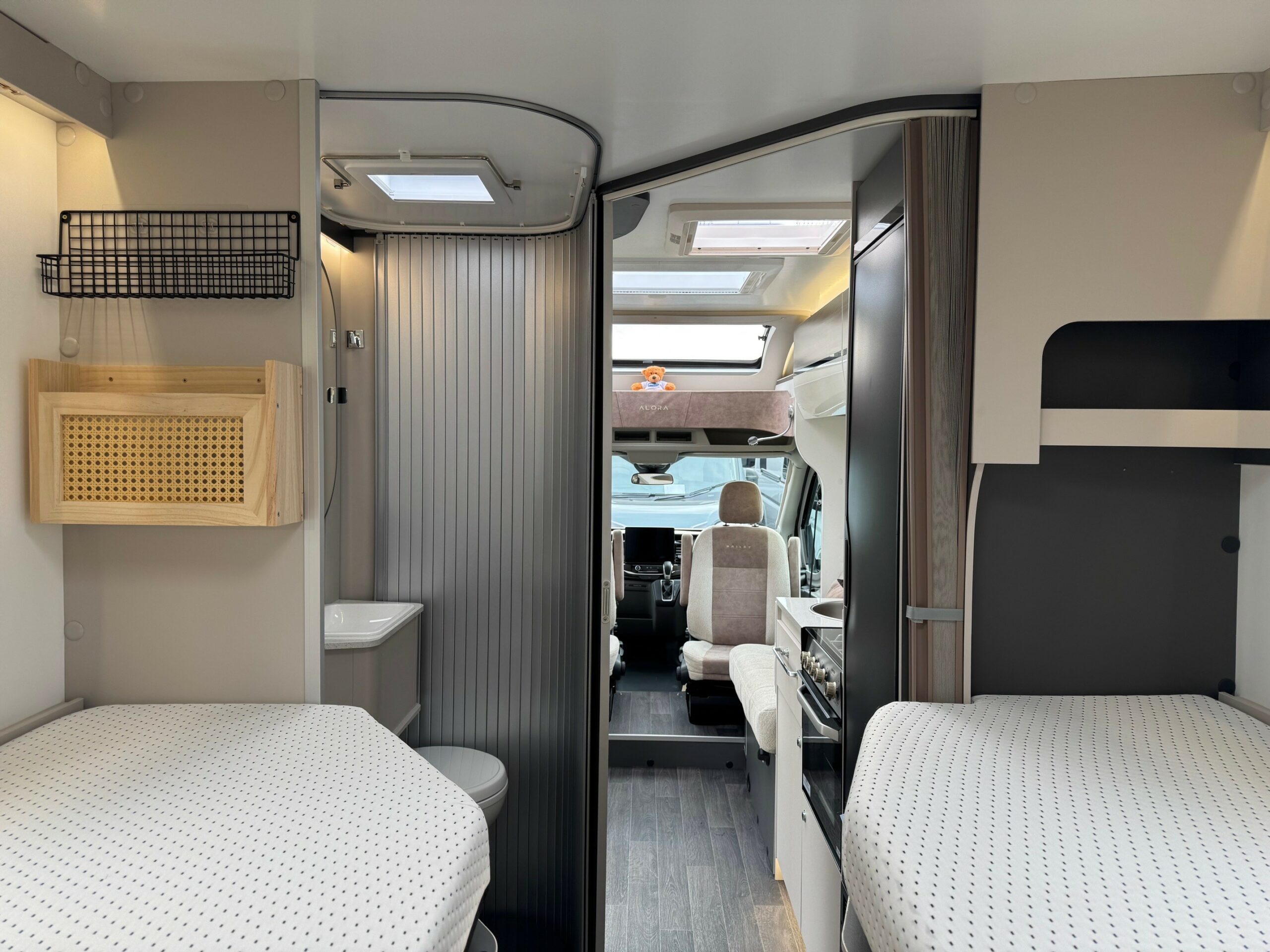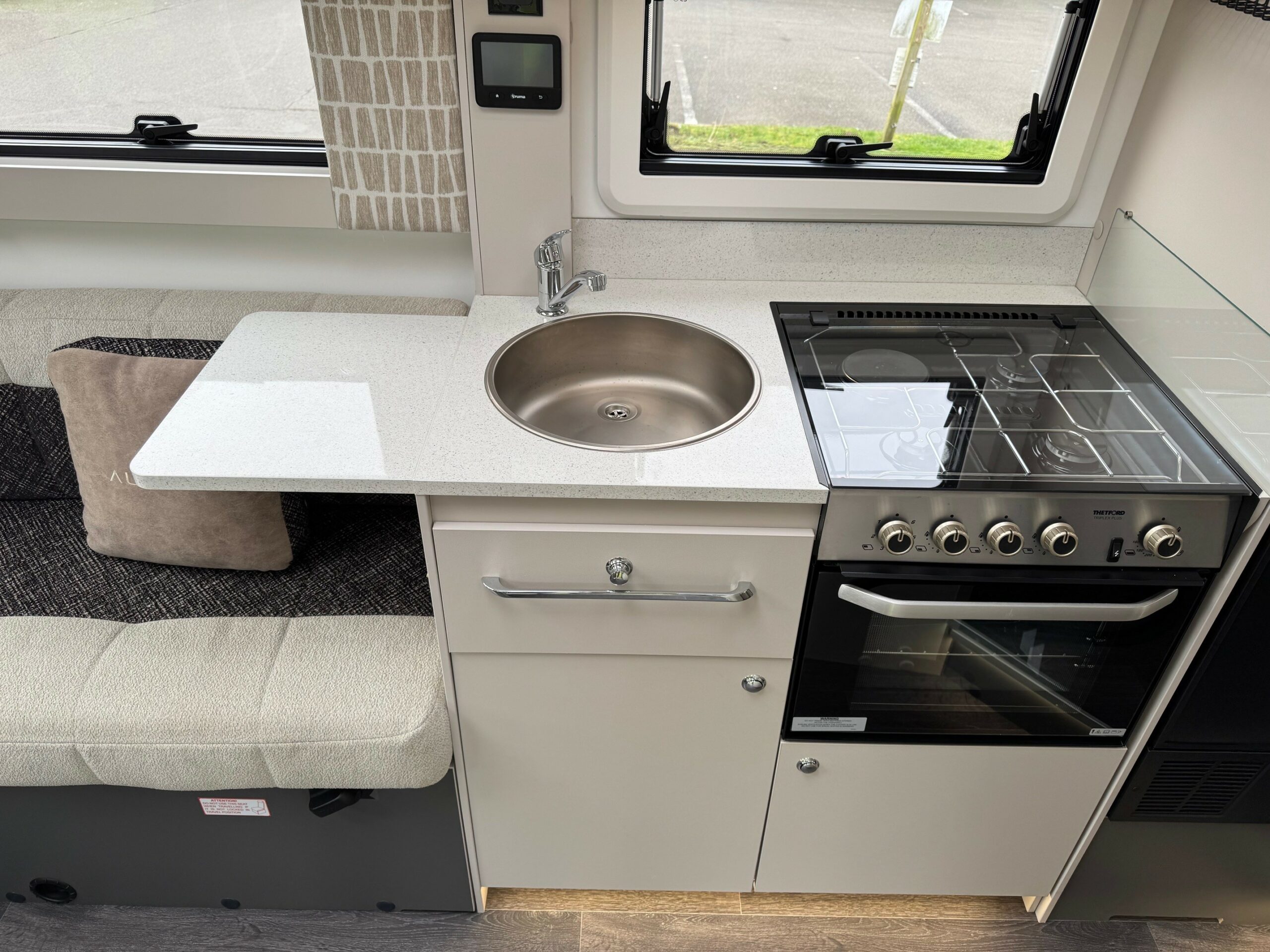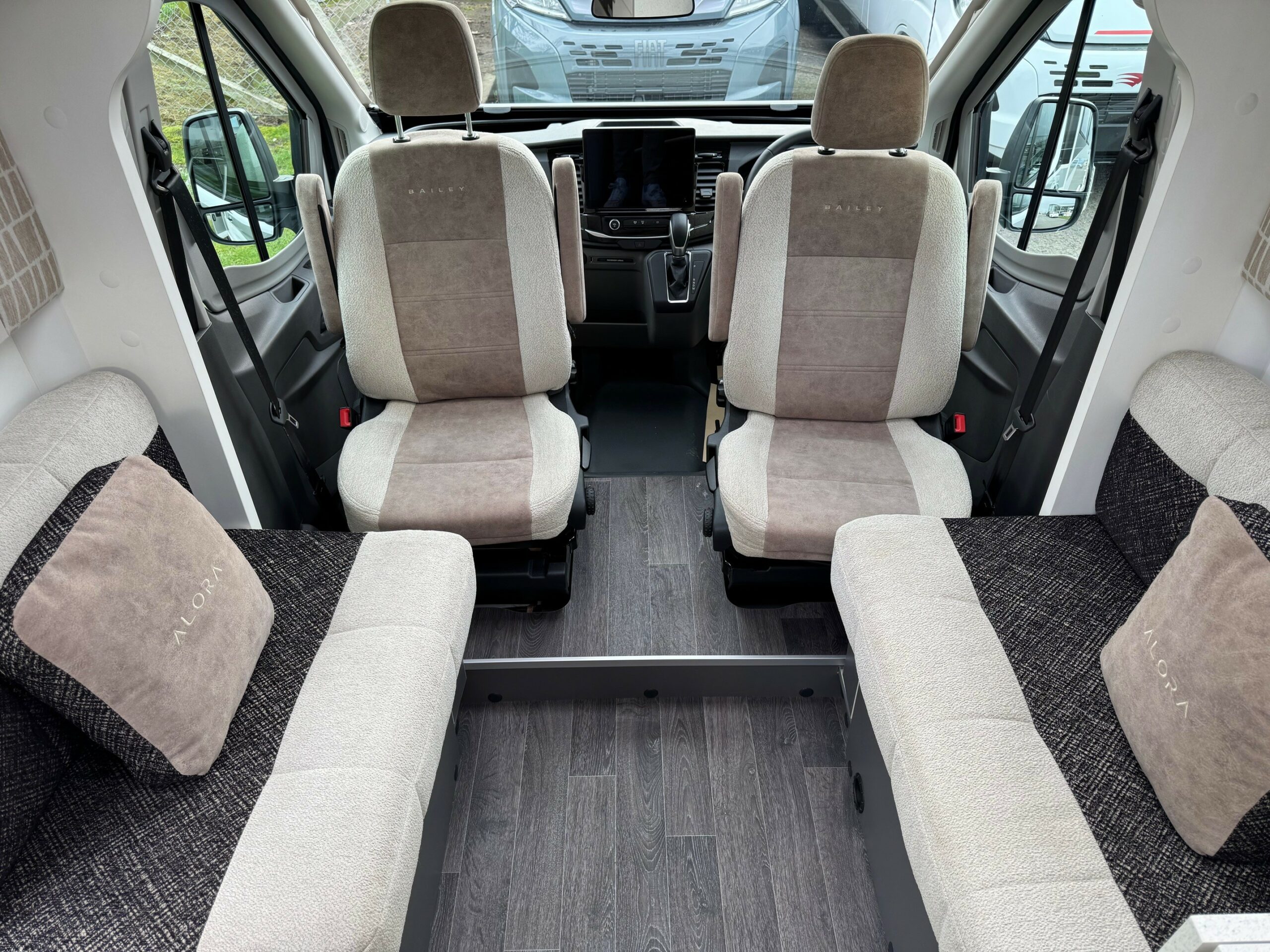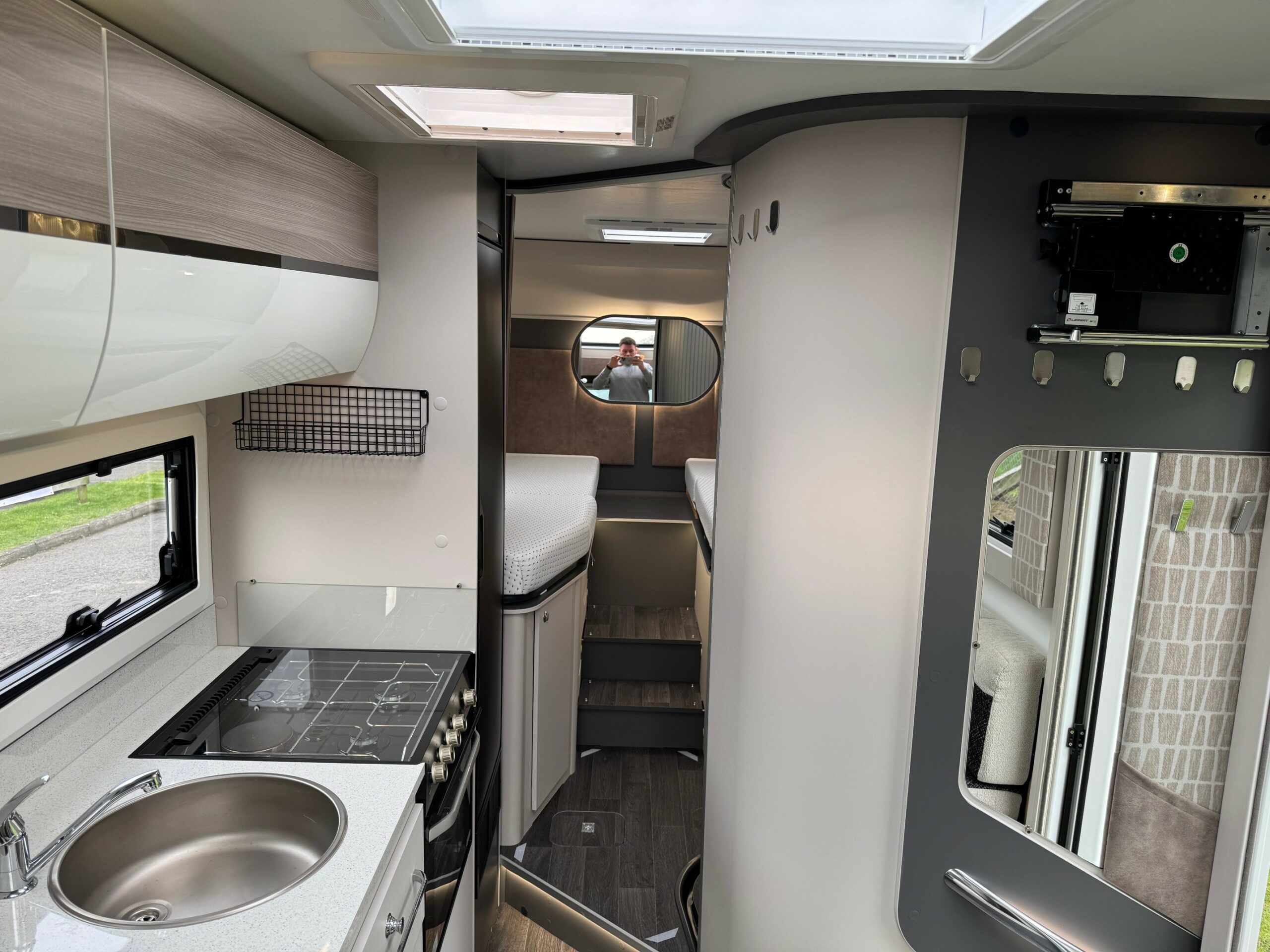 This stunning 4 berth 4 belt low profile with rear single beds over garage. The single beds do also make a very large full double. Wardrobes under each of the beds. Side wash room with sliding shower wall to create a large shower cubicle. The kitchen is very well equipped with, 3 ring gas hob & electric hot plate, large fridge/freezer & oven/grill. Open plan front lounge with 2 side facing bench seats & 2 captains chairs. The lounge then creates a further double bed.
