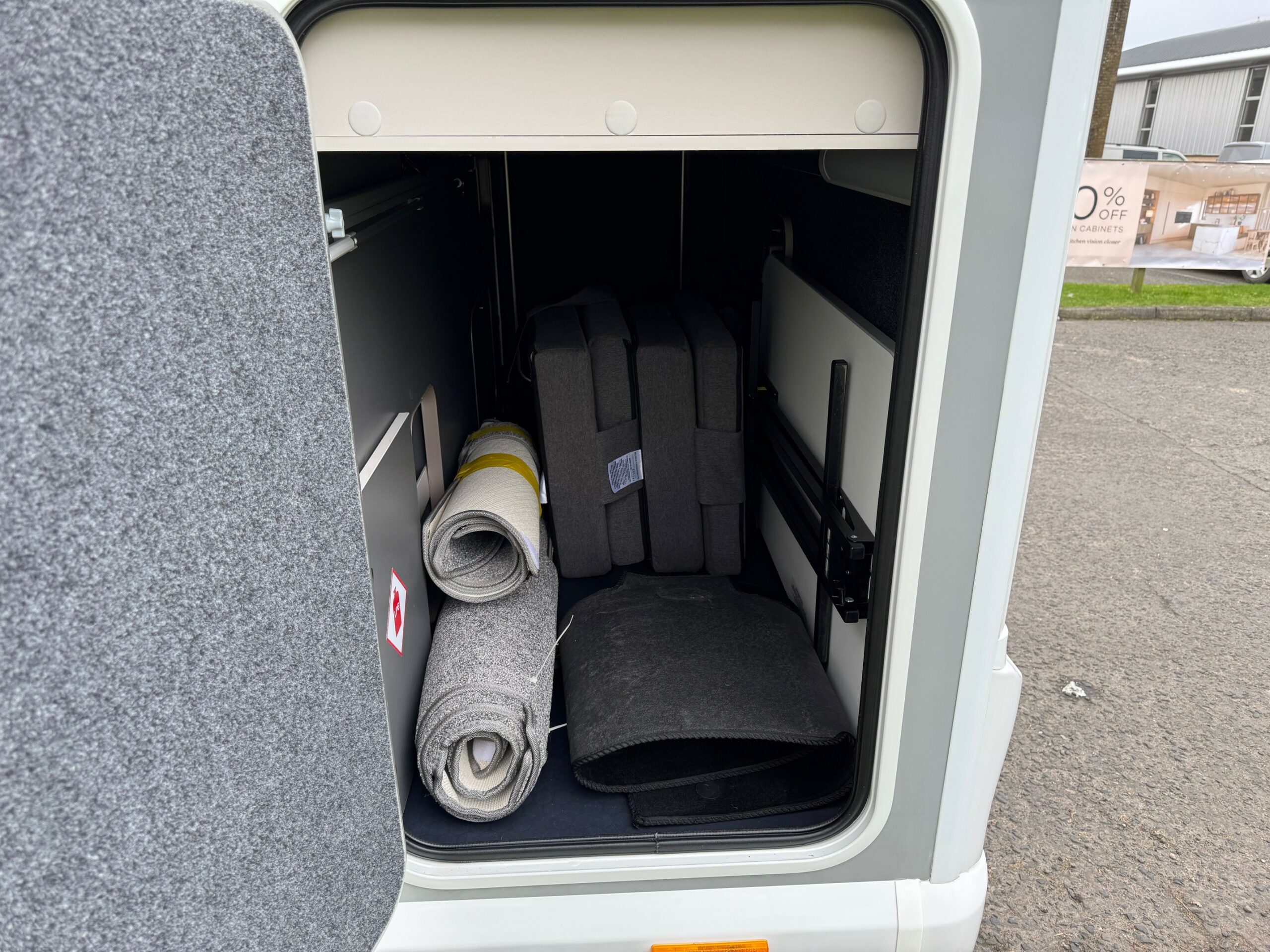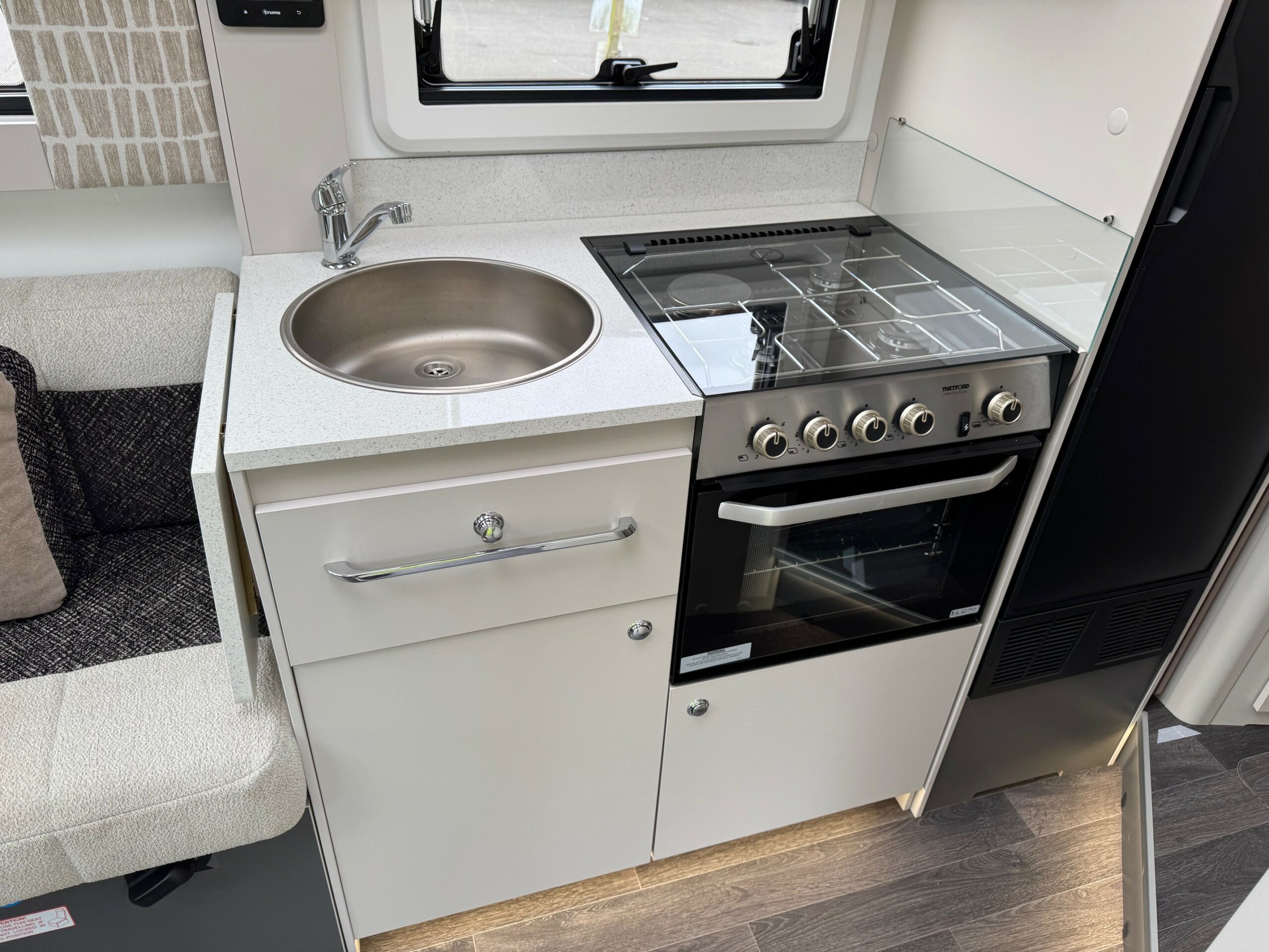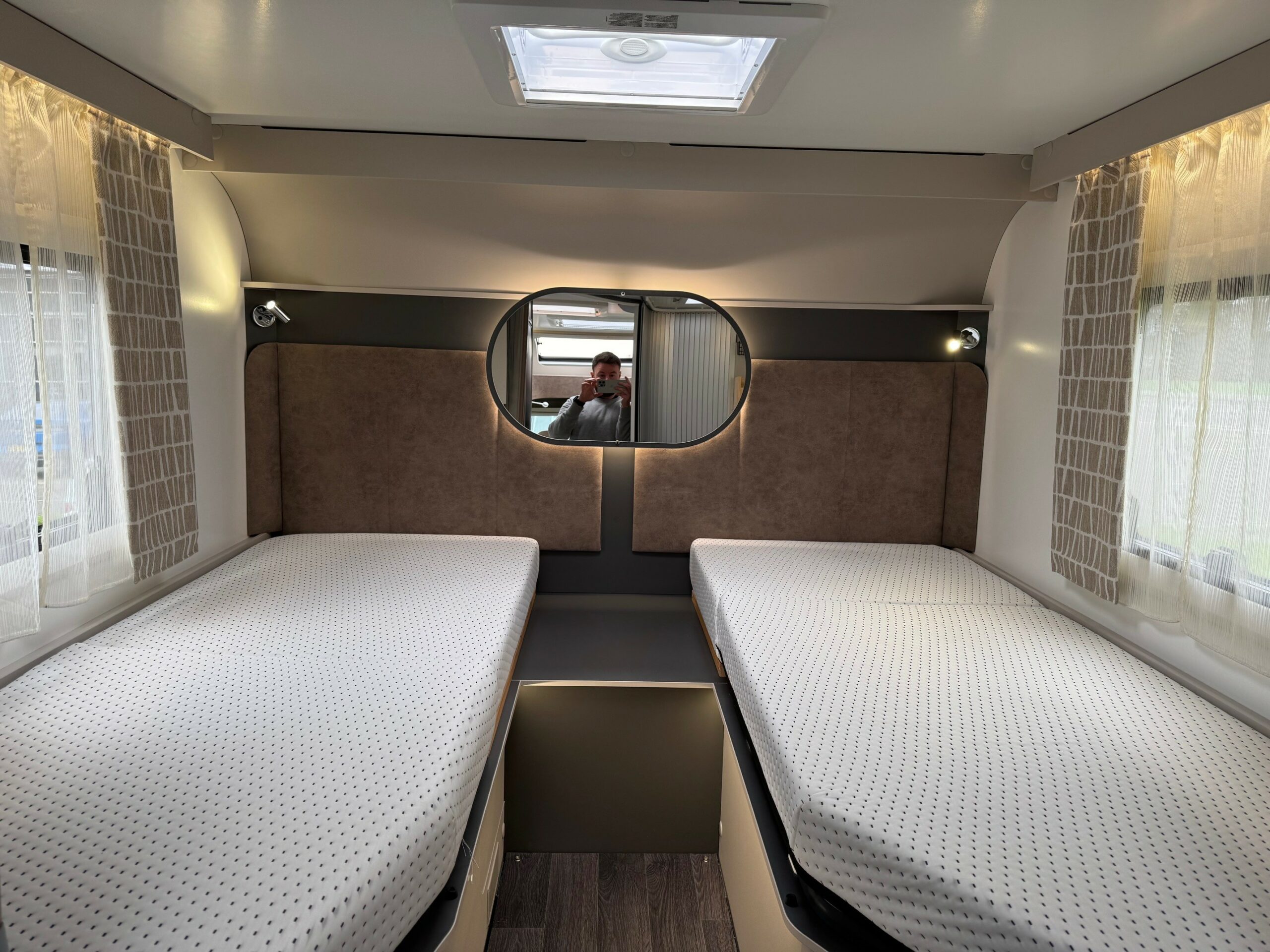 This stunning 4 berth 4 belt low profile with rear single beds over garage. The single beds do also make a very large full double. Wardrobes under each of the beds. Side wash room with sliding shower wall to create a large shower cubicle. The kitchen is very well equipped with, 3 ring gas hob & electric hot plate, large fridge/freezer & oven/grill. Open plan front lounge with 2 side facing bench seats & 2 captains chairs. The lounge then creates a further double bed.