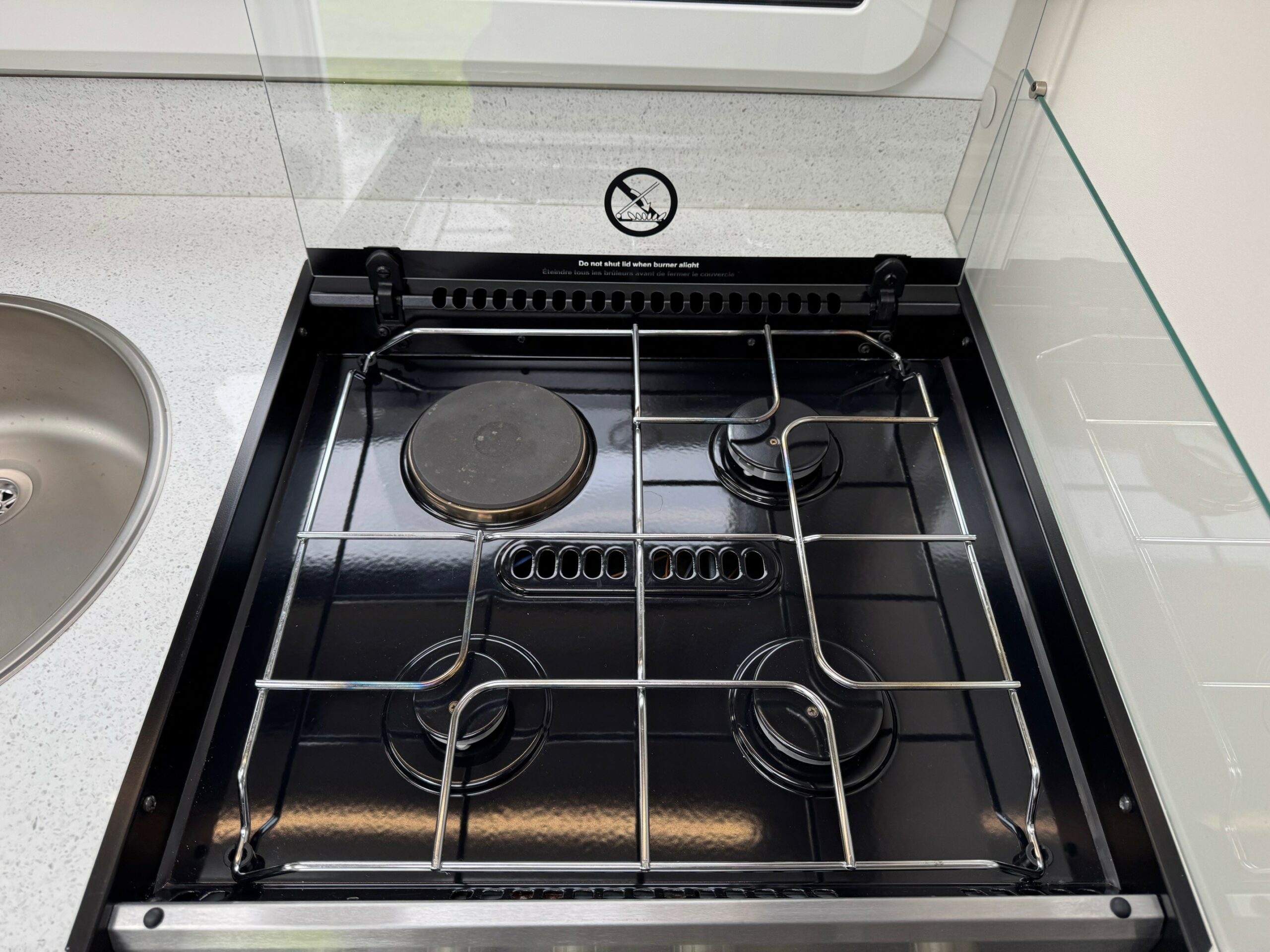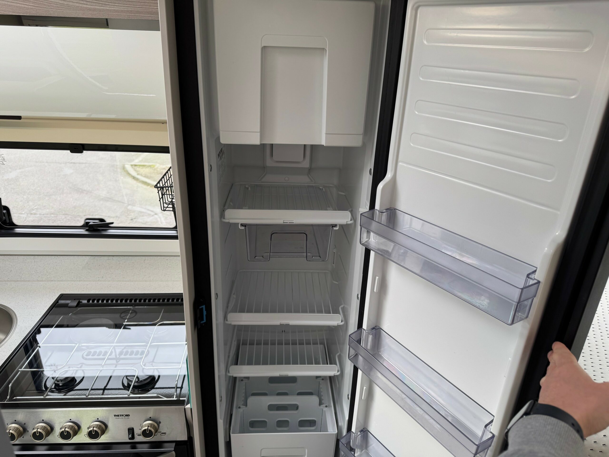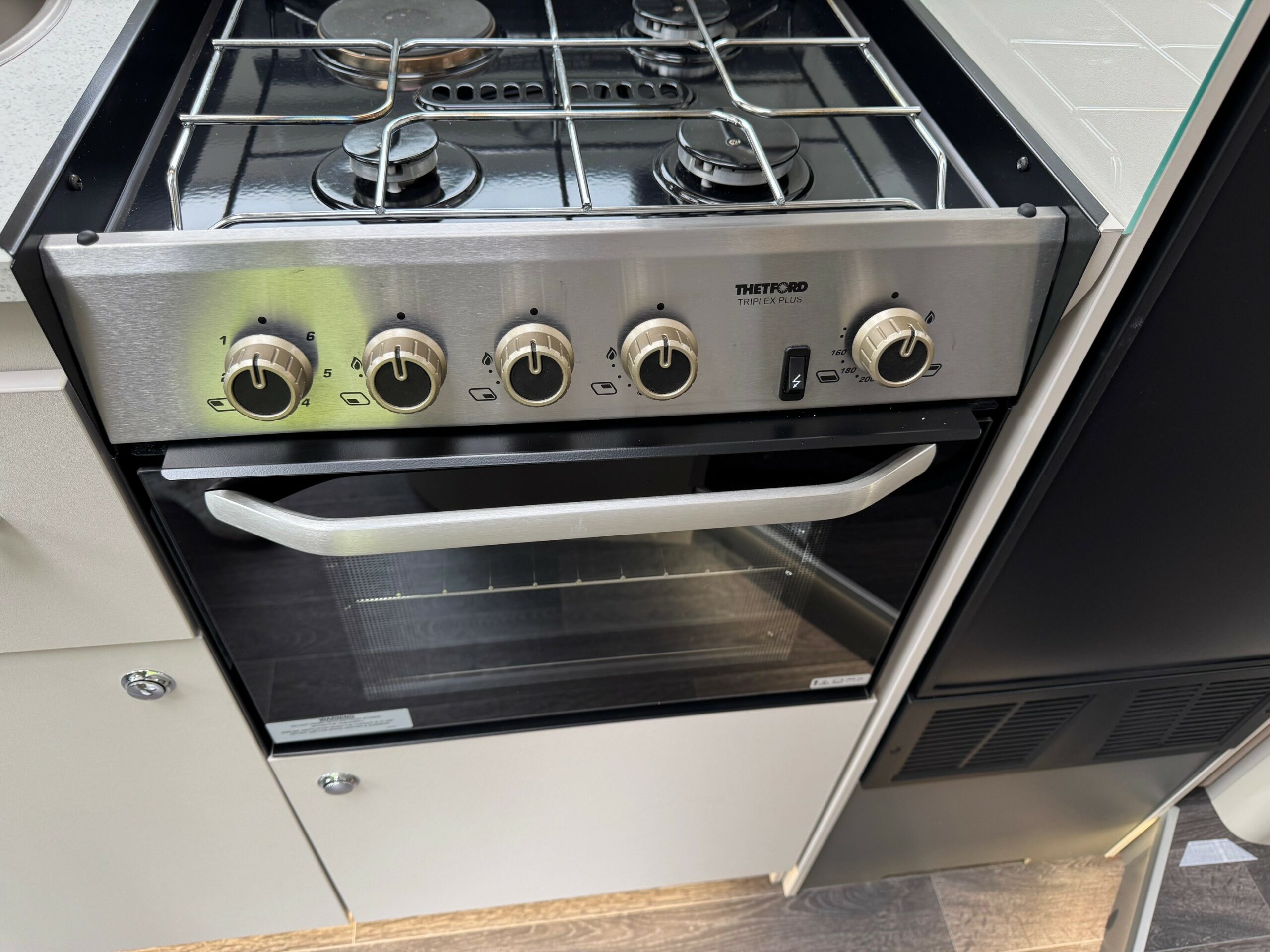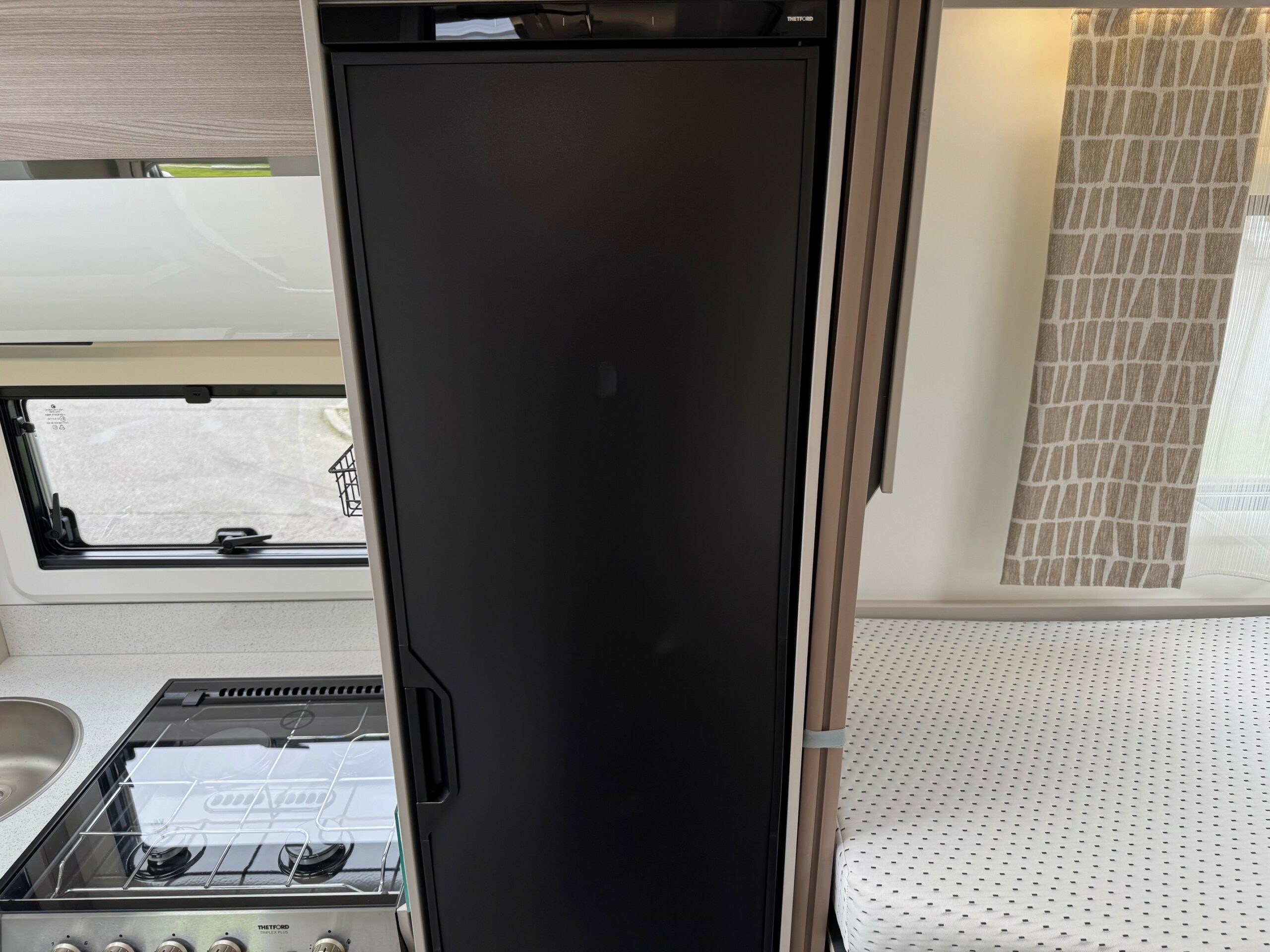 This stunning 4 berth 4 belt low profile with rear single beds over garage. The single beds do also make a very large full double. Wardrobes under each of the beds. Side wash room with sliding shower wall to create a large shower cubicle. The kitchen is very well equipped with, 3 ring gas hob & electric hot plate, large fridge/freezer & oven/grill. Open plan front lounge with 2 side facing bench seats & 2 captains chairs. The lounge then creates a further double bed.