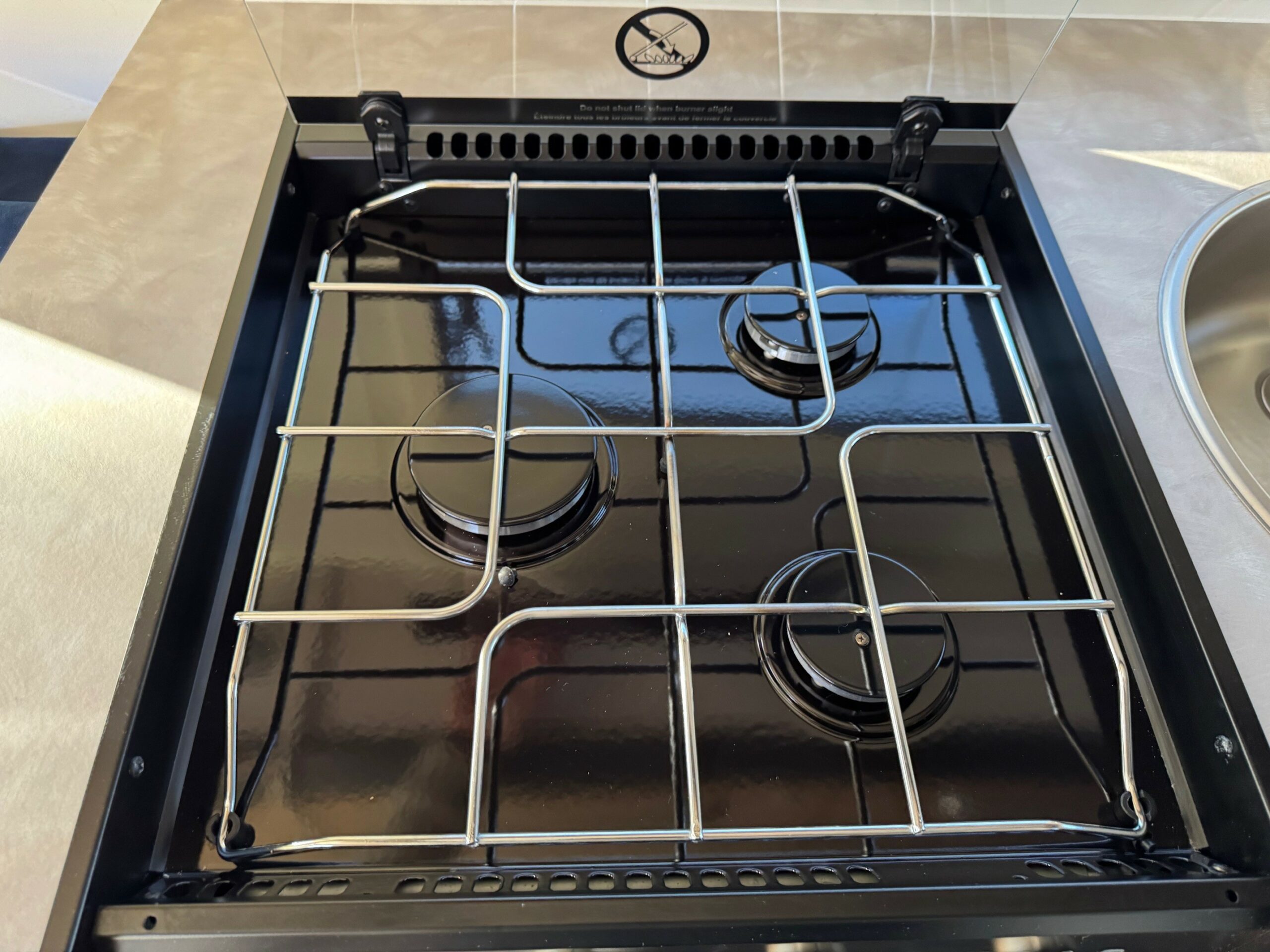 • Fully equipped kitchen with a Thetford 90L compressor fridge, 3-ring gas hob, combination oven, and grill