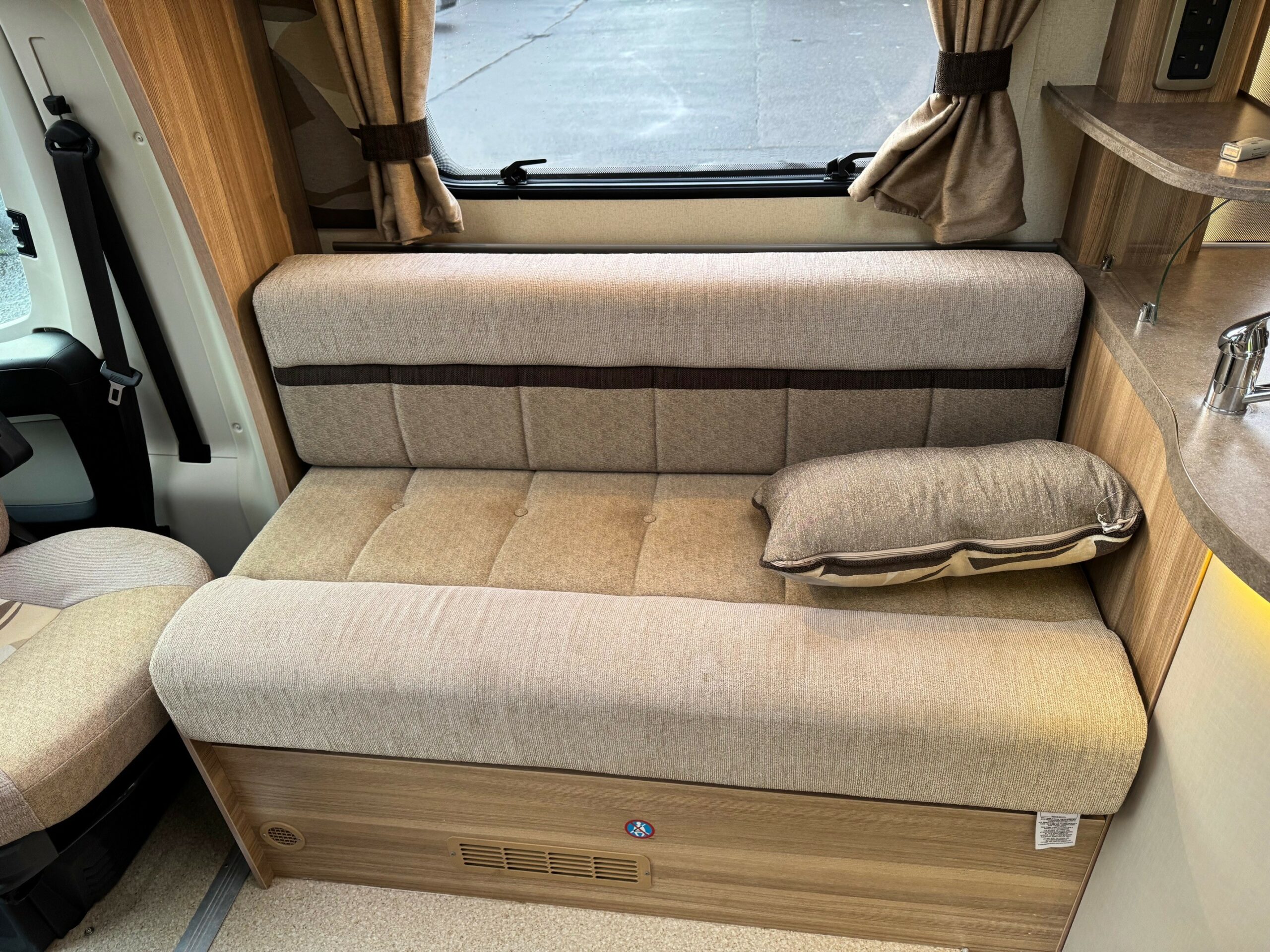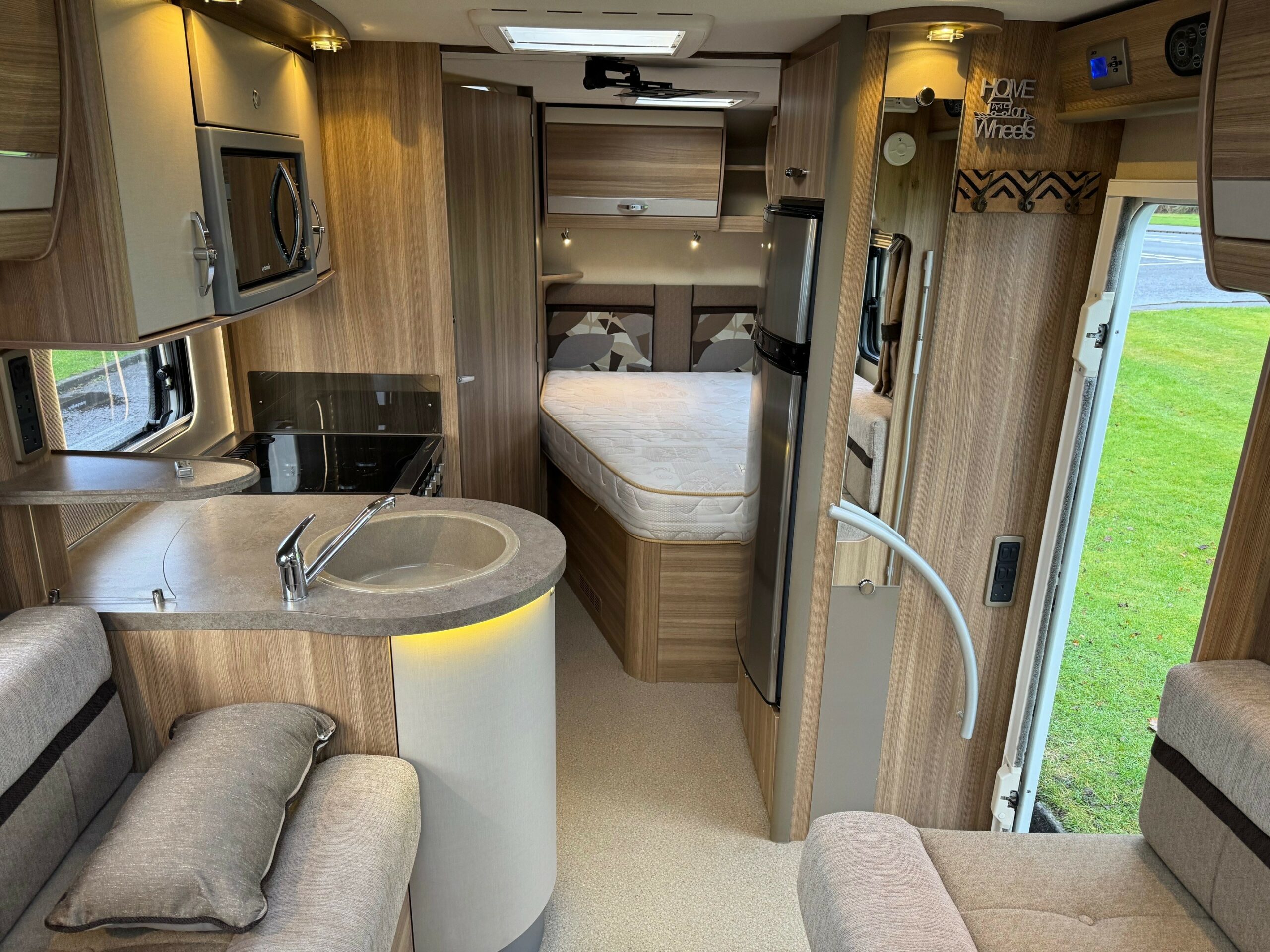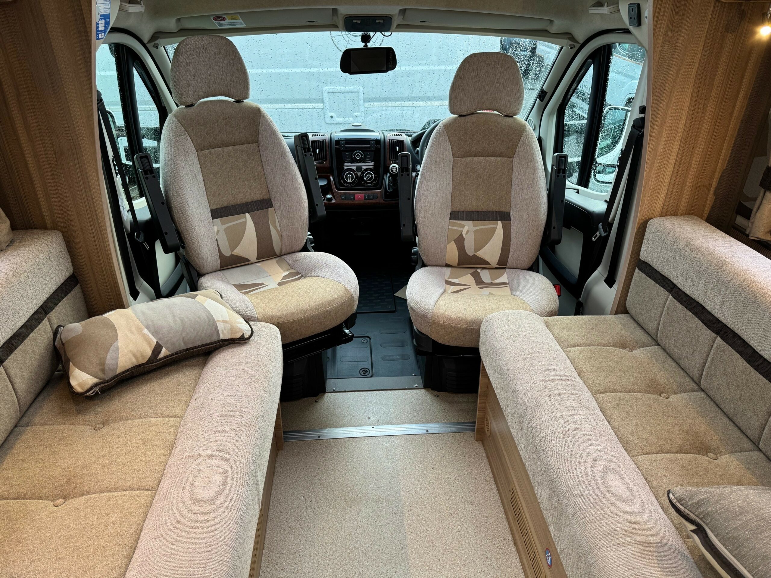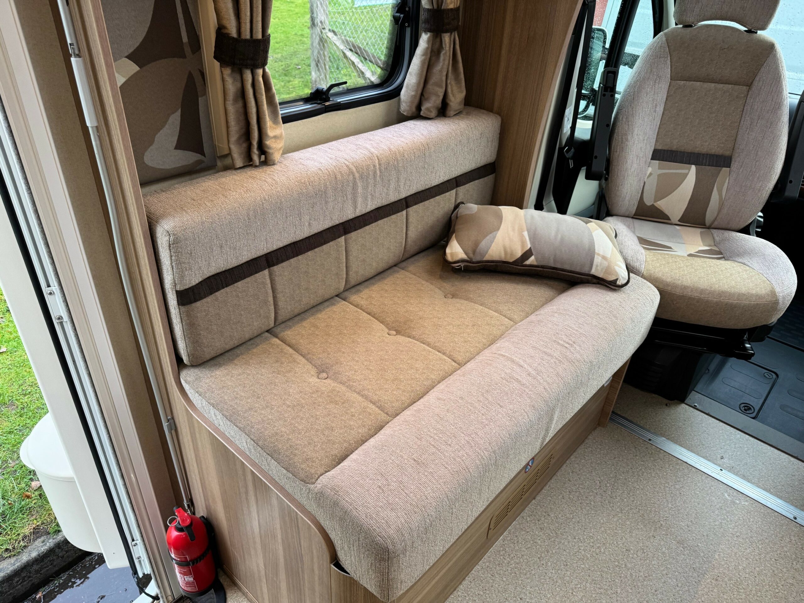 A lovely spacious 4 berth low profile motorhome. Only 7m in length but offering an extremely spacious feel. Rear French bed with storage underneath. Rear side washroom, the configuration allows you to create a separate enclosed shower cubicle. Large Wardrobe. Mid kitchen that has everything you would need for your trips away; microwave, 3 ring gas hob, electric hot plate, oven & separate grill, 165l fridge/freezer. The front lounge has 2 bench seats & 2 captains chairs. The lounge also creates a large double bed.