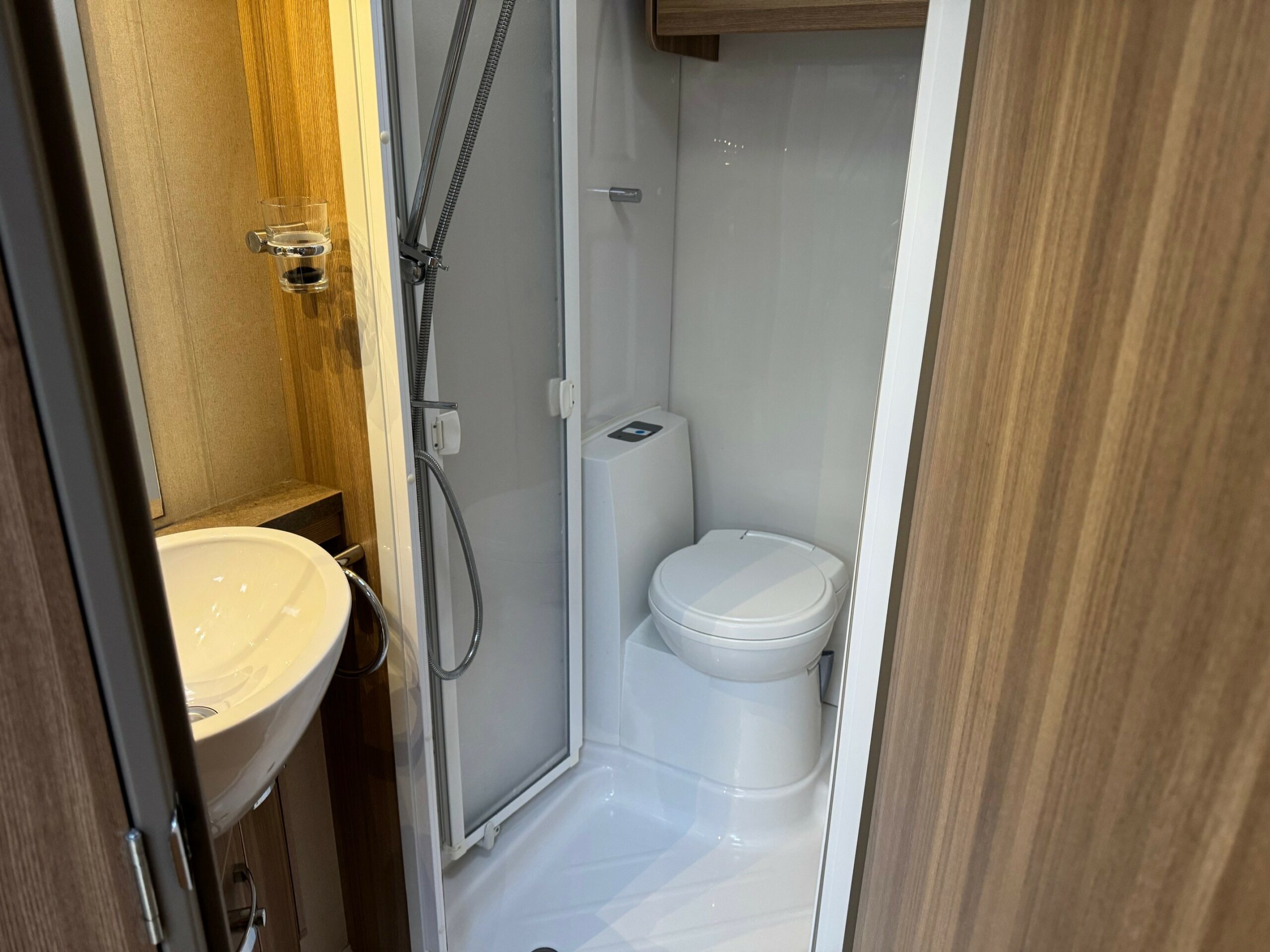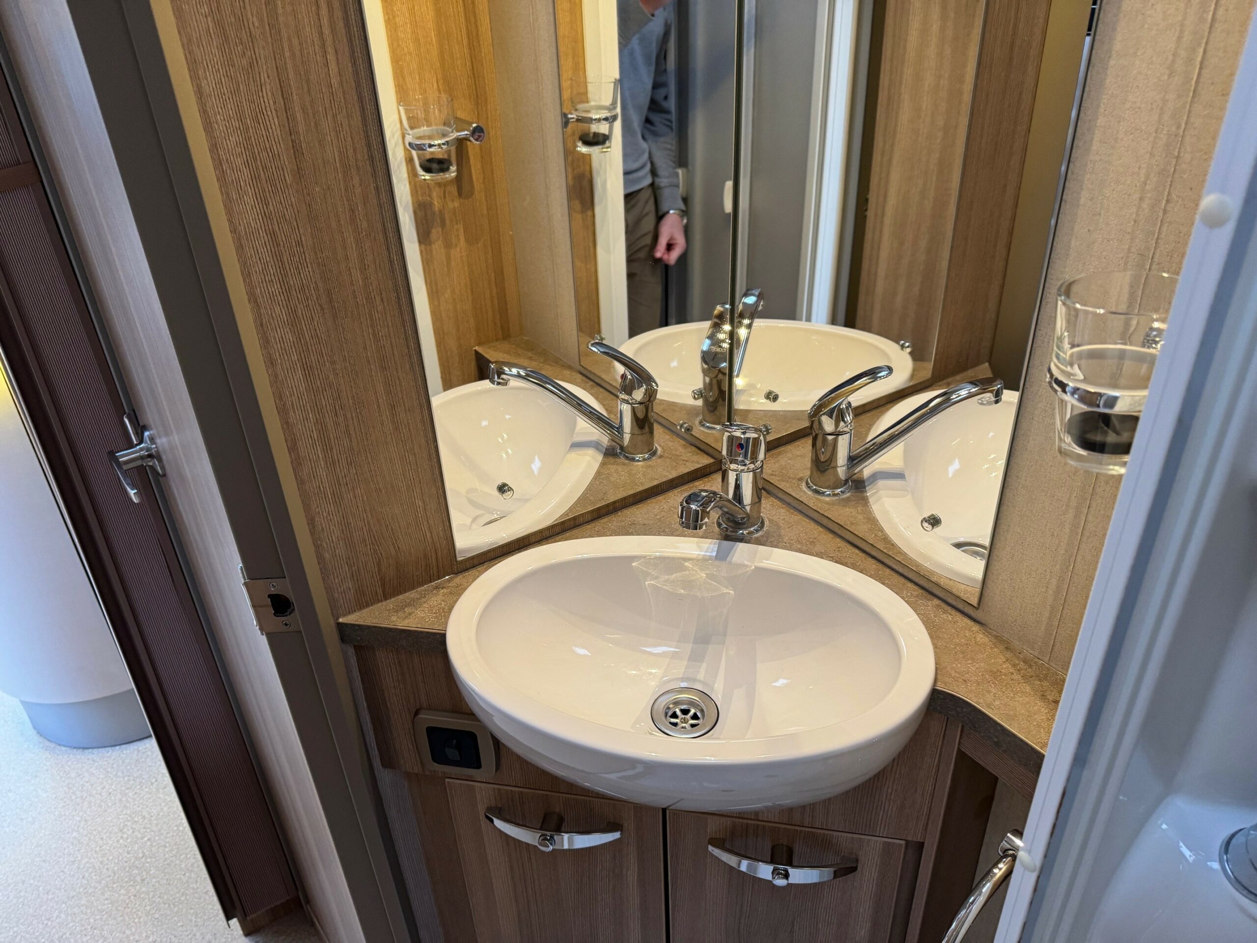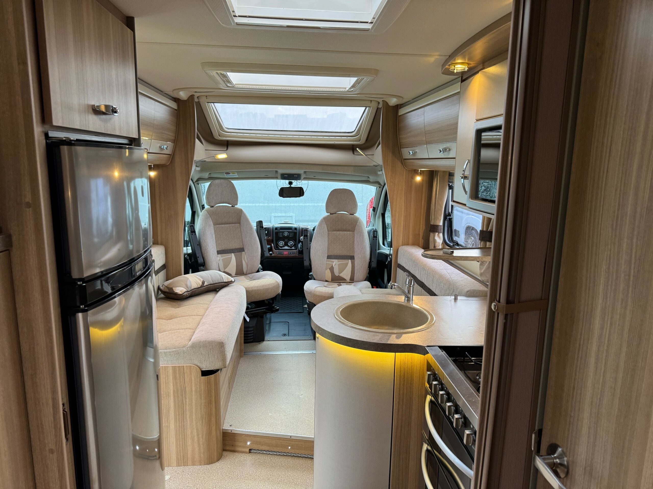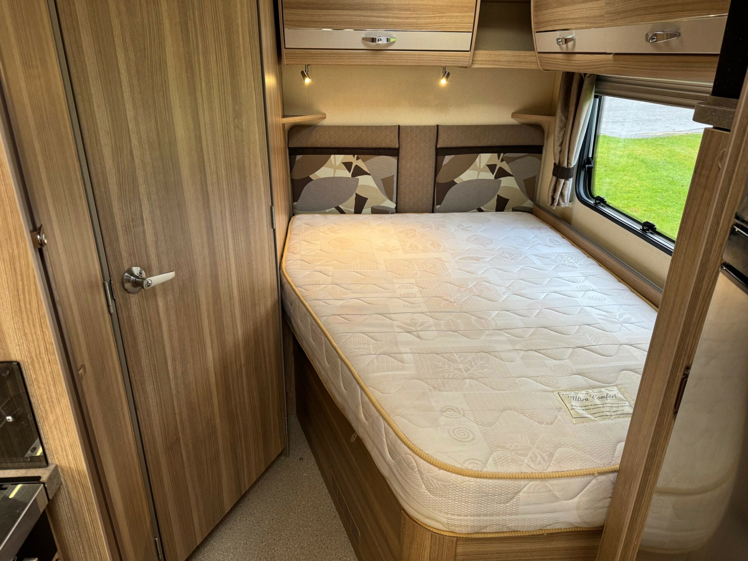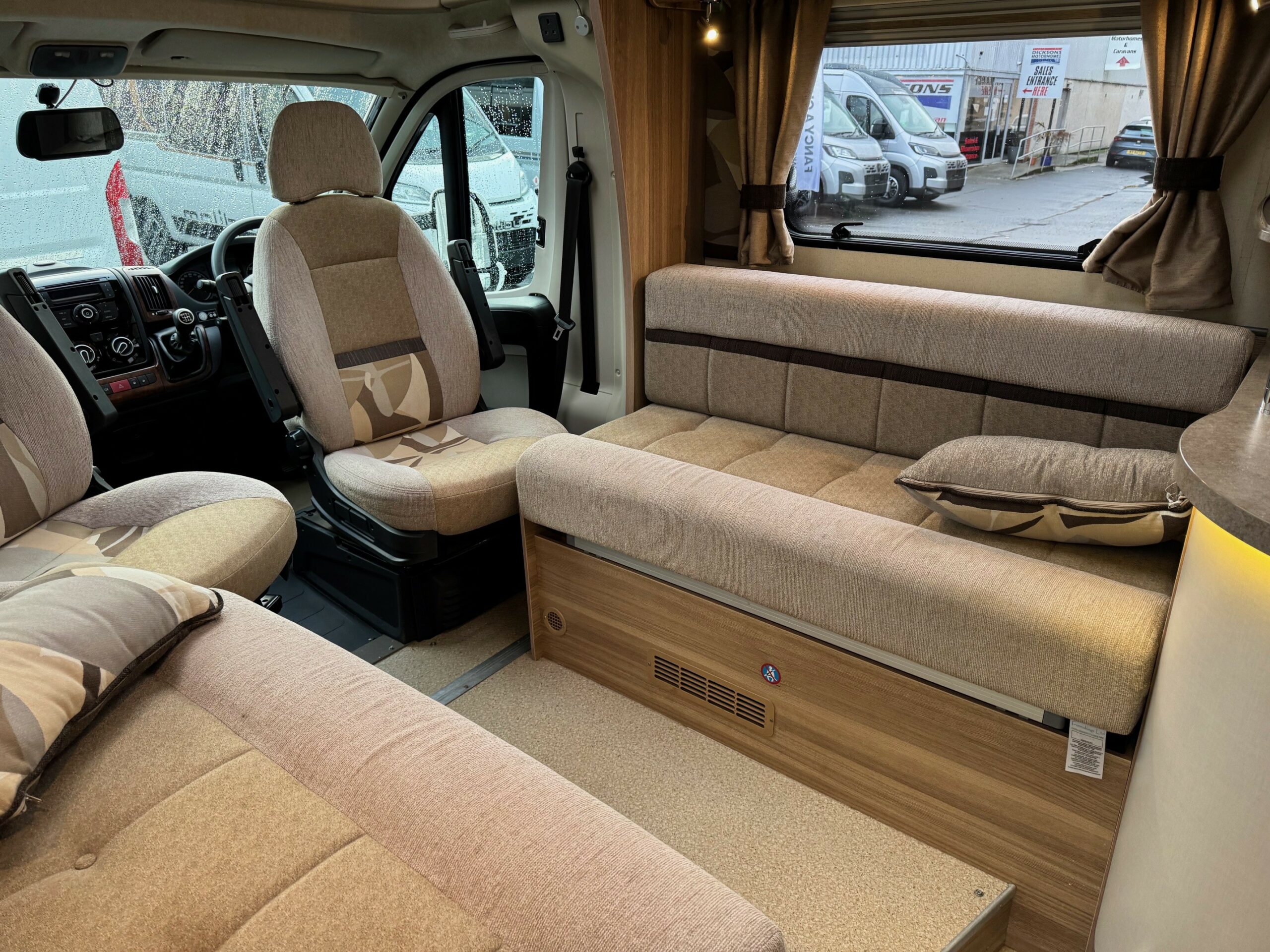 A lovely spacious 4 berth low profile motorhome. Only 7m in length but offering an extremely spacious feel. Rear French bed with storage underneath. Rear side washroom, the configuration allows you to create a separate enclosed shower cubicle. Large Wardrobe. Mid kitchen that has everything you would need for your trips away; microwave, 3 ring gas hob, electric hot plate, oven & separate grill, 165l fridge/freezer. The front lounge has 2 bench seats & 2 captains chairs. The lounge also creates a large double bed.