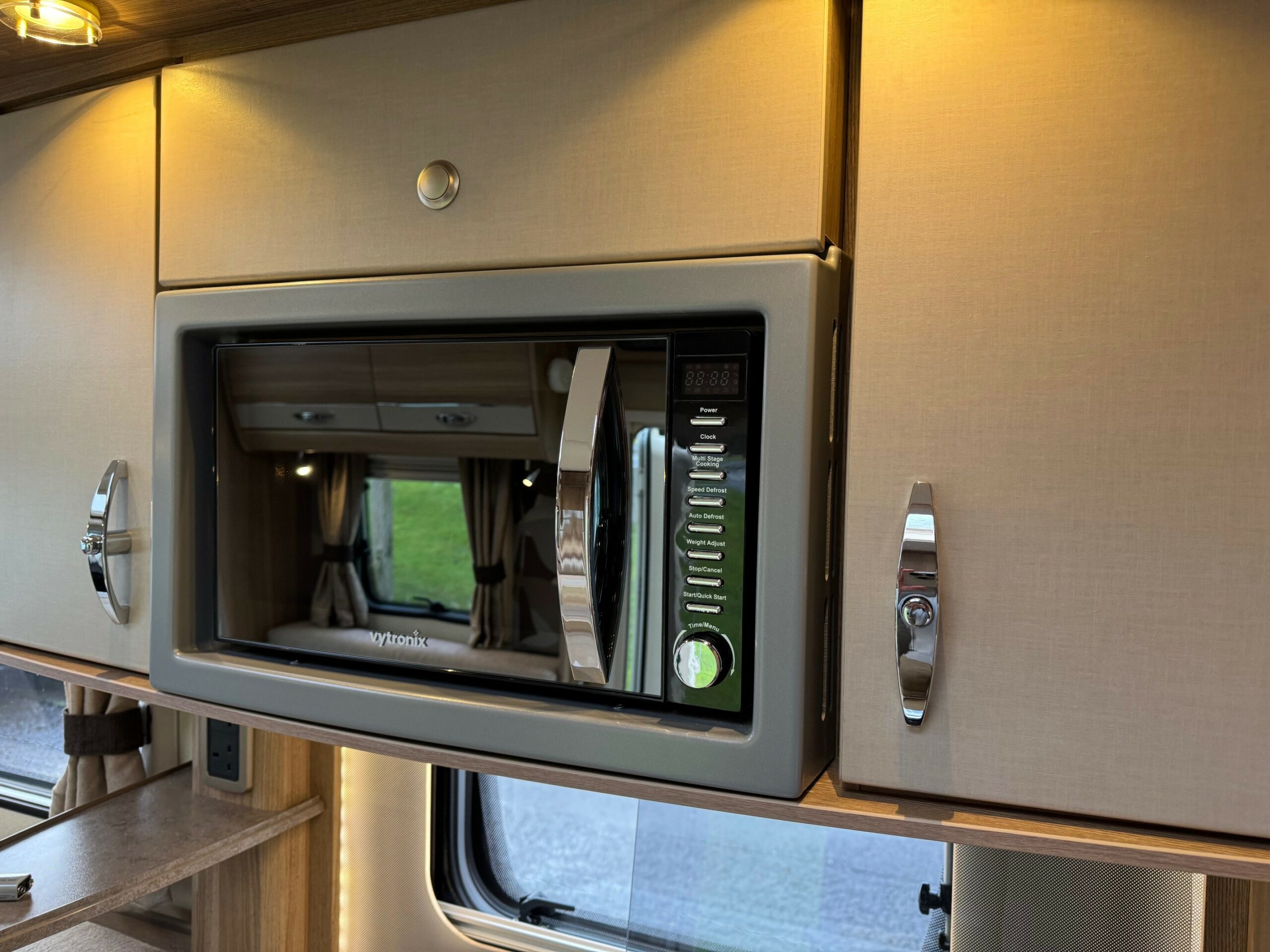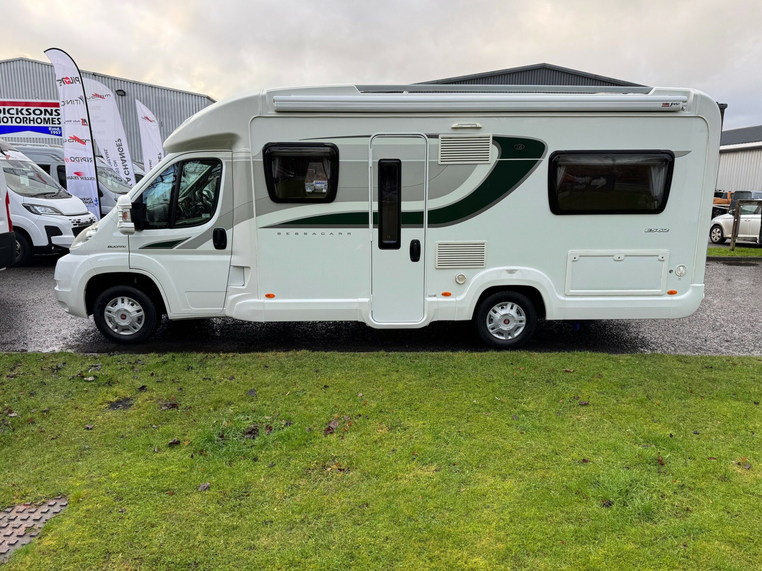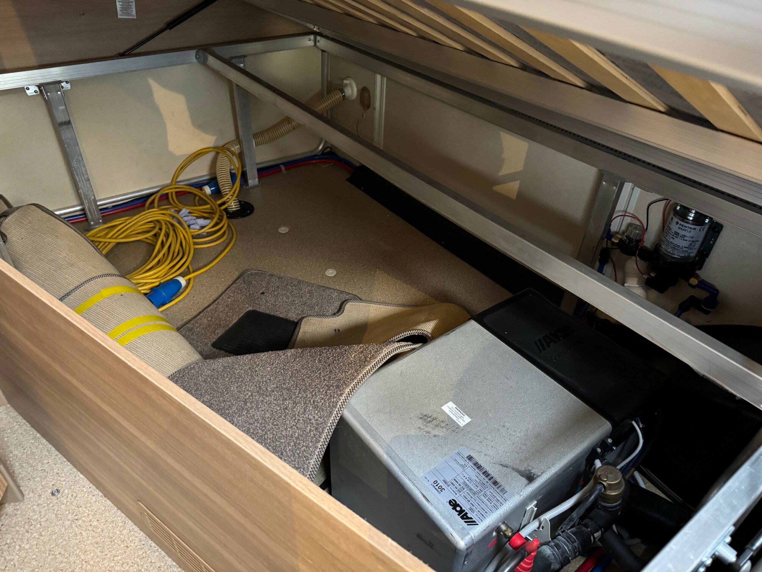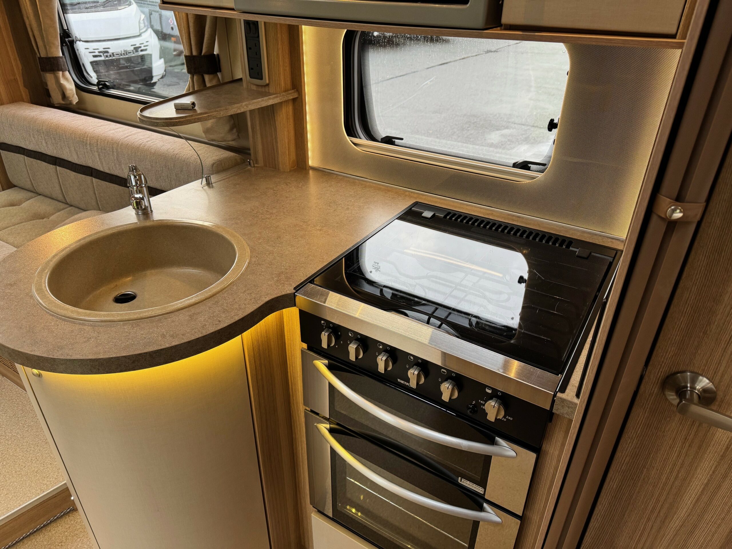 A lovely spacious 4 berth low profile motorhome. Only 7m in length but offering an extremely spacious feel. Rear French bed with storage underneath. Rear side washroom, the configuration allows you to create a separate enclosed shower cubicle. Large Wardrobe. Mid kitchen that has everything you would need for your trips away; microwave, 3 ring gas hob, electric hot plate, oven & separate grill, 165l fridge/freezer. The front lounge has 2 bench seats & 2 captains chairs. The lounge also creates a large double bed.