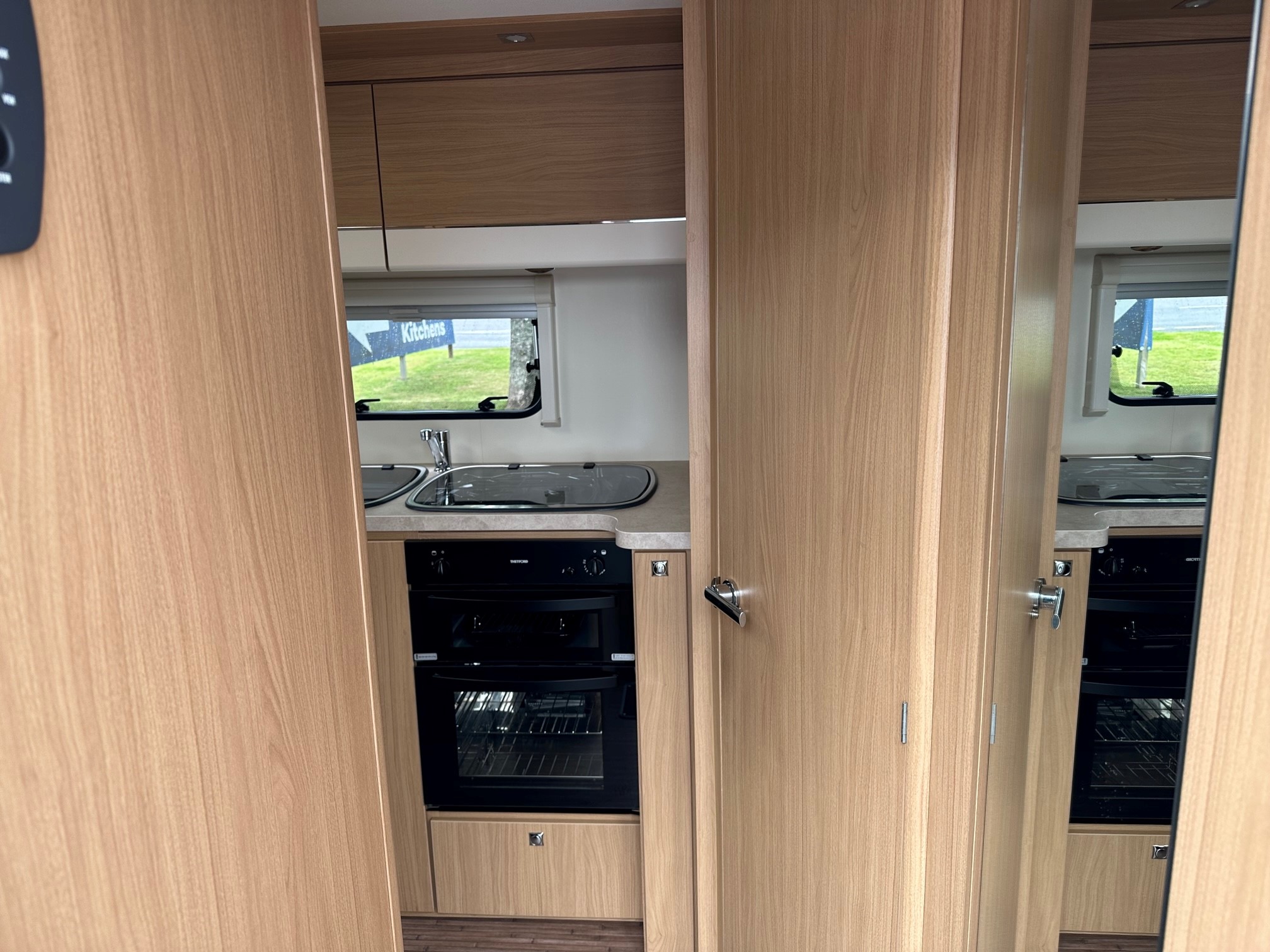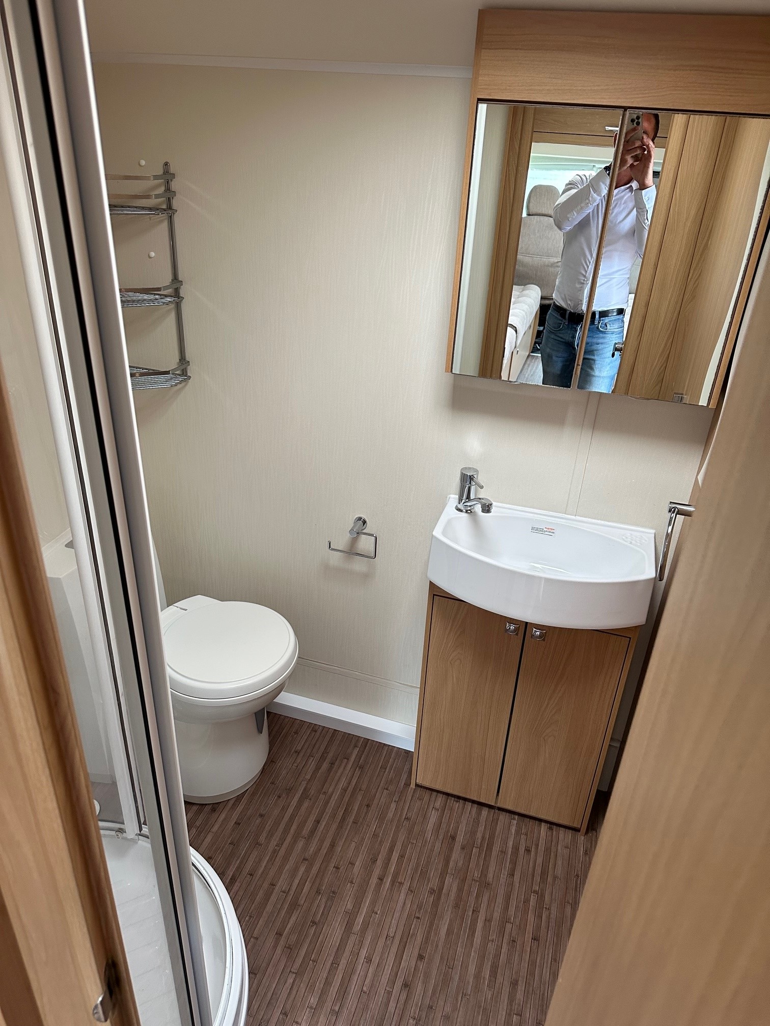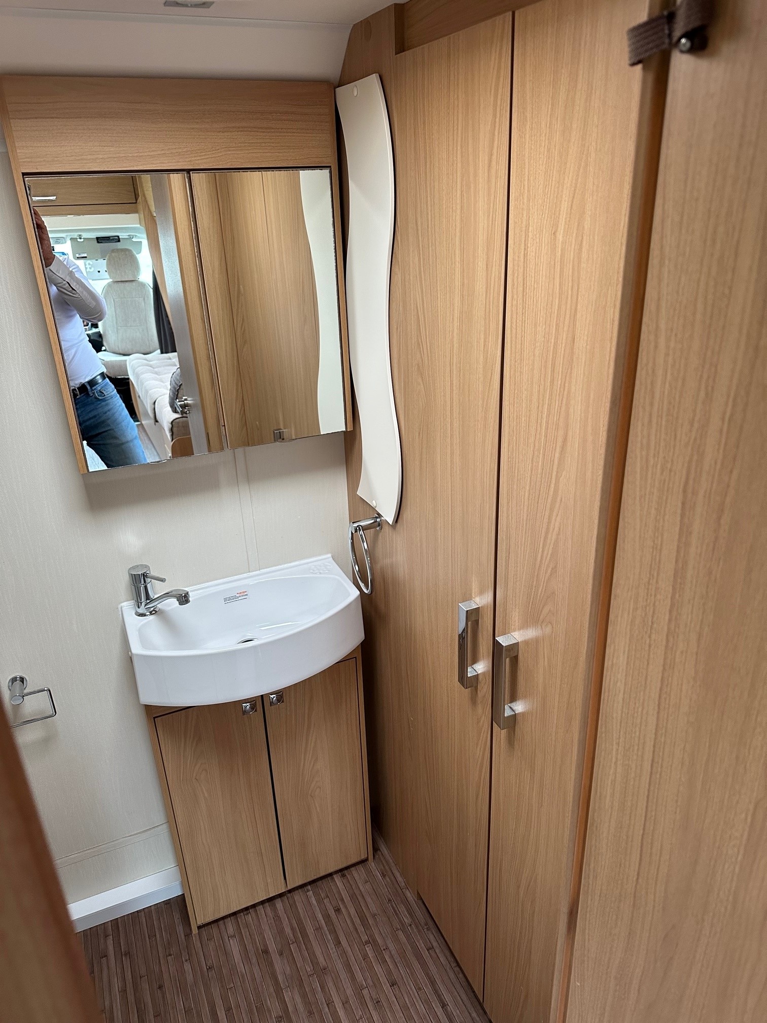- Showstopper Rear Washroom:Â A full-width end bathroom including a separate walk-in shower cubicle, vanity unit, cassette toilet, and a large double-hanging wardrobe.