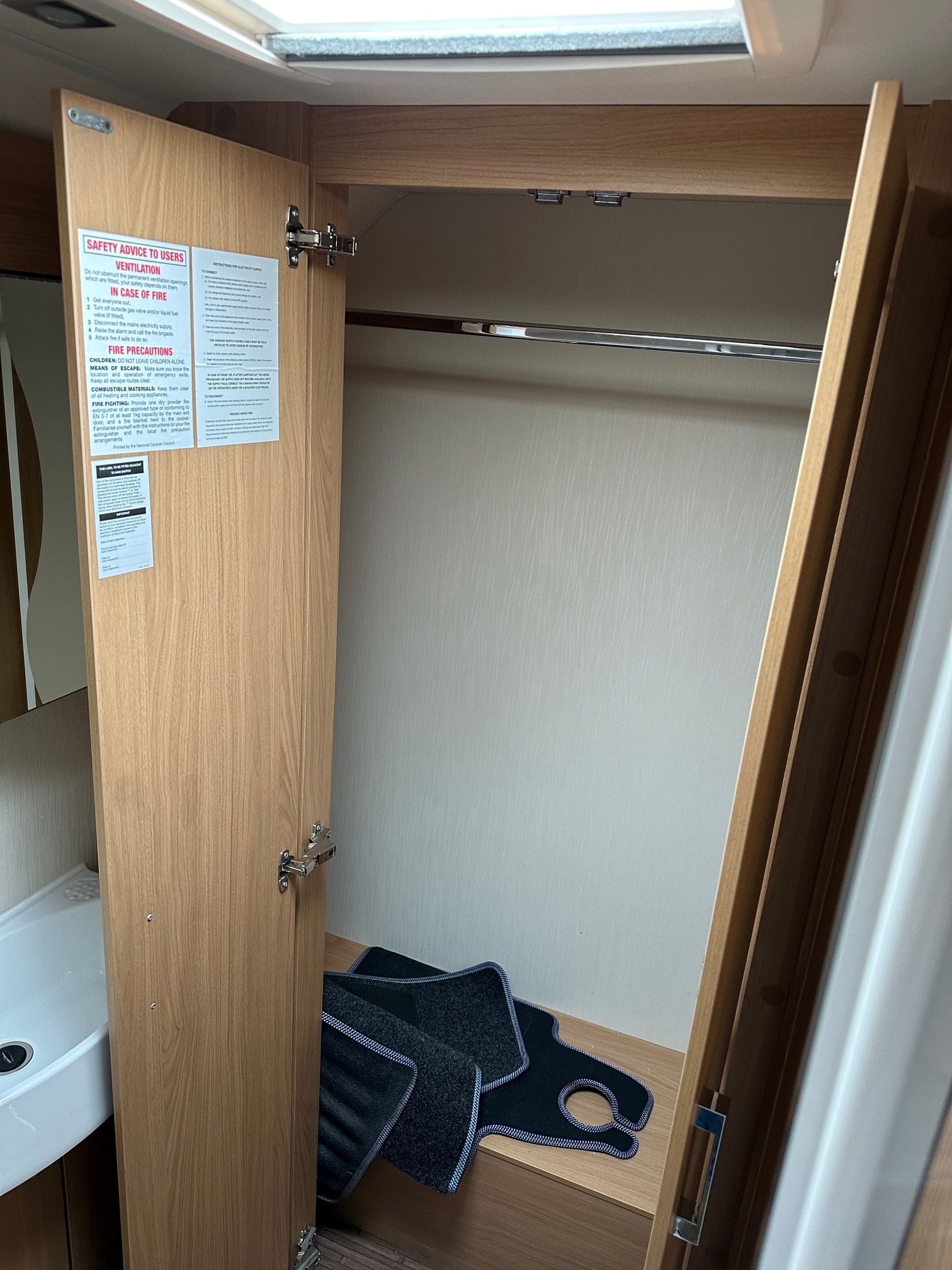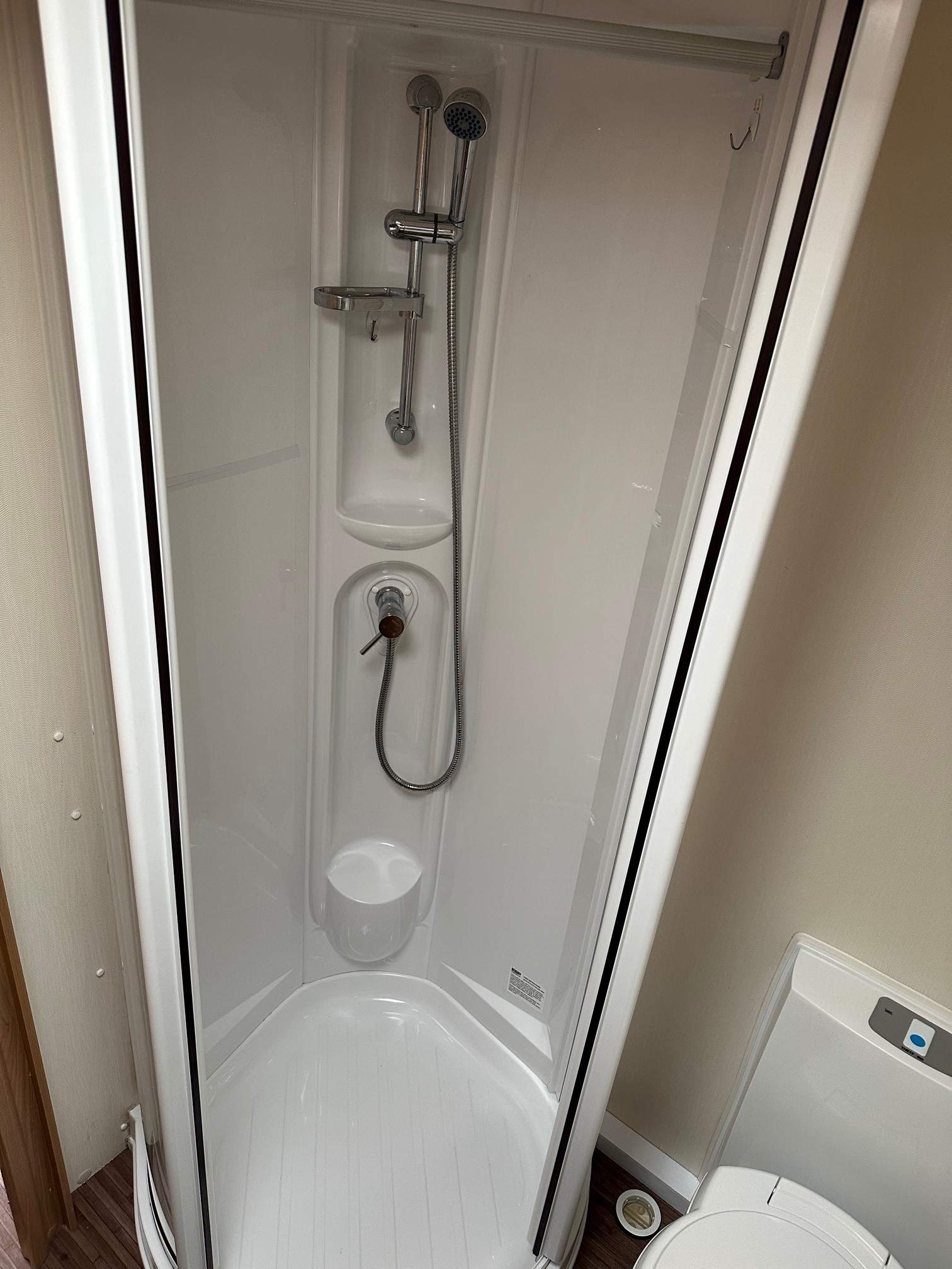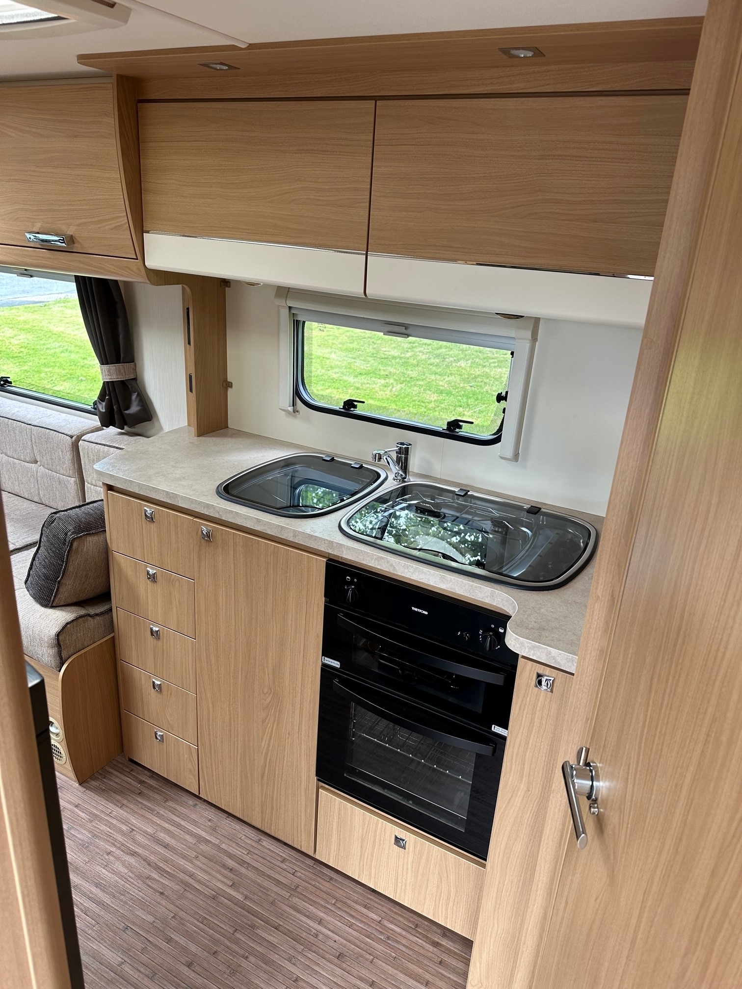 - Showstopper Rear Washroom:Â A full-width end bathroom including a separate walk-in shower cubicle, vanity unit, cassette toilet, and a large double-hanging wardrobe.