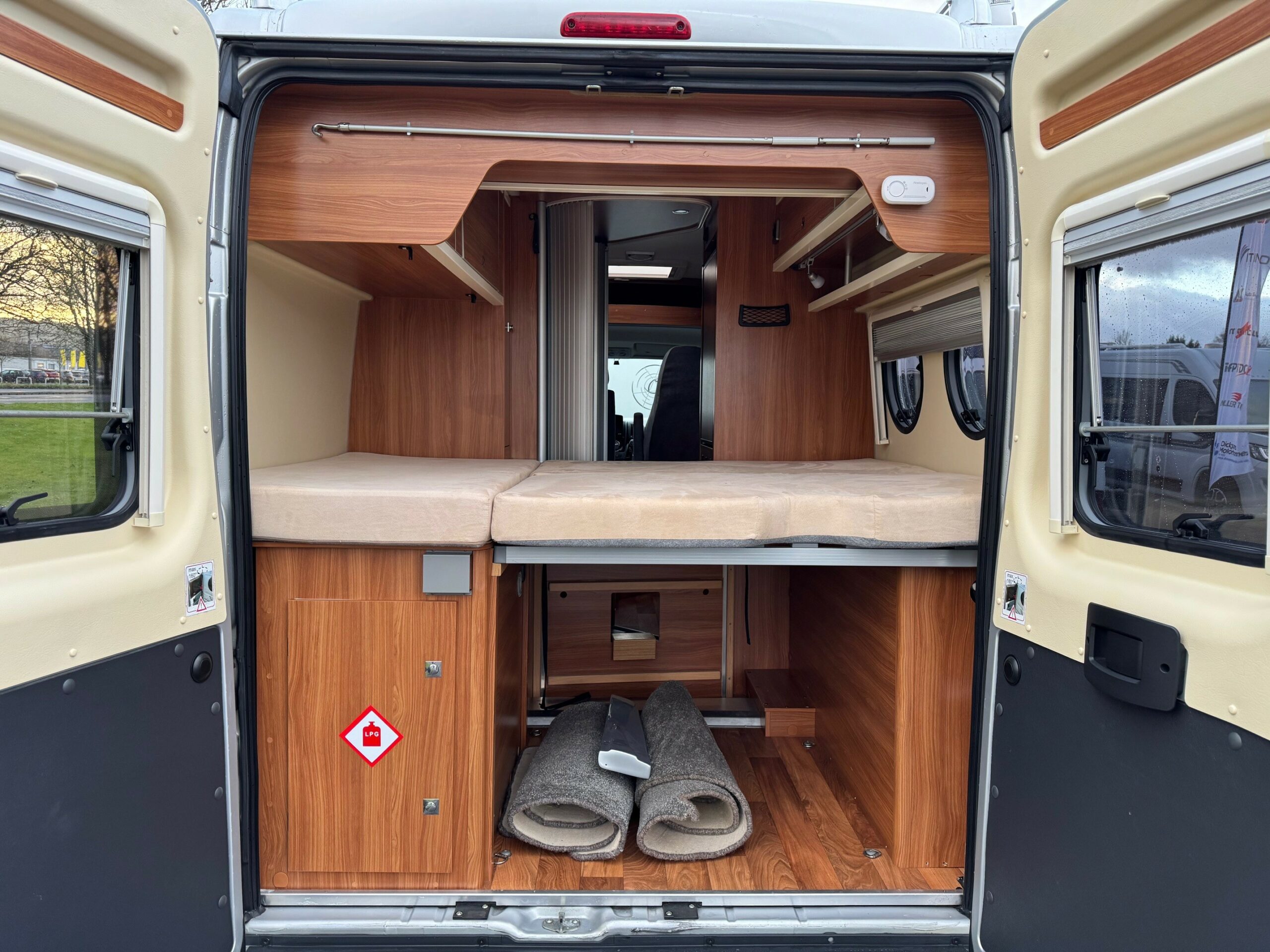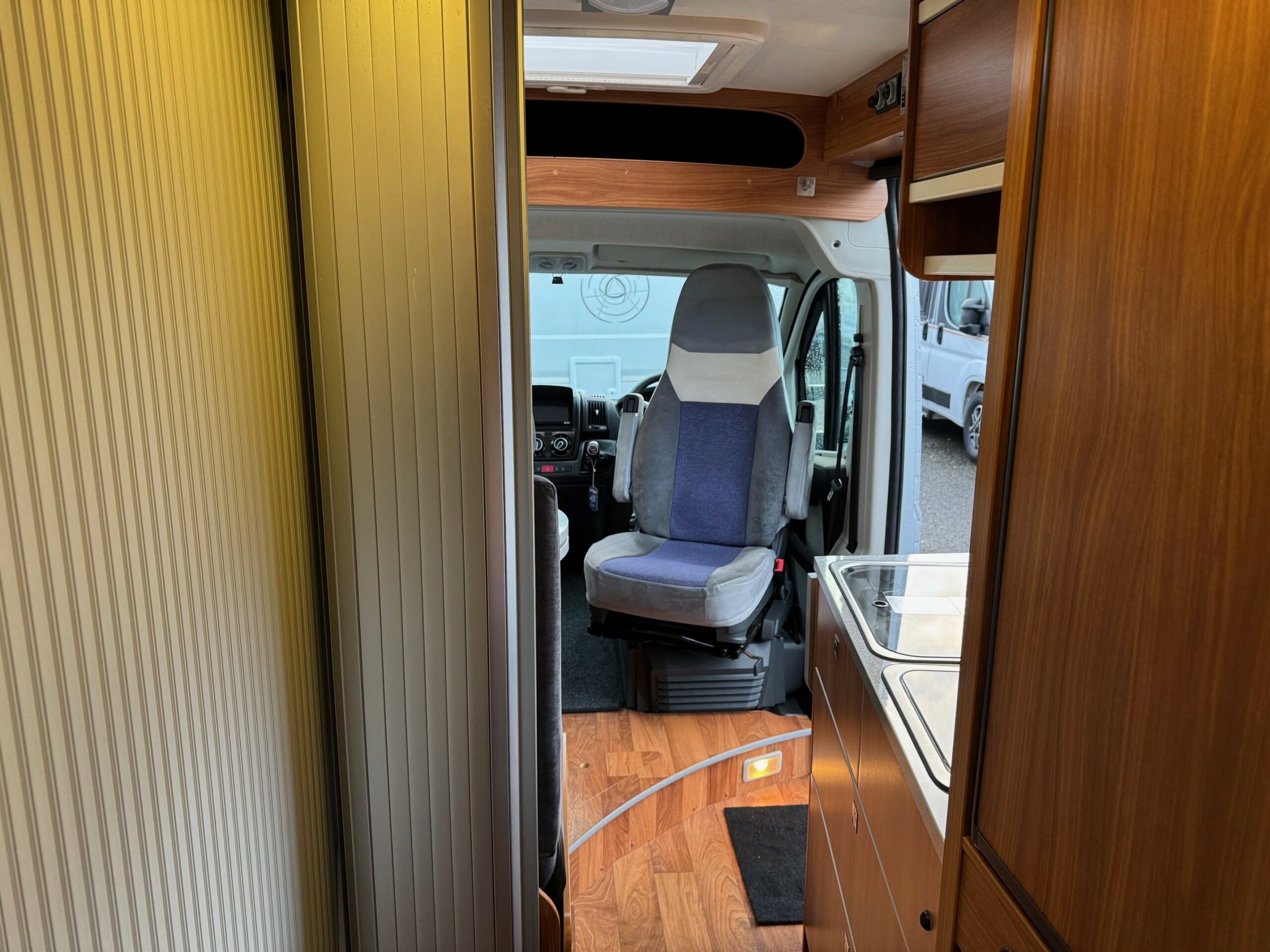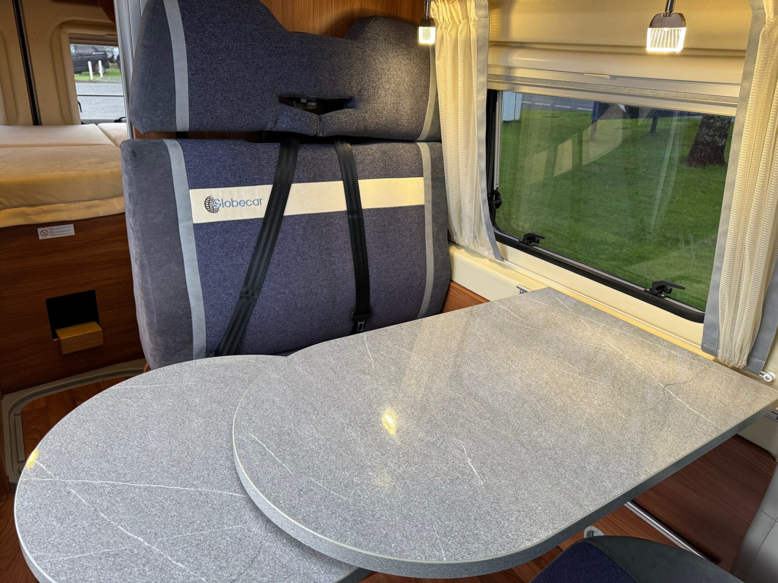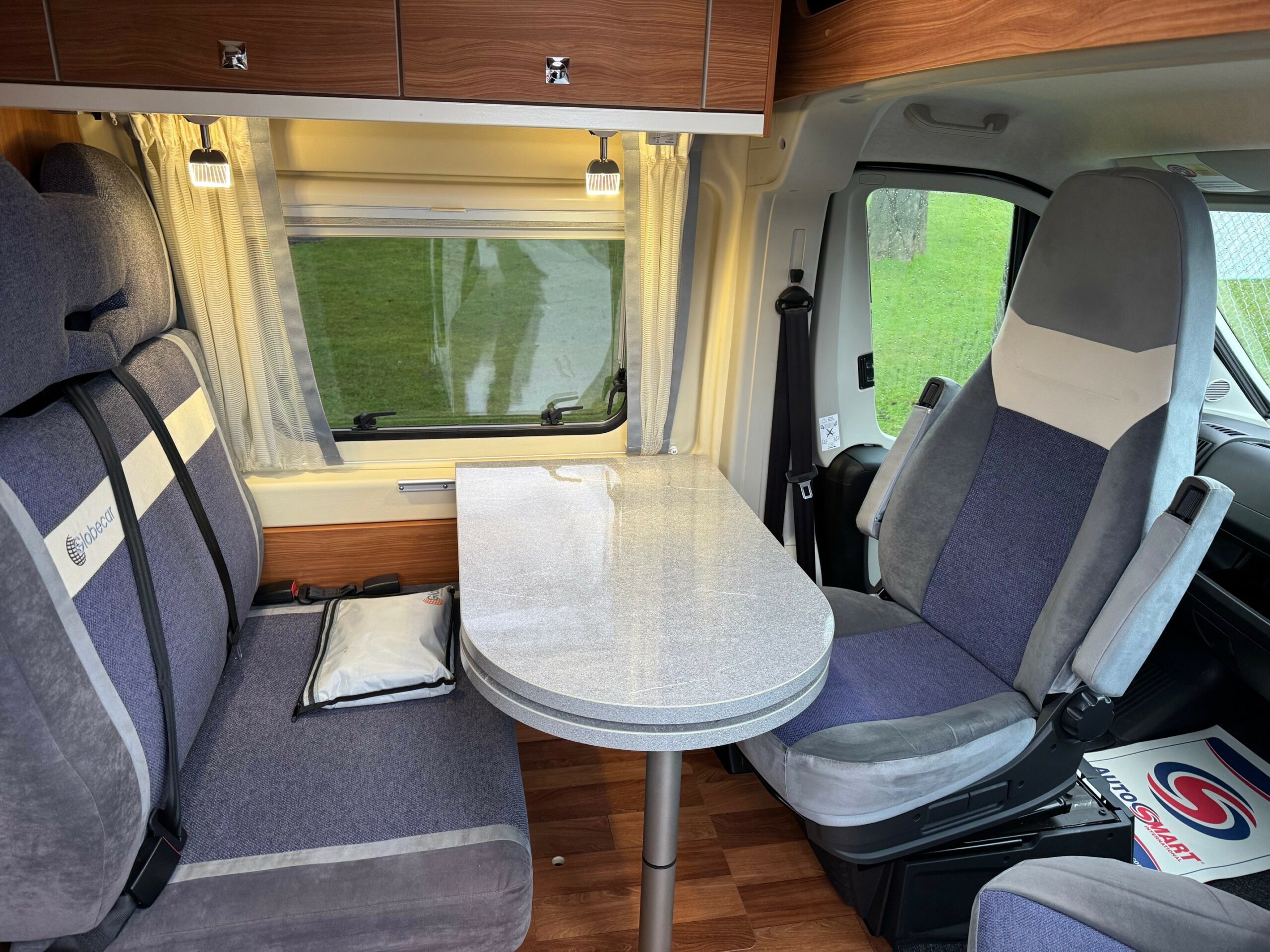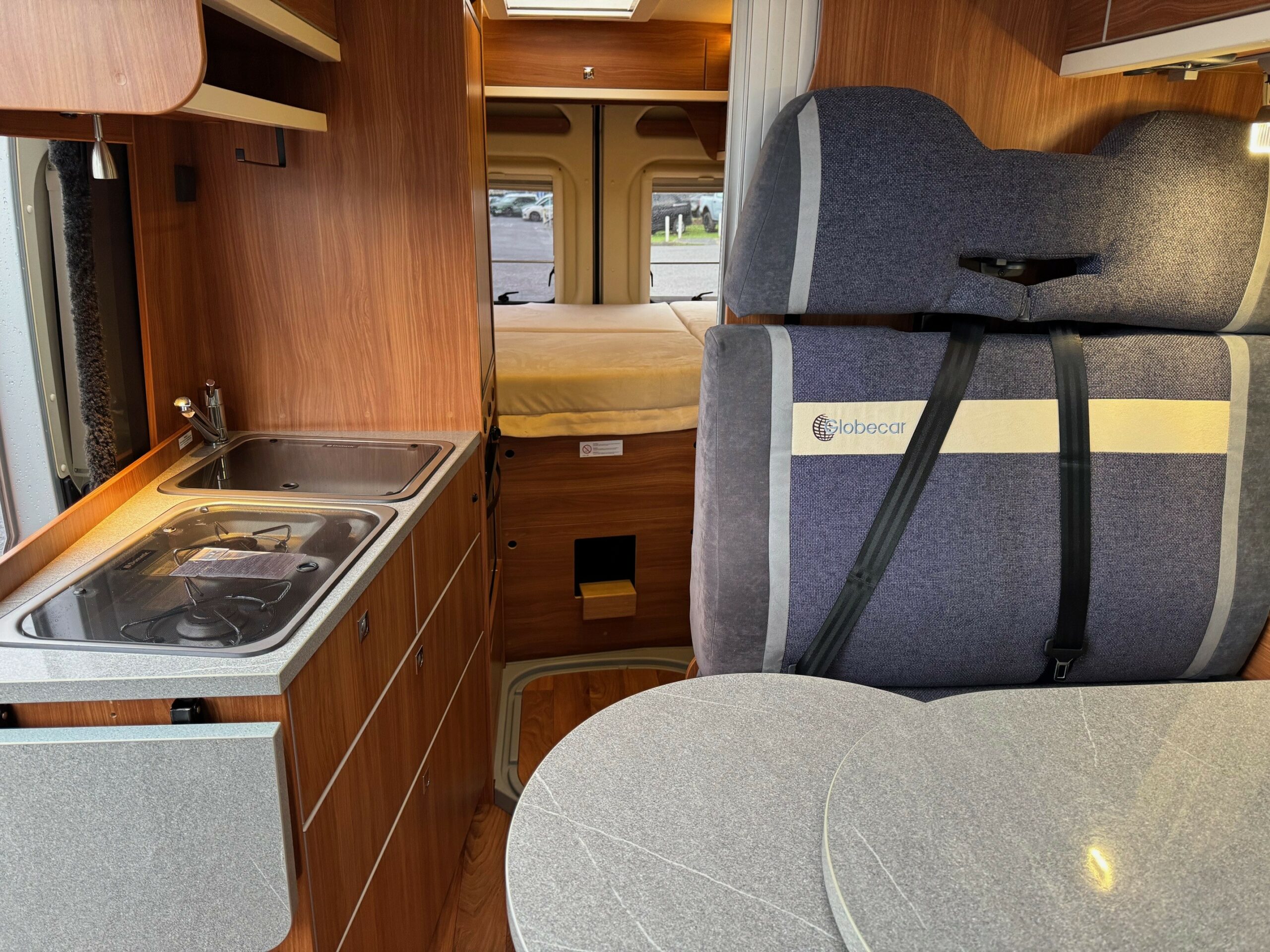 This is a real head turner of a campervan with German build quality. Sub 6m. 4 belted travelling seats. Rear transverse fixed bed with lots of storage underneath. Mid washroom with the clever Globecar washroom enabling to create a fully enclosed shower cubicle. Large fridge/freezer, 2 ring gas hob & oven/grill. Front lounge/dining area with extendable table, 2 captains chairs and forward facing seats.