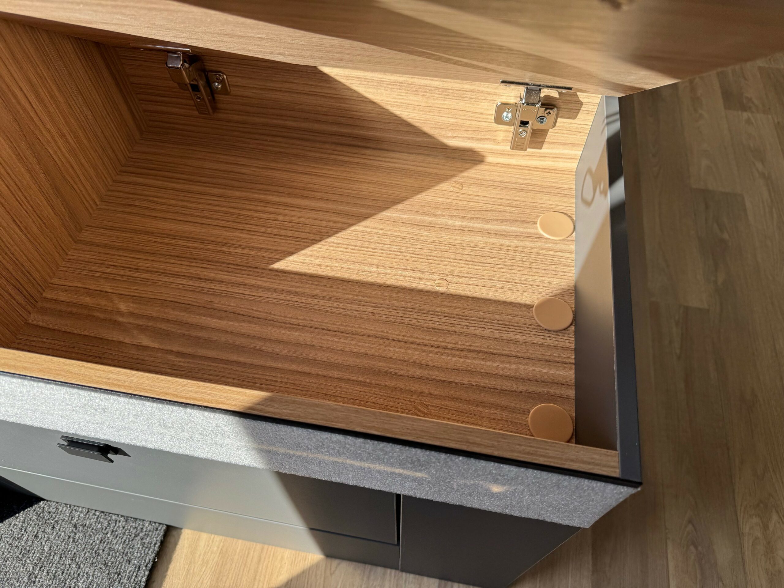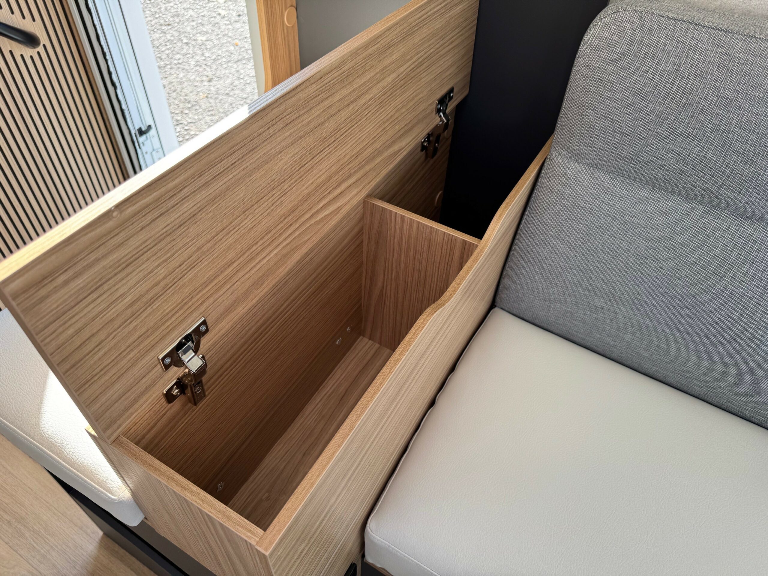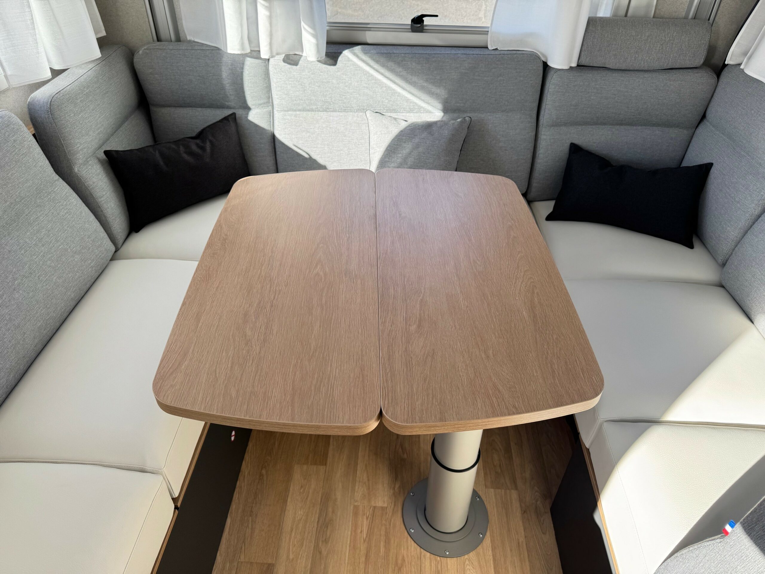 The popular P720U has a superb layout that consists of an XL rear U-Shaped lounge. The wrap around lounge offers comfortable seating for up to 8 people. There is a folding table to give ample space for everyone to dine in comfort. The table also drops down to form the base for the lower bed. Above there is an electronic drop down bed that does come all the way down to seat height. The kitchen is well appointed with gas hob, 36l oven/grill, kompressor fridge/freezer, built in waste bin & lots of storage. To the front of the vehicle is the clever shower room/toilet. Separate shower cubicle. Huge amounts of storage that can also be accessed from and external storage locker. The shower room can be closed off from the cab along with forming a large dressing room.