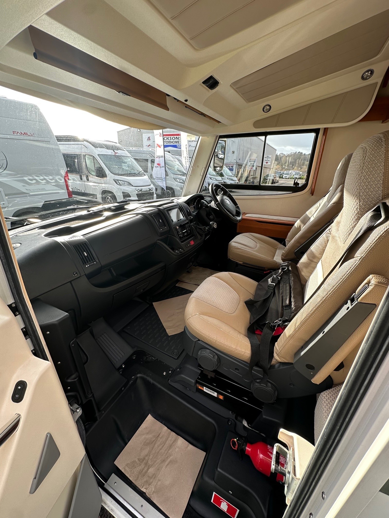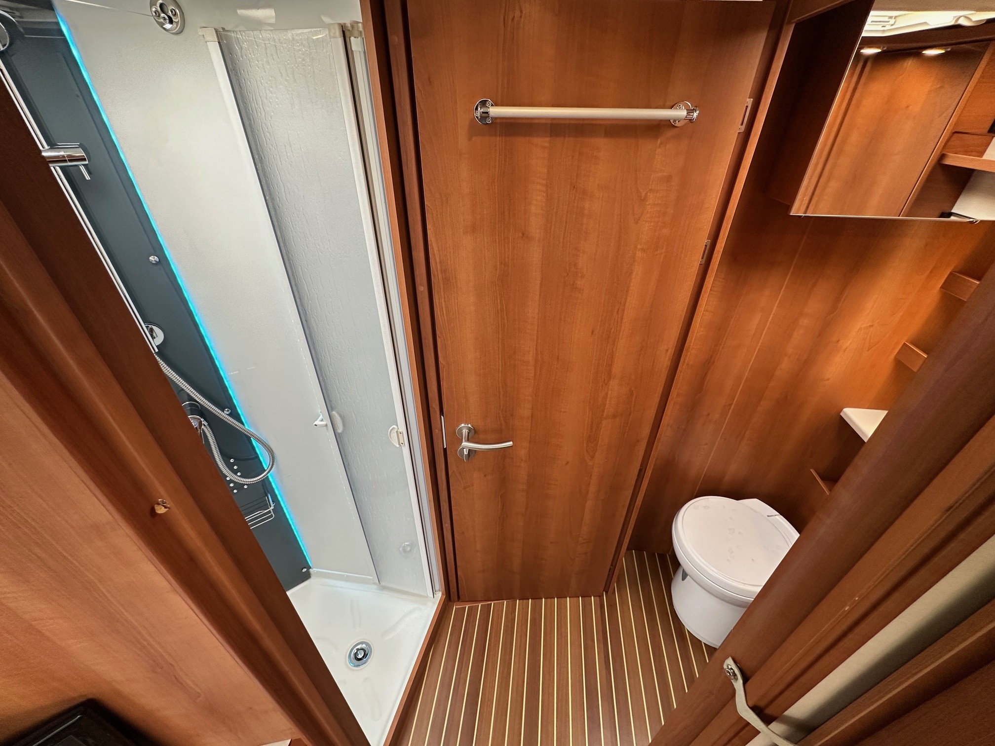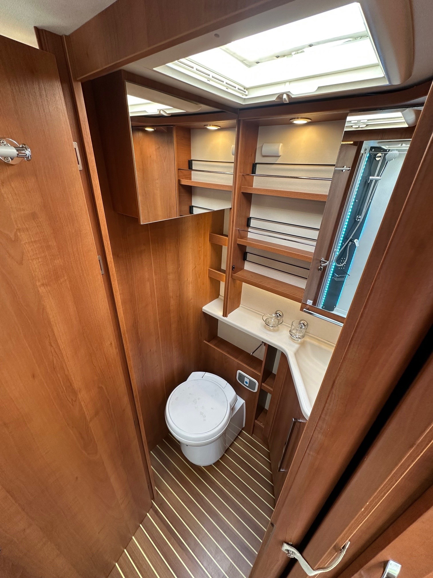 If there’s one thing that tells you this is a conventional A-class with a rear lounge replacing a bedroom it’s the washroom. Standing just forward of said lounge it would normally serve a bedroom in more usual models. So we have ablutions that are en suite to the lounge. Daft? Well not really, as the lounge easily converts into a bedroom, with a big, flat, comfortable transverse double, so it all works well.