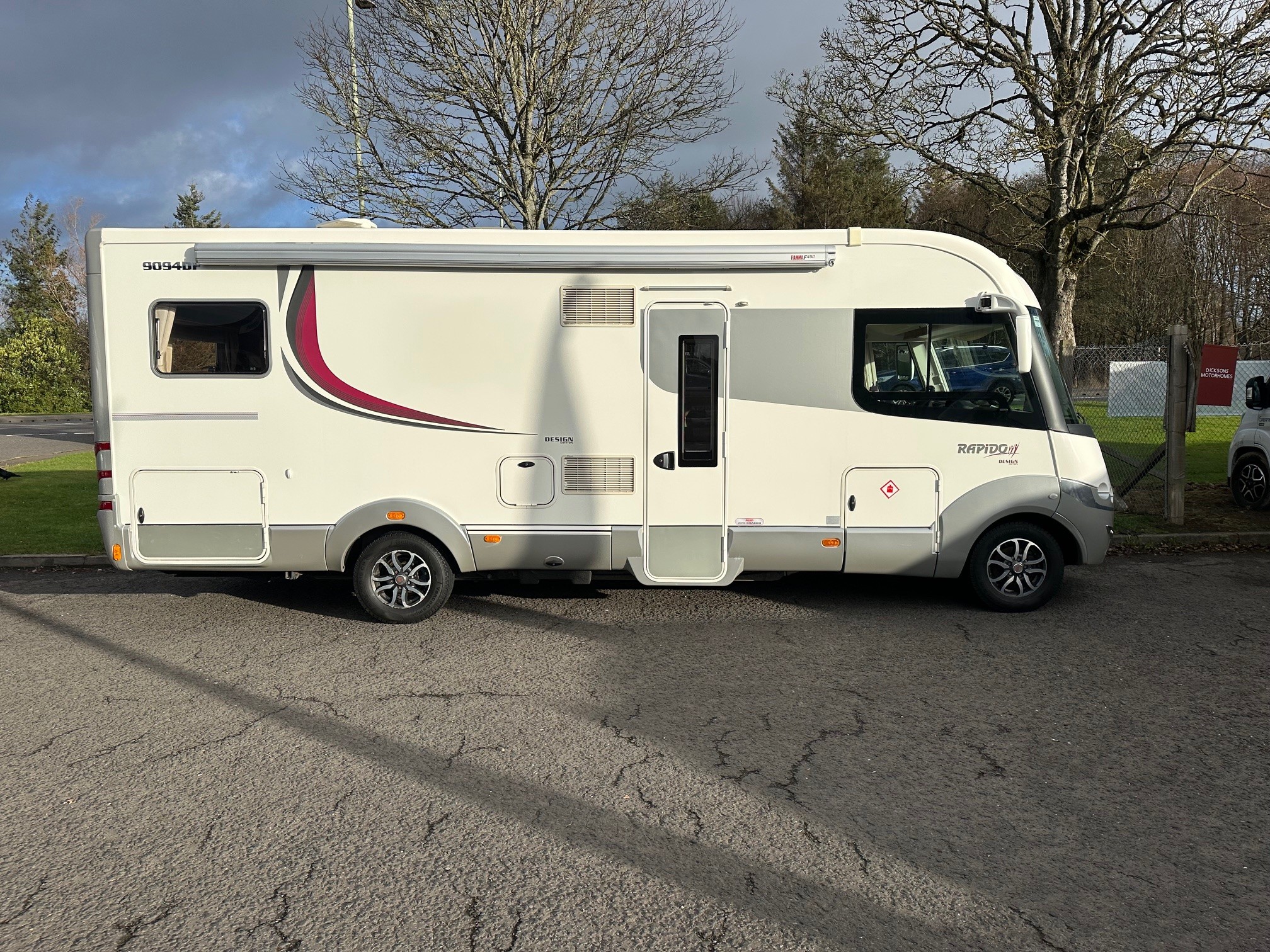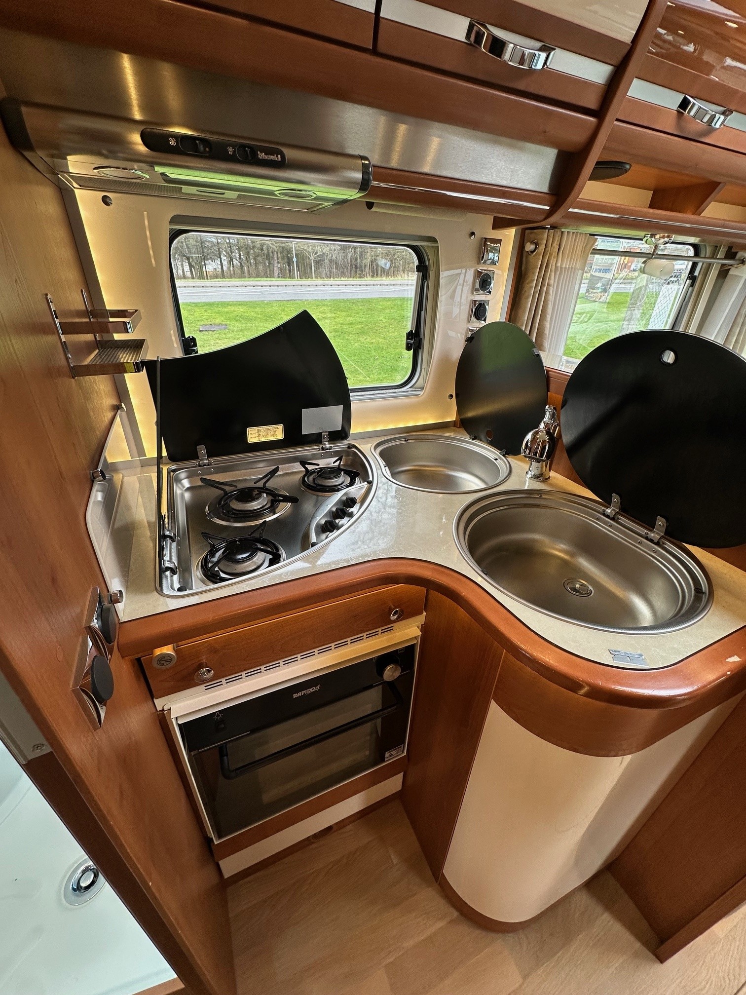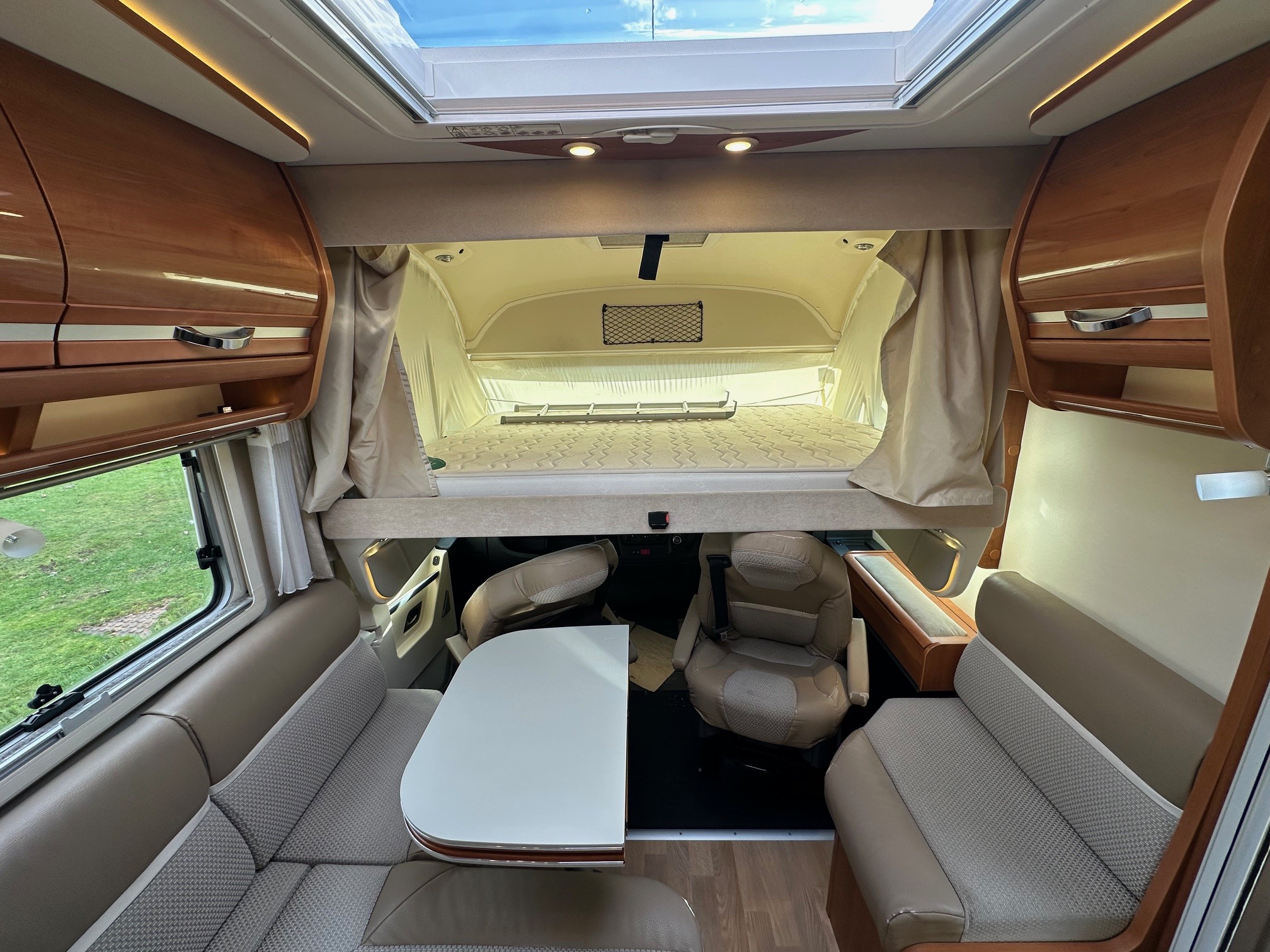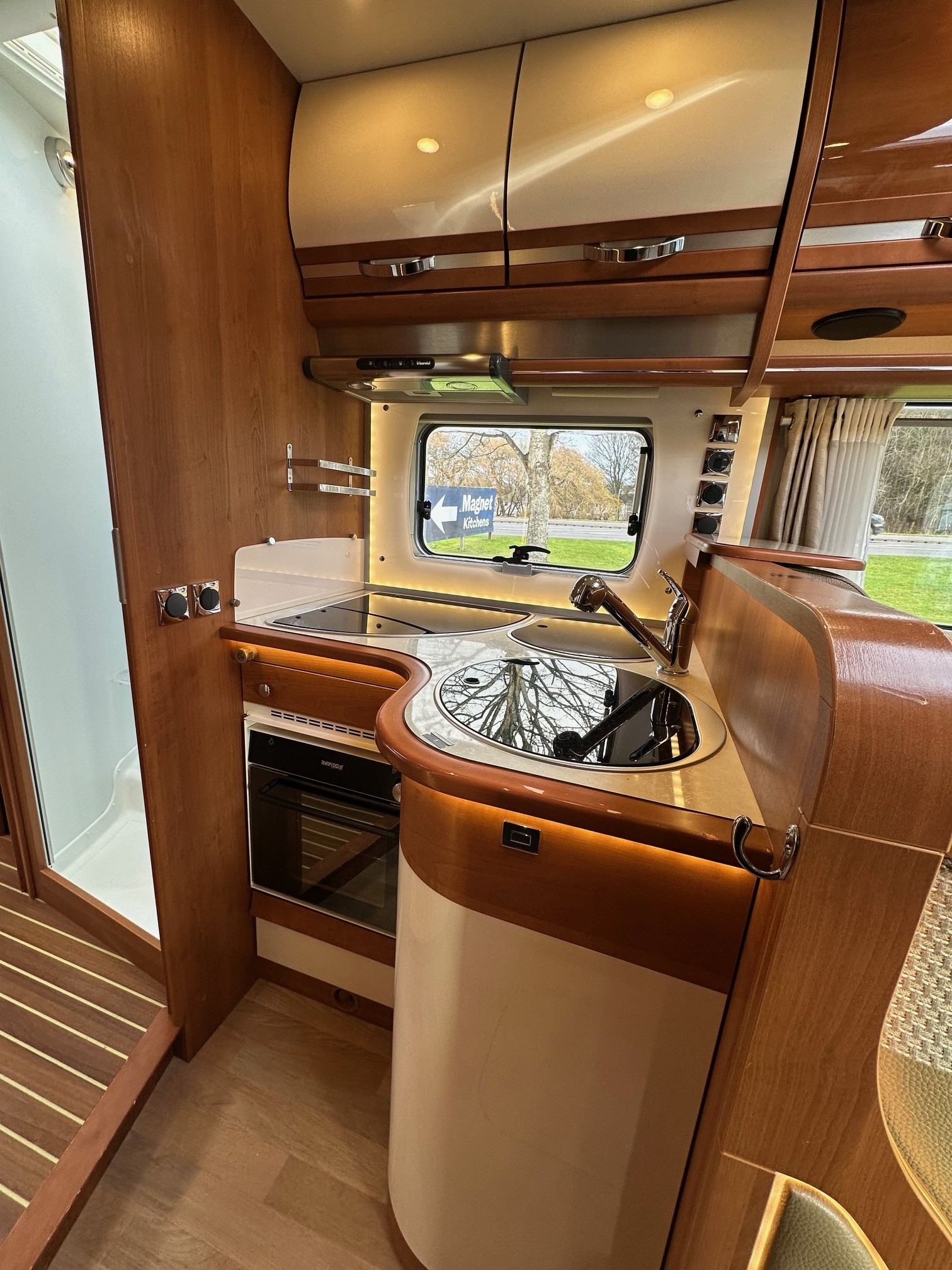 If there’s one thing that tells you this is a conventional A-class with a rear lounge replacing a bedroom it’s the washroom. Standing just forward of said lounge it would normally serve a bedroom in more usual models. So we have ablutions that are en suite to the lounge. Daft? Well not really, as the lounge easily converts into a bedroom, with a big, flat, comfortable transverse double, so it all works well.