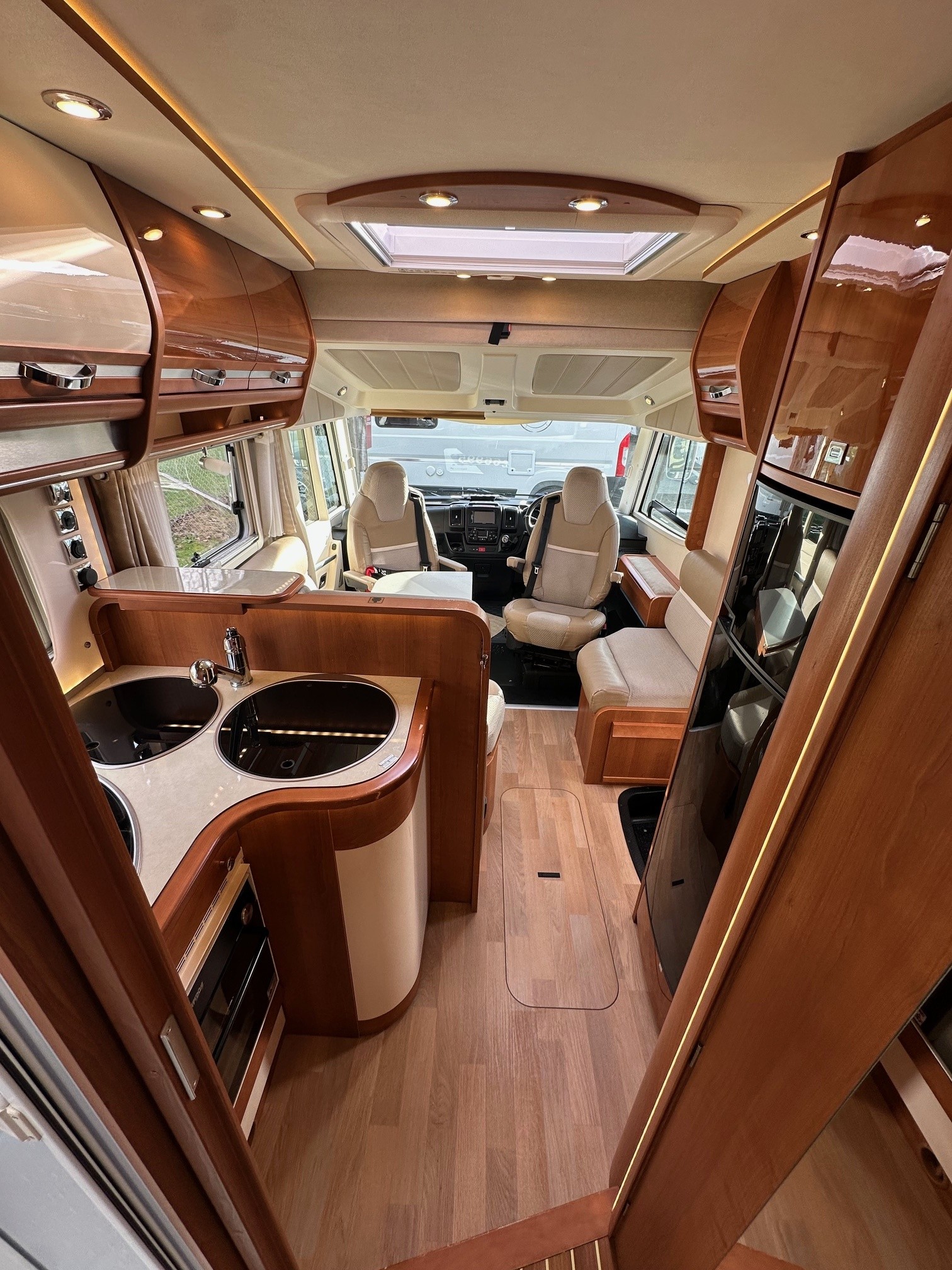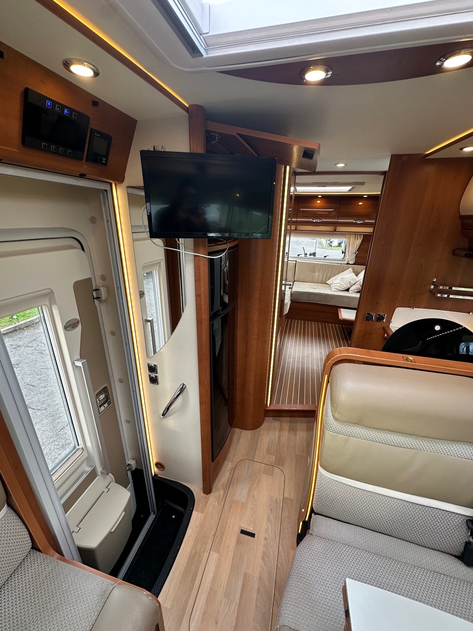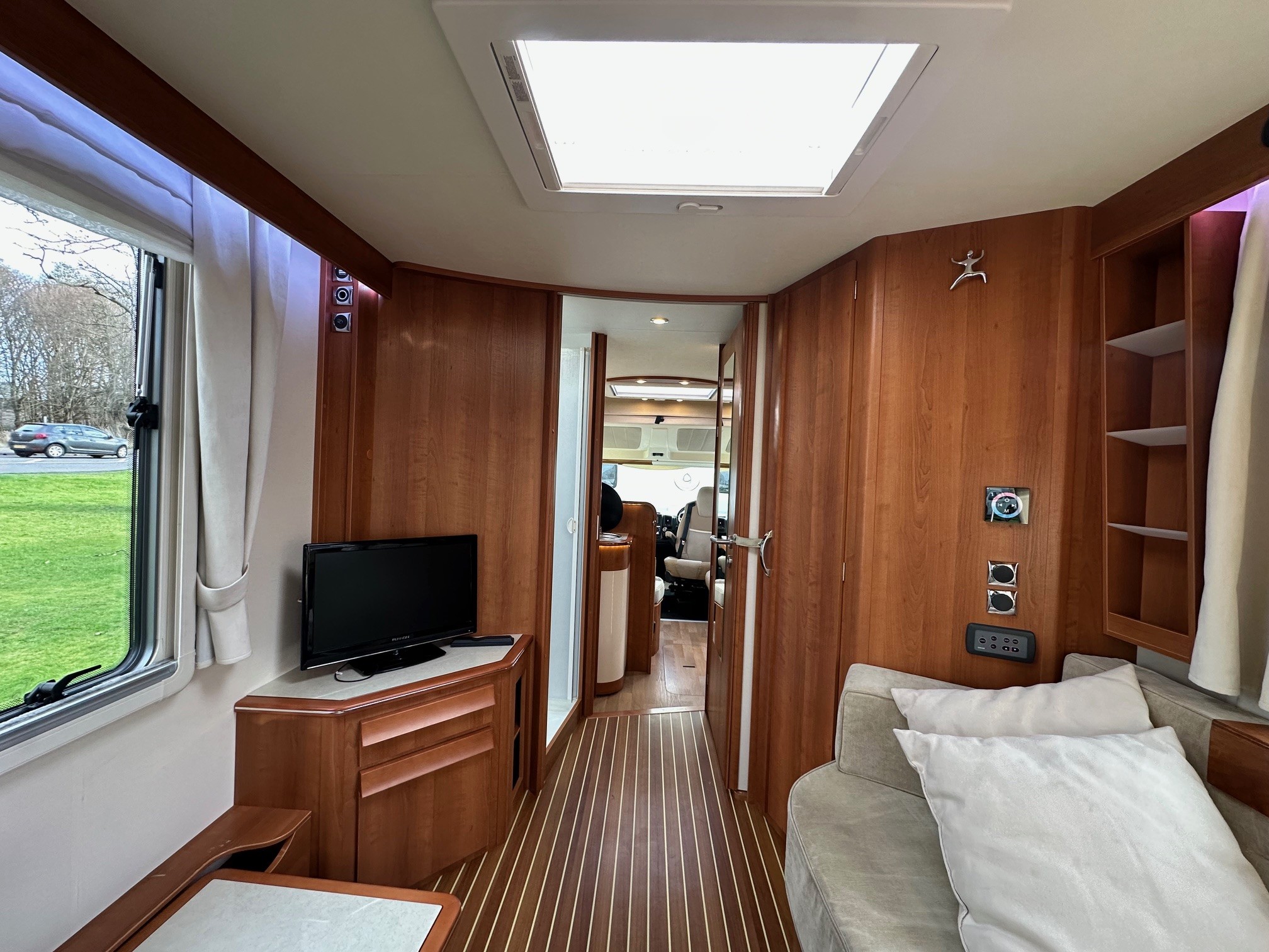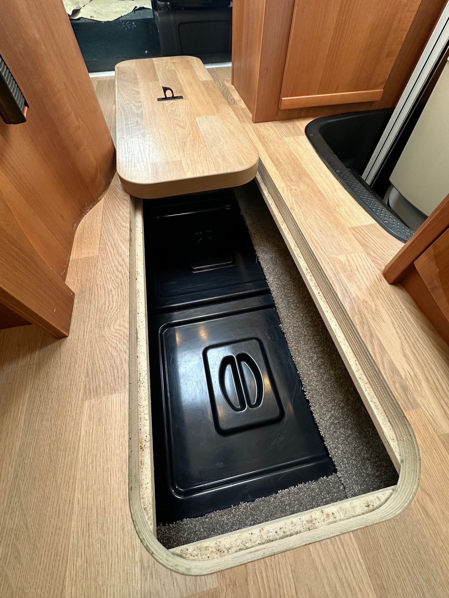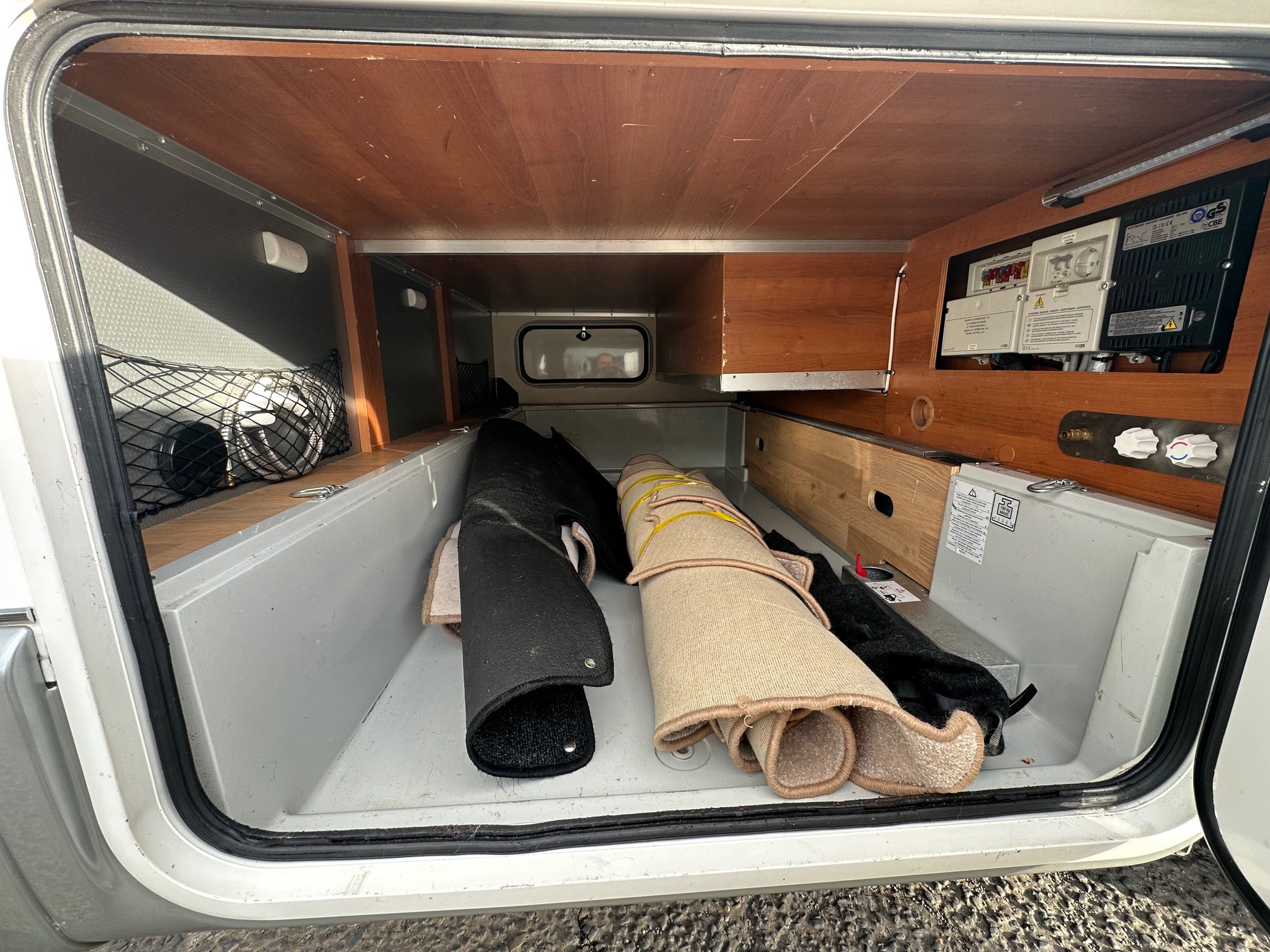 There’s no garage here, the low-level of the lounge cannot allow one, but there is a surprisingly roomy locker below that has two external doors – one big, one smaller – so it’s easy to get at your stuff. And you might stow plenty in here as there’s space for all your kit, save full-sized bikes. Neatly grouped in here are the electrics and drain valves, all heated and easy to get at,
