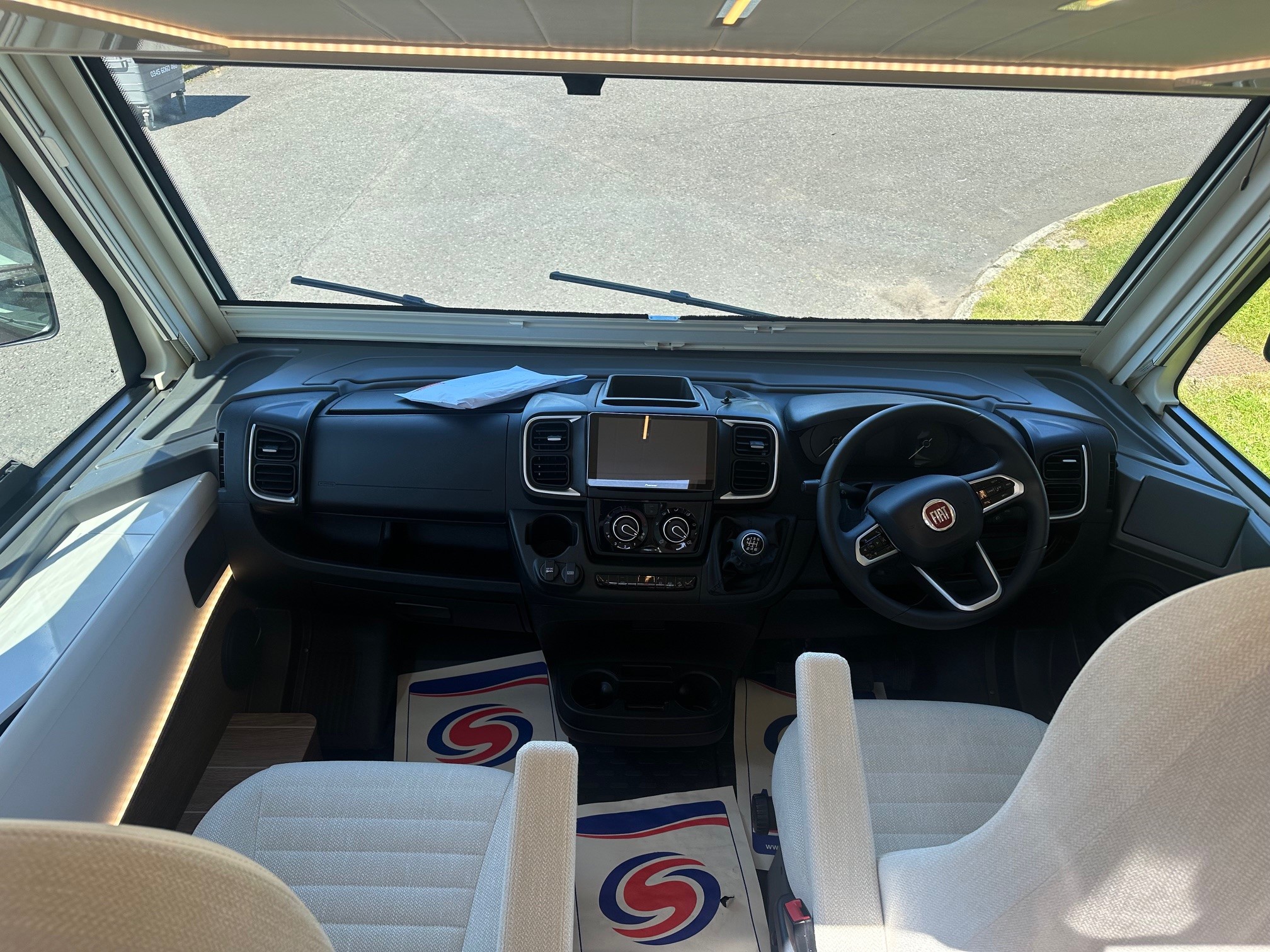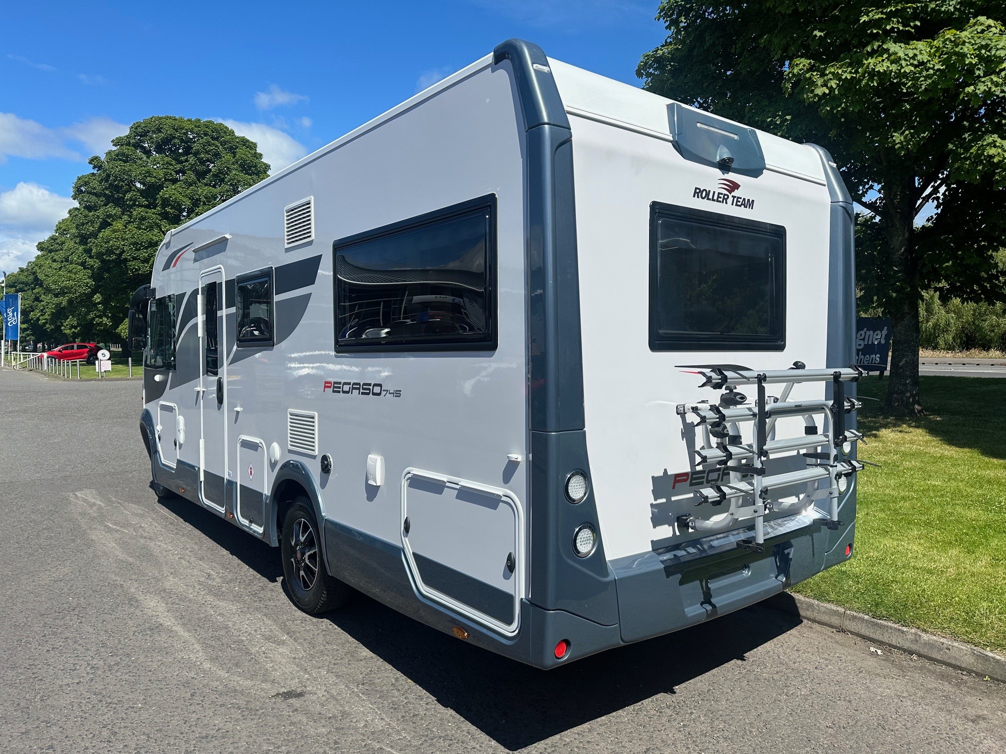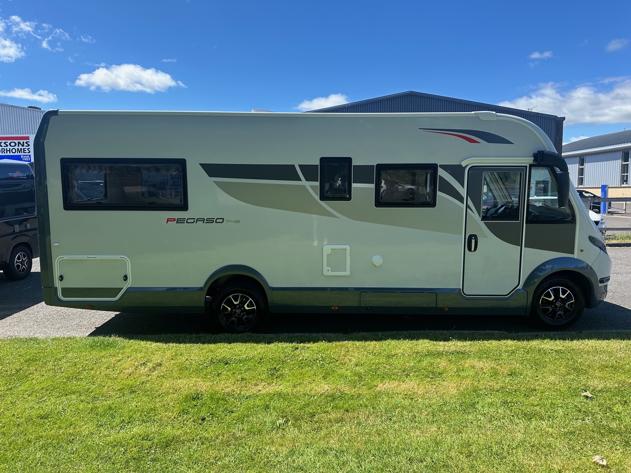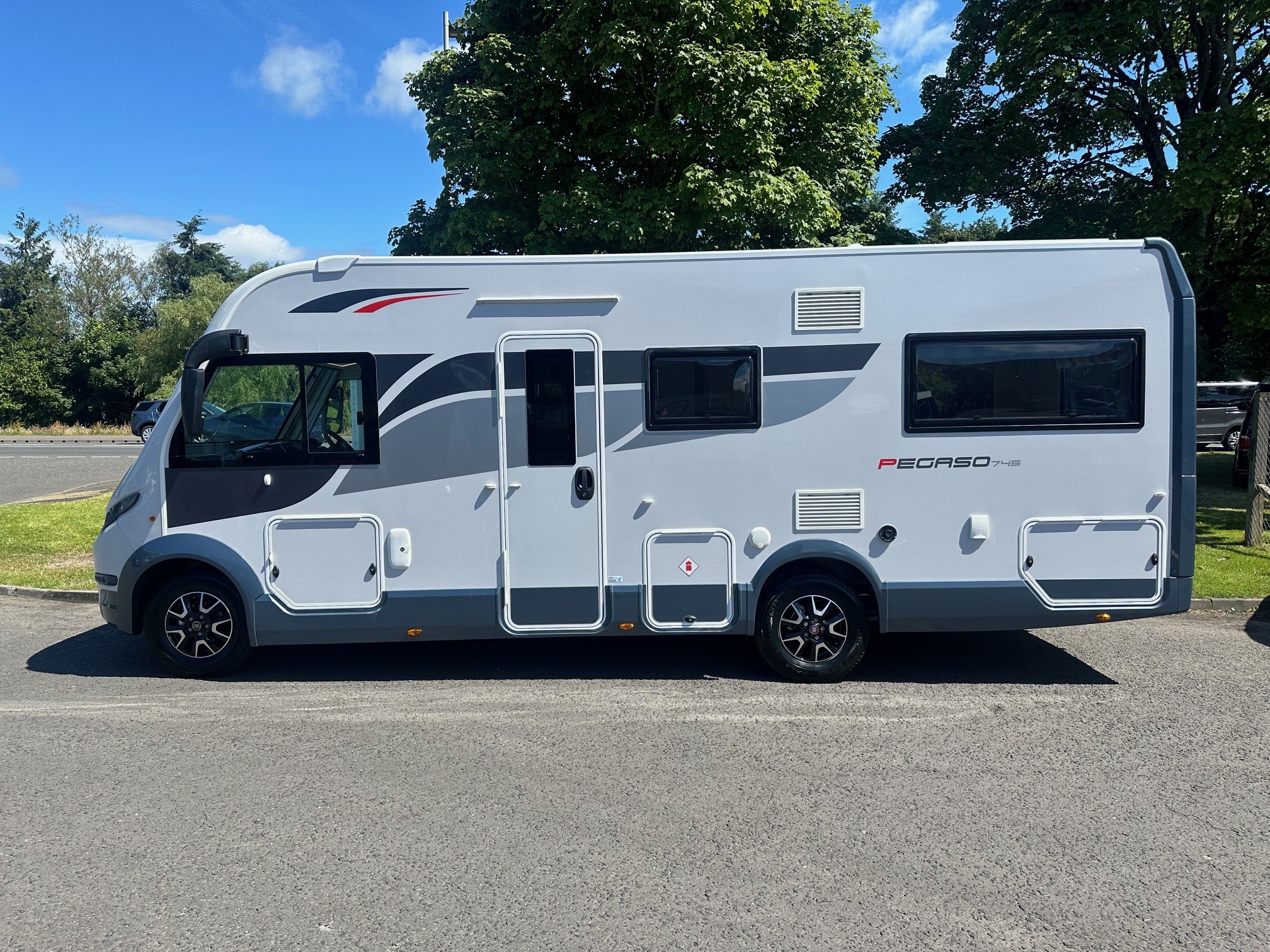 Brand new 2025 model Pegaso 745 automatic in stock now. The Pegaso 745 . Based on the Fiat Ducato chassis with 140bhp engine and 8 speed automatic transmission, the end lounge layout is a hit with families and couples as it provides a light and airy living area whilst keeping the dining area free. A double bed swings down above the cab area and the rear lounge turns into a further double bed quickly with a pull out bed system. The kitchen is located centrally to one side and features a 3 burner gas hob, gas oven/grill and a good size fridge/freezer. The bathroom opposite has a shower cubicle, cassette type toilet and wash basin. Heating and hot water is provided by a Truma dual fuel system and other features on this Pegaso 745 include: New Pioneer Sat Nav/Infotainment centre, Solar panel, Twin reversing cameras, WiFi, External gas BBQ and shower points, Colour Sat Nav, cab A/C, 4 bike rack and carpets. L. 7.41m, W. 2.35M, H. 2.95M, 3,500kg, 4 berth, 4 seat belts. Delivery Mileage.