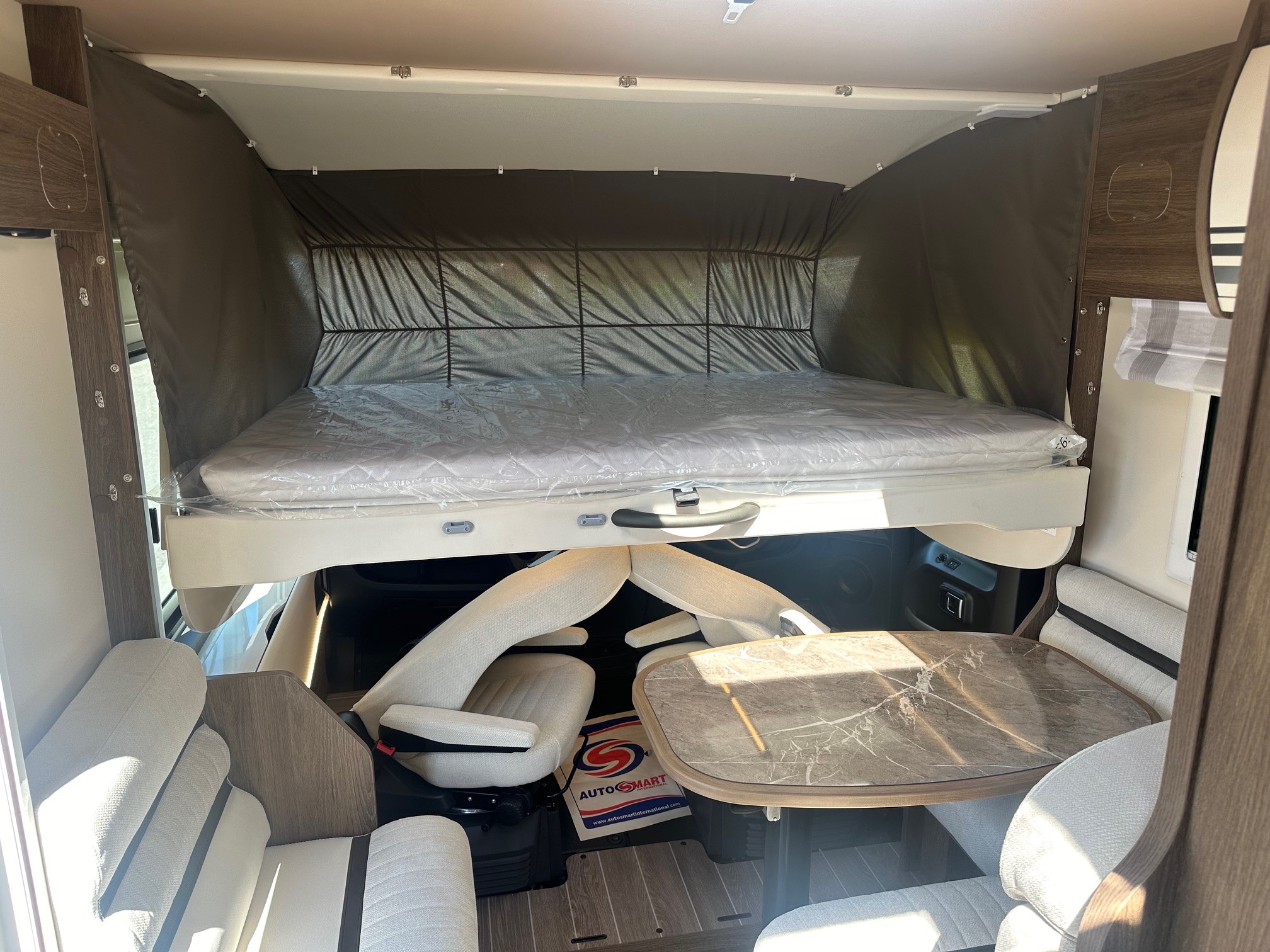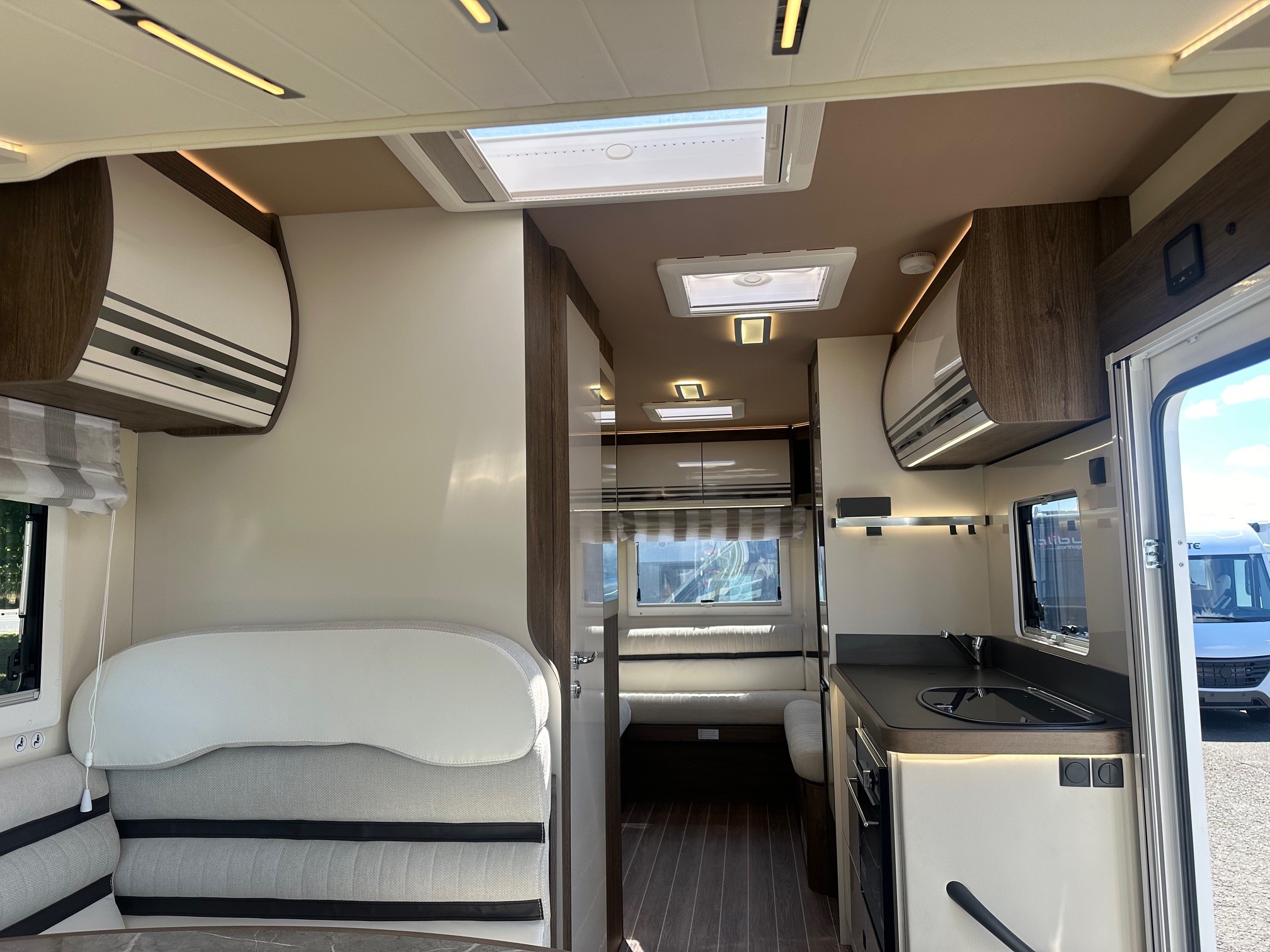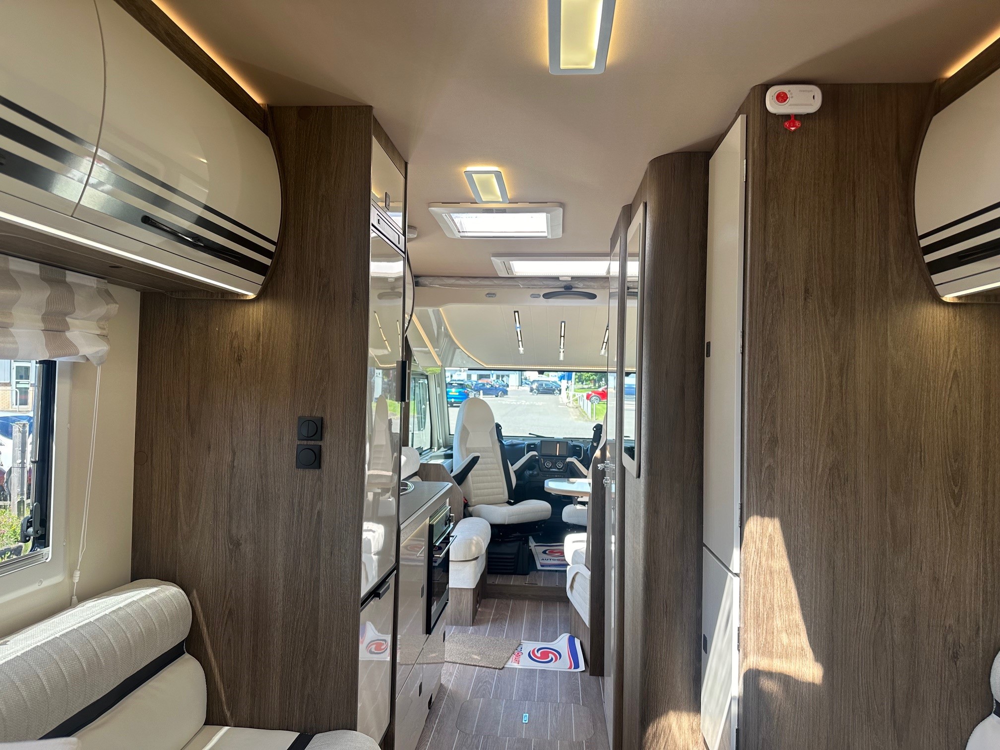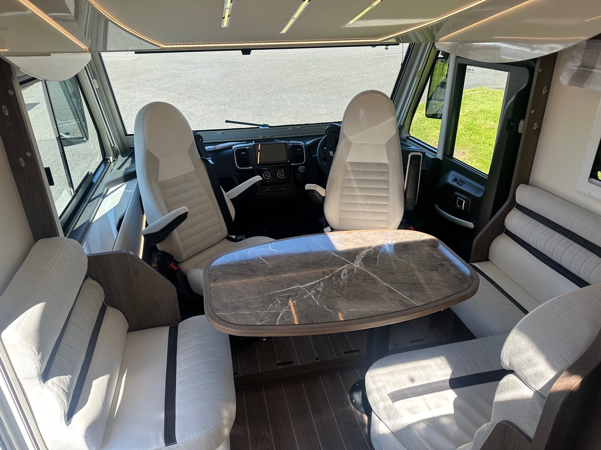 Brand new 2025 model Pegaso 745 automatic in stock now. The Pegaso 745 . Based on the Fiat Ducato chassis with 140bhp engine and 8 speed automatic transmission, the end lounge layout is a hit with families and couples as it provides a light and airy living area whilst keeping the dining area free. A double bed swings down above the cab area and the rear lounge turns into a further double bed quickly with a pull out bed system. The kitchen is located centrally to one side and features a 3 burner gas hob, gas oven/grill and a good size fridge/freezer. The bathroom opposite has a shower cubicle, cassette type toilet and wash basin. Heating and hot water is provided by a Truma dual fuel system and other features on this Pegaso 745 include: New Pioneer Sat Nav/Infotainment centre, Solar panel, Twin reversing cameras, WiFi, External gas BBQ and shower points, Colour Sat Nav, cab A/C, 4 bike rack and carpets. L. 7.41m, W. 2.35M, H. 2.95M, 3,500kg, 4 berth, 4 seat belts. Delivery Mileage.