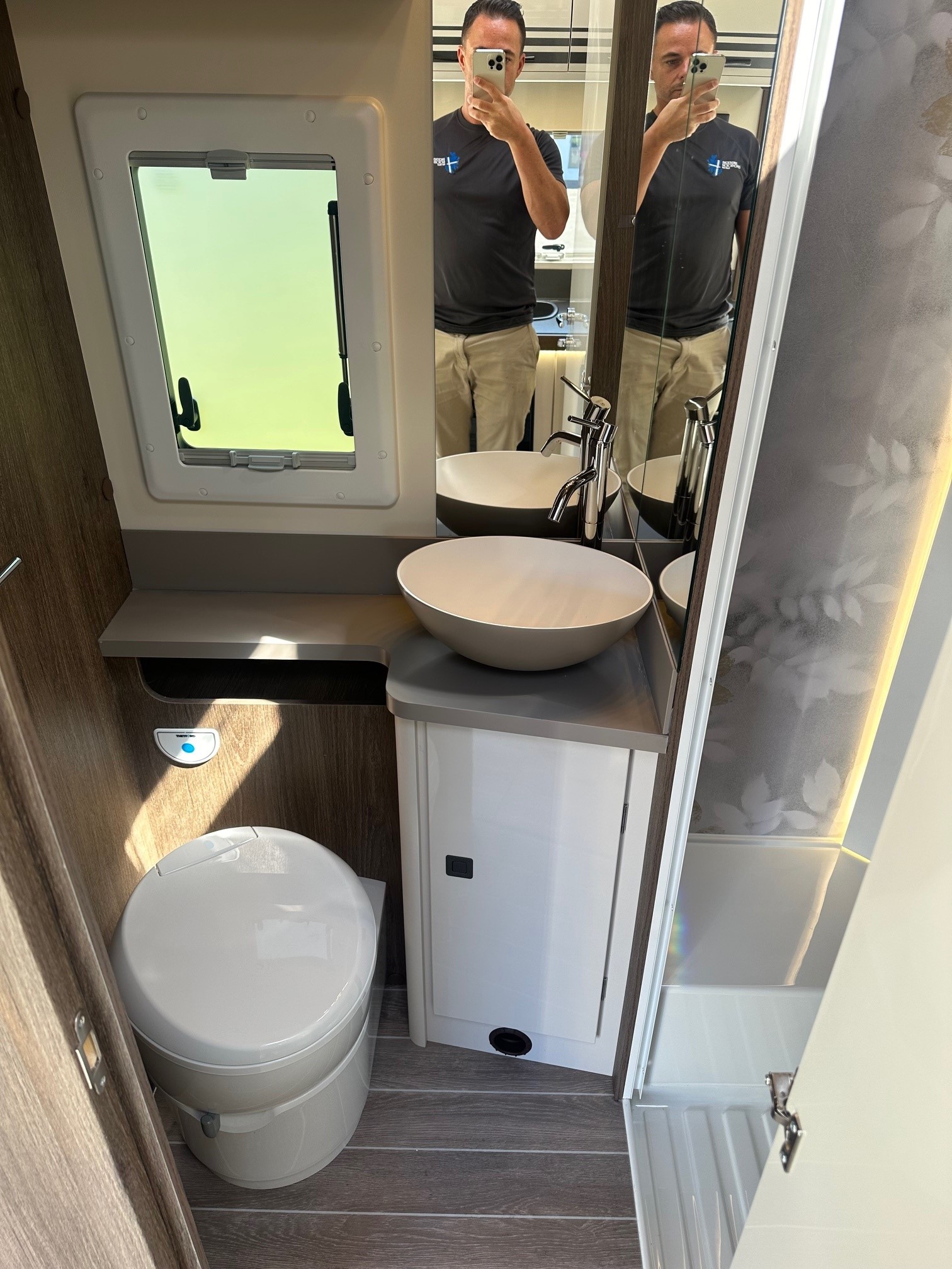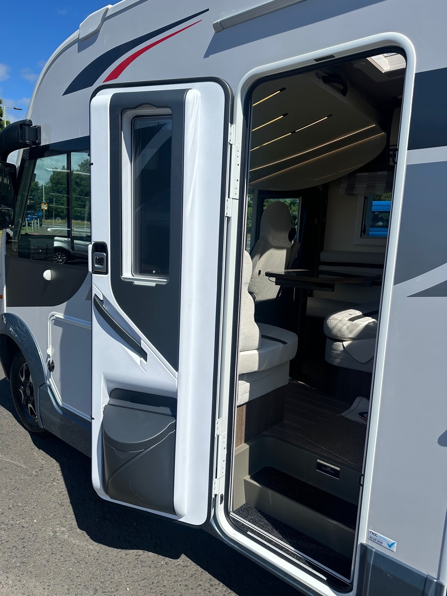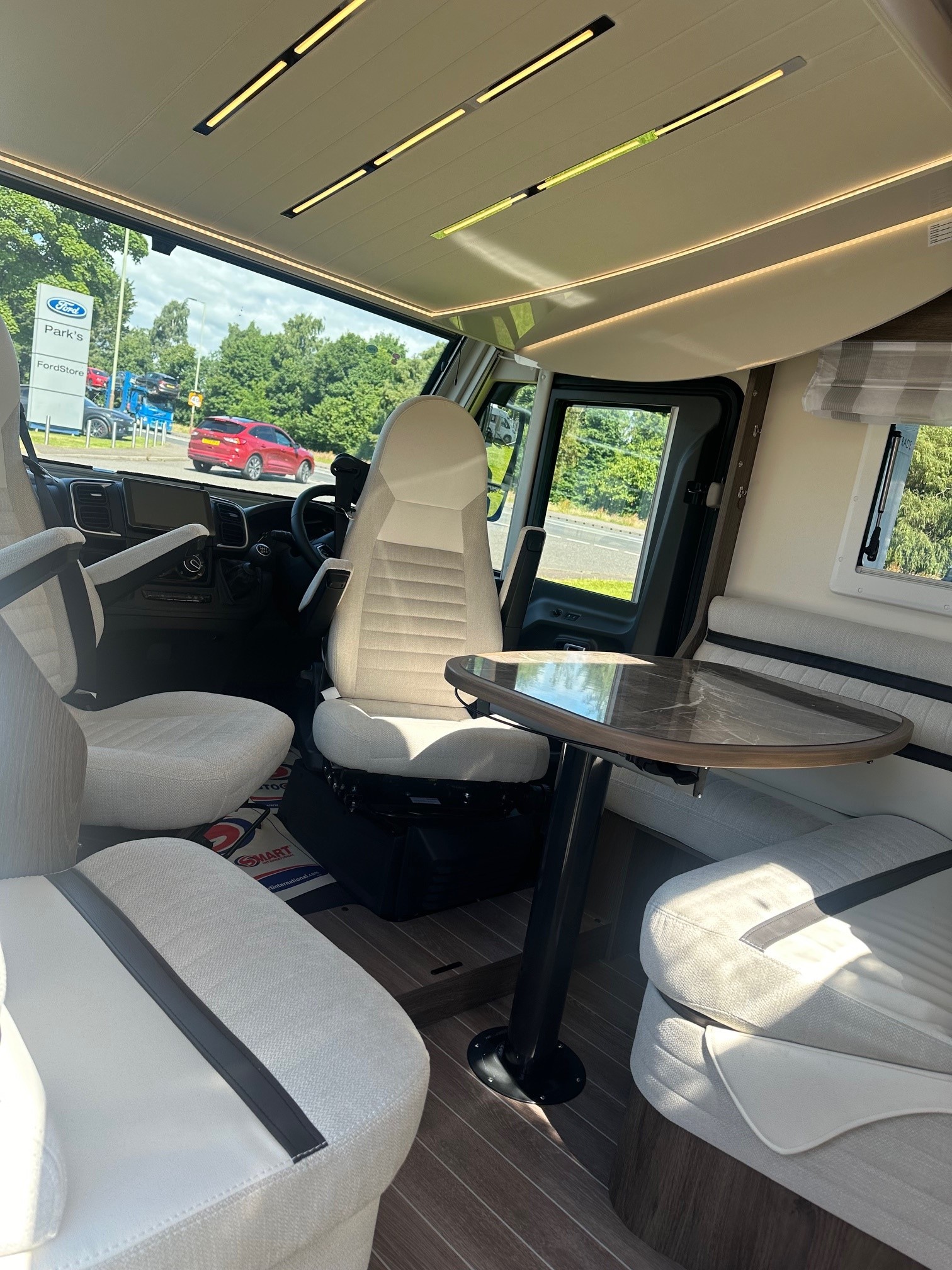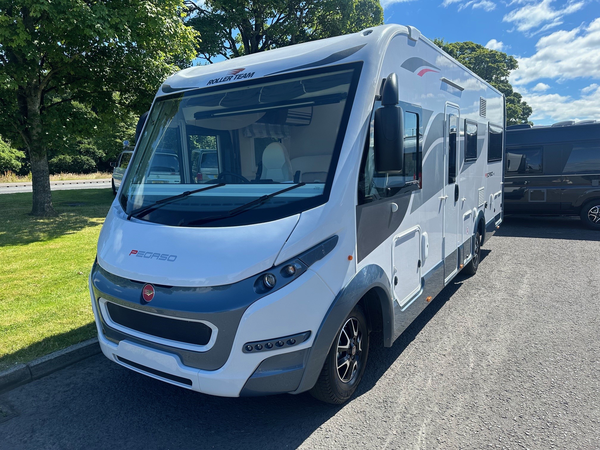 Brand new 2025 model Pegaso 745 automatic in stock now. The Pegaso 745 . Based on the Fiat Ducato chassis with 140bhp engine and 8 speed automatic transmission, the end lounge layout is a hit with families and couples as it provides a light and airy living area whilst keeping the dining area free. A double bed swings down above the cab area and the rear lounge turns into a further double bed quickly with a pull out bed system. The kitchen is located centrally to one side and features a 3 burner gas hob, gas oven/grill and a good size fridge/freezer. The bathroom opposite has a shower cubicle, cassette type toilet and wash basin. Heating and hot water is provided by a Truma dual fuel system and other features on this Pegaso 745 include: New Pioneer Sat Nav/Infotainment centre, Solar panel, Twin reversing cameras, WiFi, External gas BBQ and shower points, Colour Sat Nav, cab A/C, 4 bike rack and carpets. L. 7.41m, W. 2.35M, H. 2.95M, 3,500kg, 4 berth, 4 seat belts. Delivery Mileage.