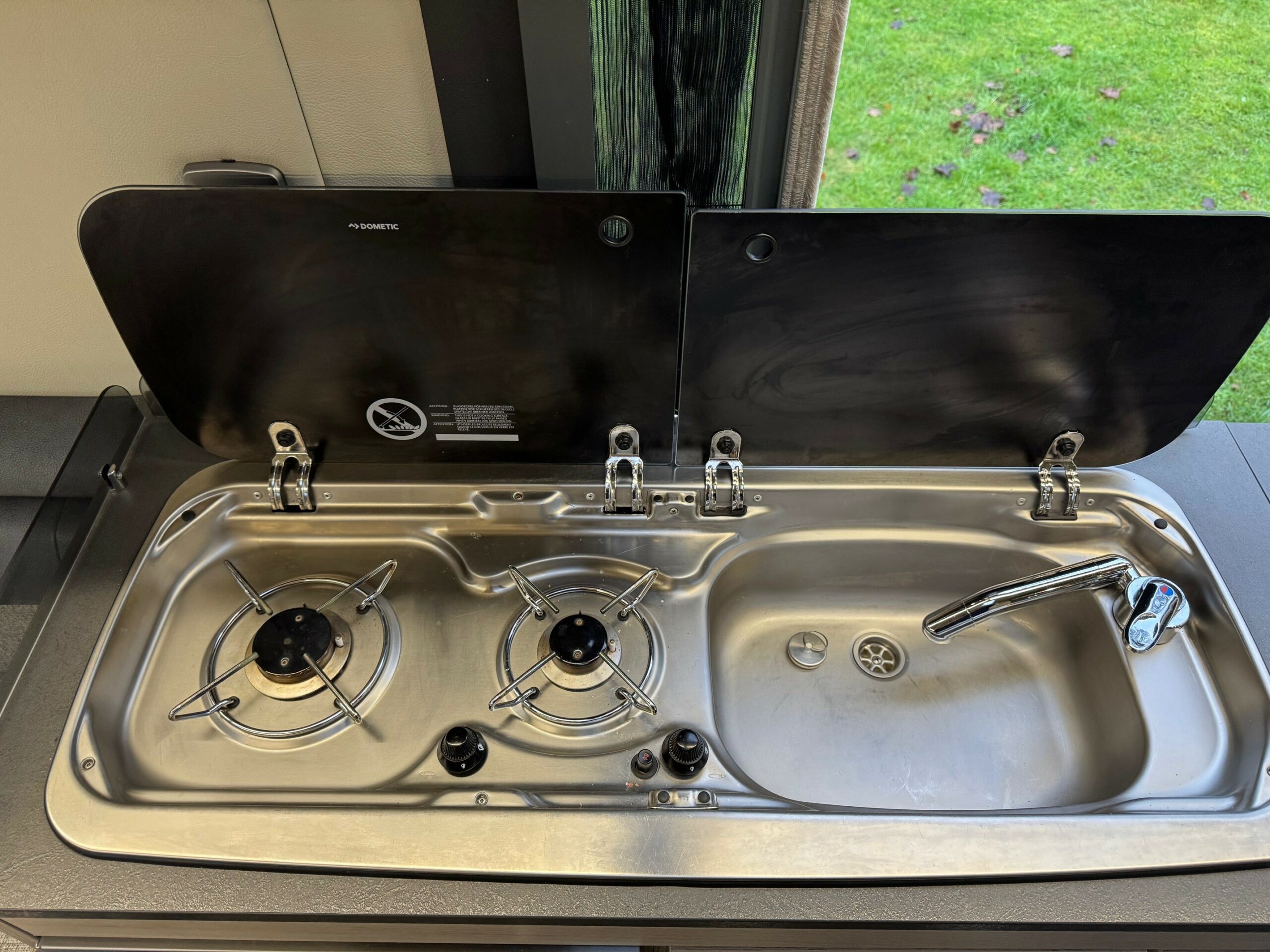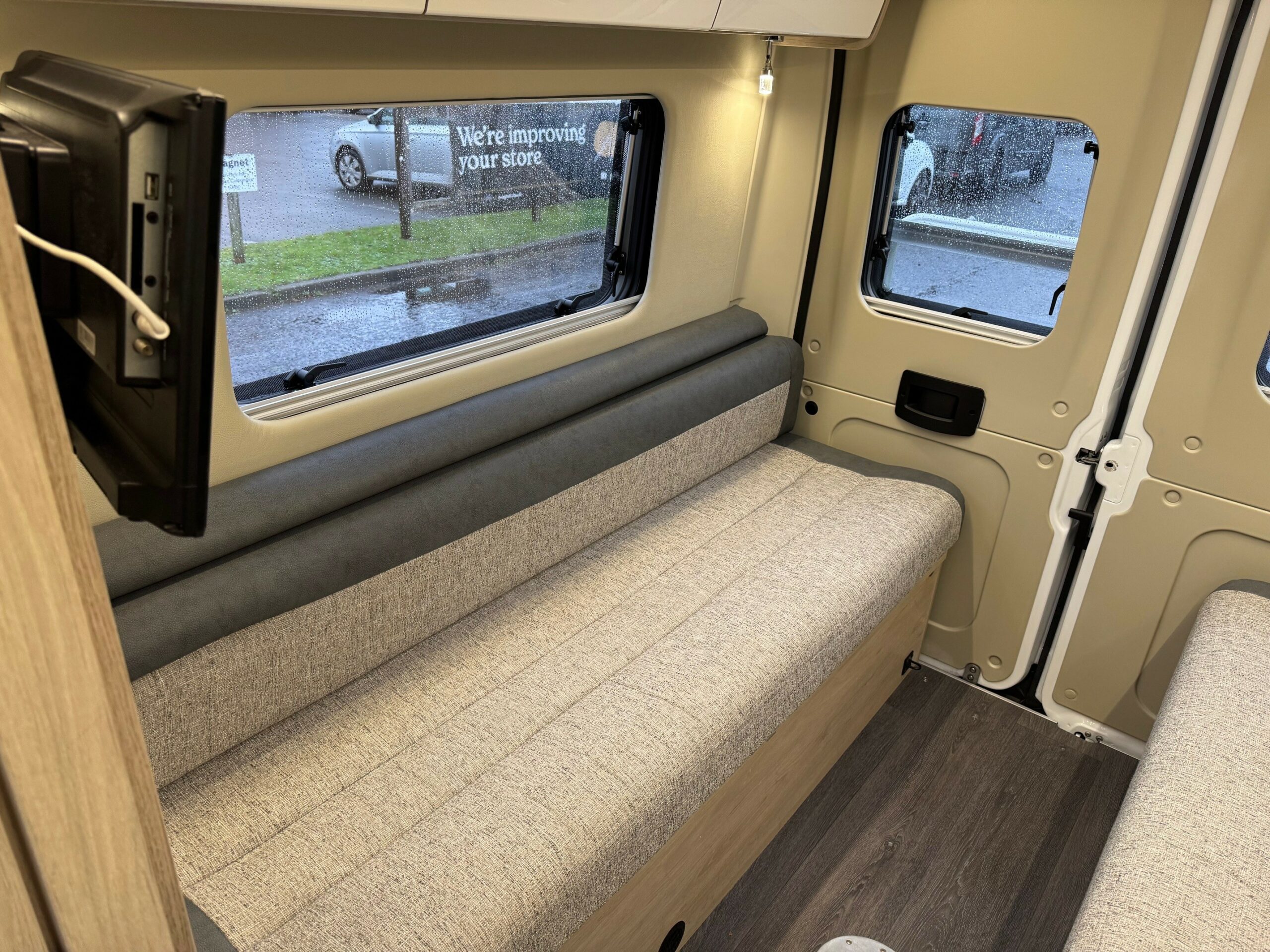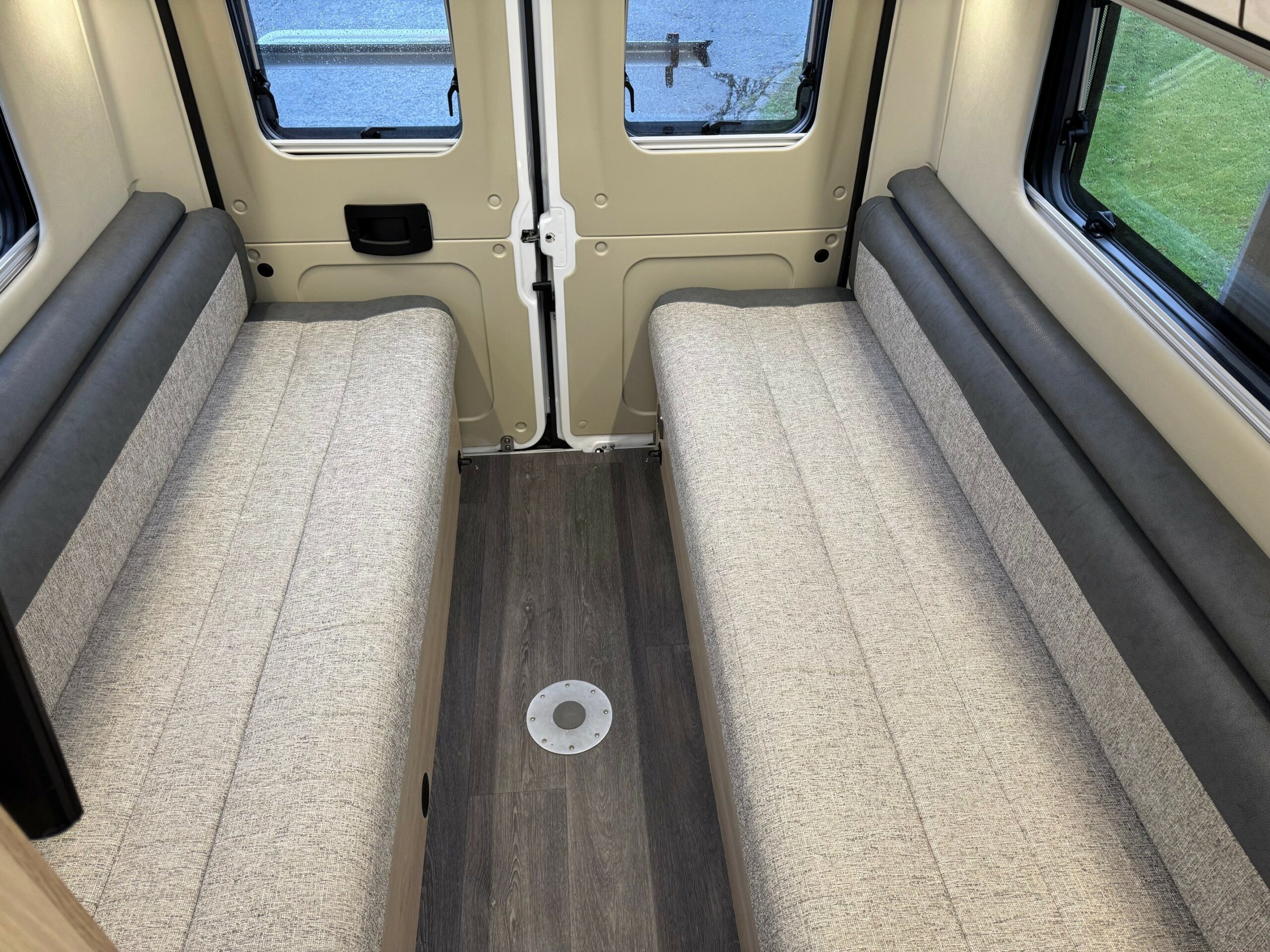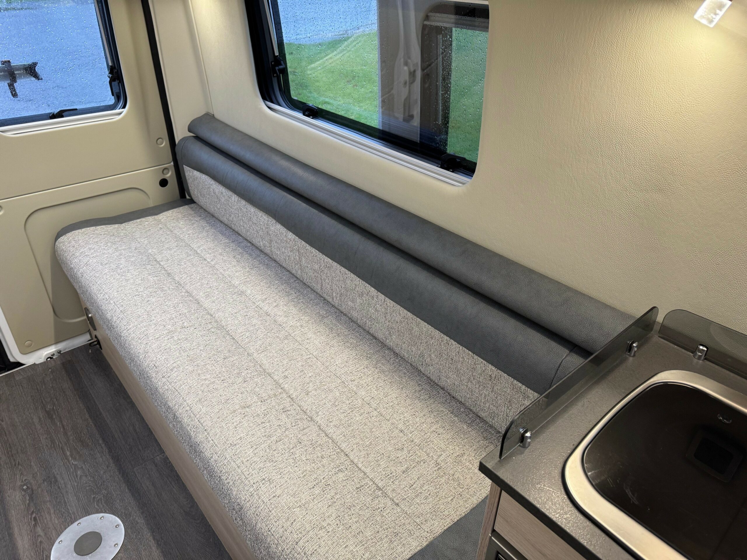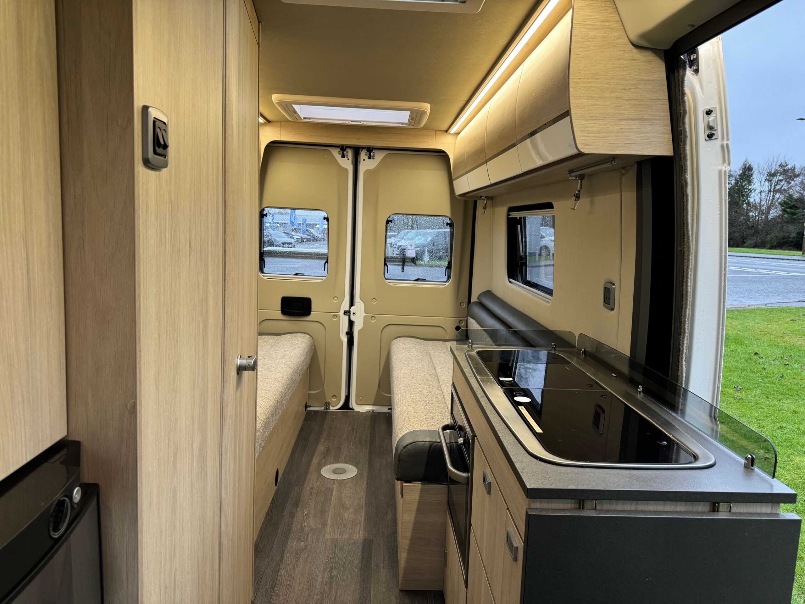 Spacious & Stylish 2 berth 2 belt sub 6m van conversion. A huge rear lounge with 2 bench seats both over 6ft in length. The lounge can easily be converted into a kinge size double or 2 single beds. Stoarge under both bench seats. Side kitchen with oven/grill, gas hob, fridge freezer & lots of storage. Opposite is the washroom with drop down sink, W/C & combinded shower. There is a large wardrobe to the front of the vehicle and overcab storage. 2 captains chairs.
