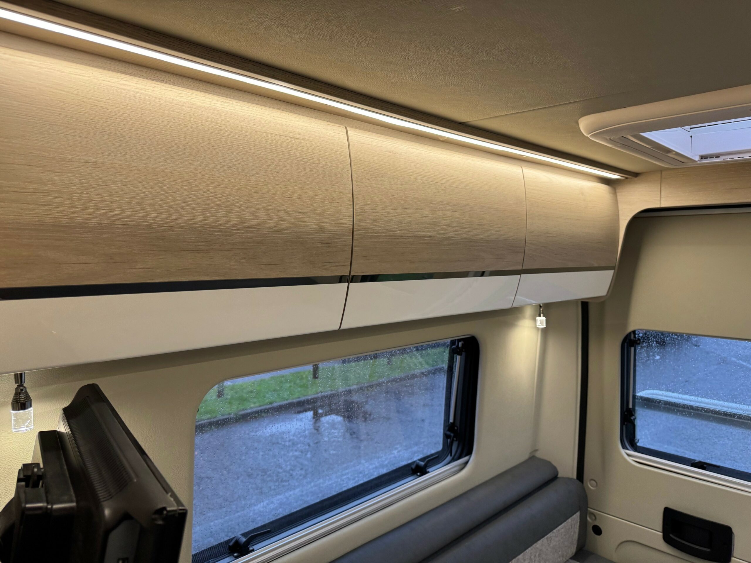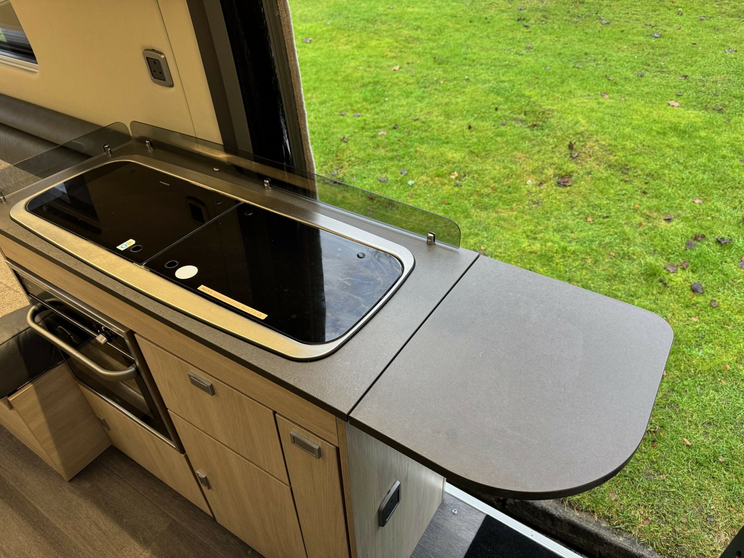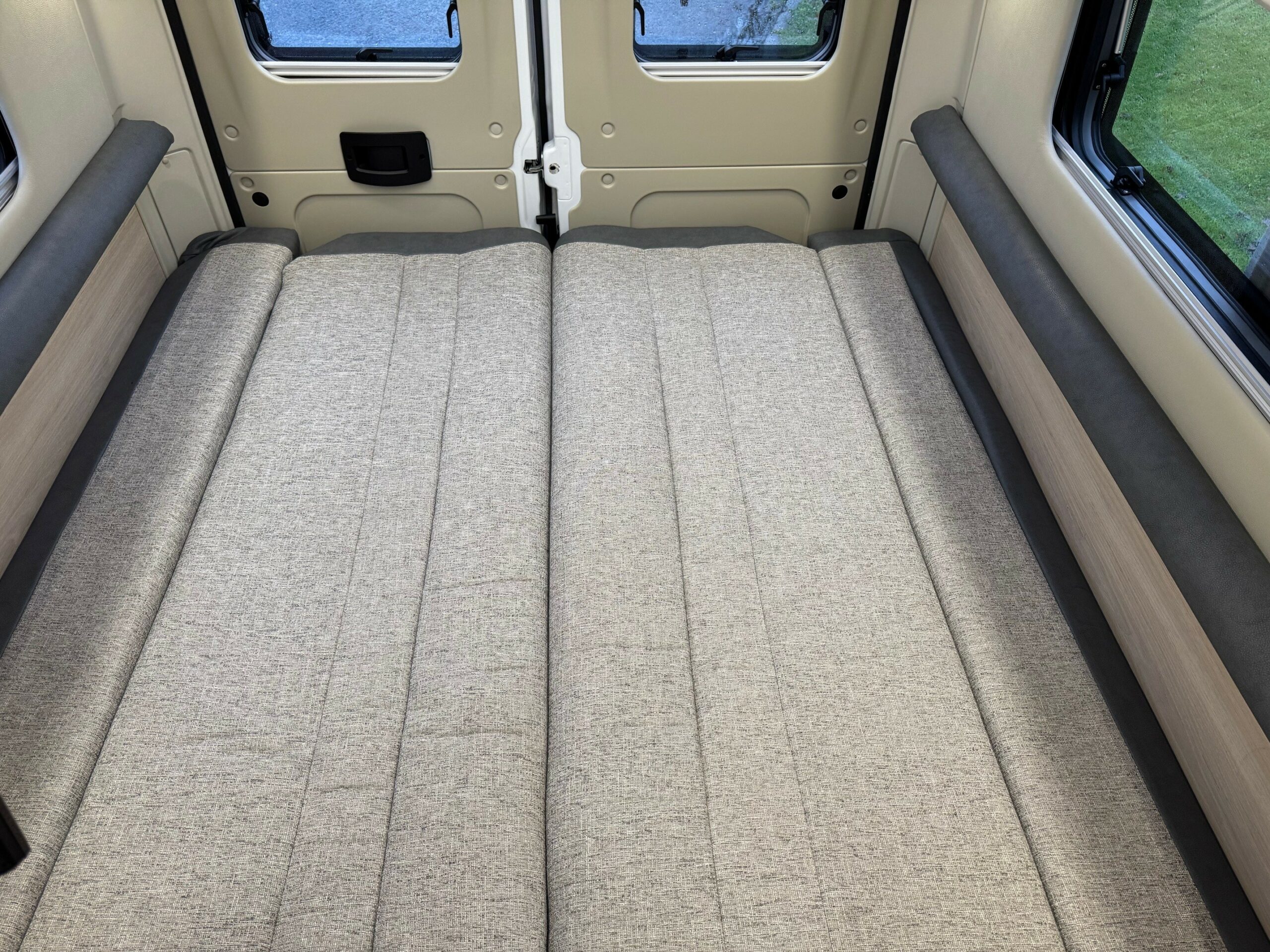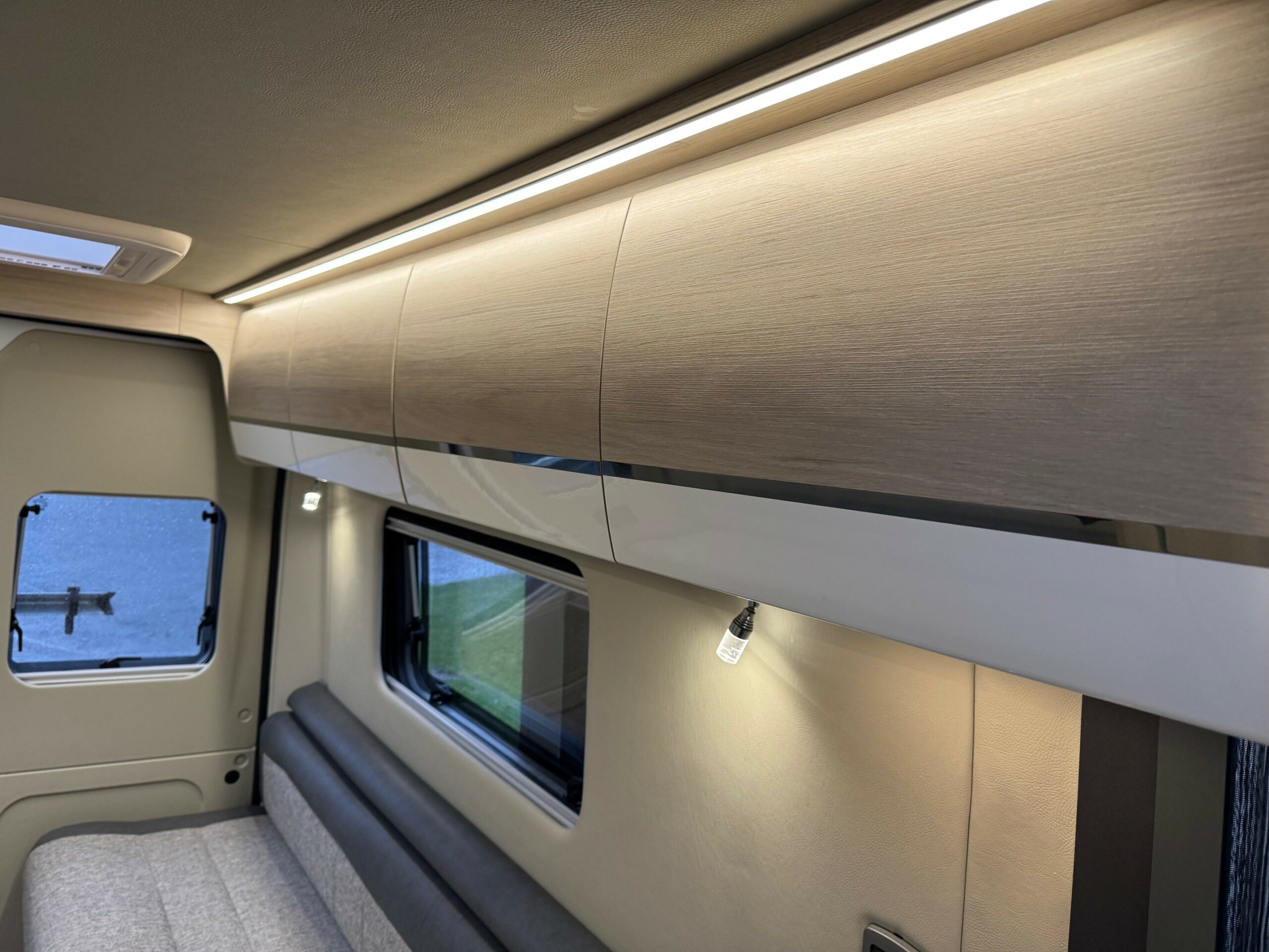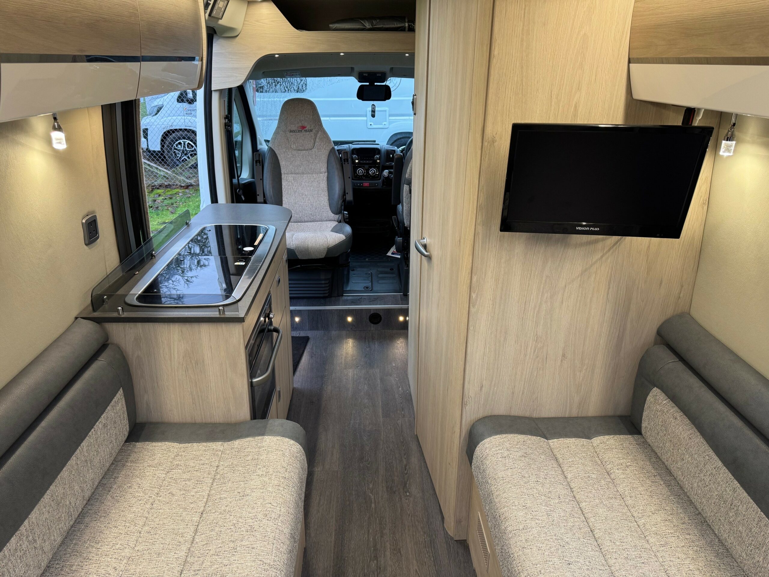 Spacious & Stylish 2 berth 2 belt sub 6m van conversion. A huge rear lounge with 2 bench seats both over 6ft in length. The lounge can easily be converted into a kinge size double or 2 single beds. Stoarge under both bench seats. Side kitchen with oven/grill, gas hob, fridge freezer & lots of storage. Opposite is the washroom with drop down sink, W/C & combinded shower. There is a large wardrobe to the front of the vehicle and overcab storage. 2 captains chairs.