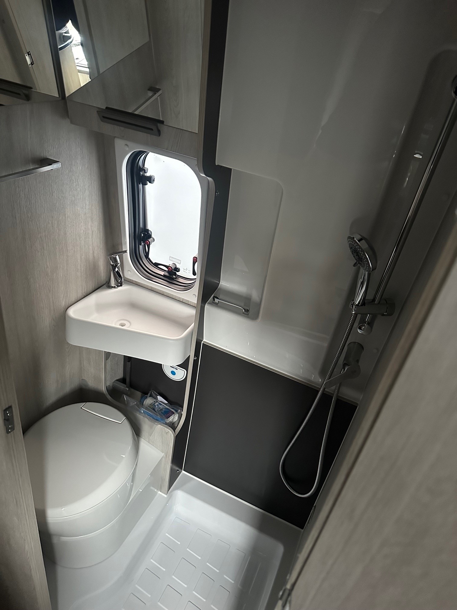 - Washroom: A space-saving wetroom featuring a shower, cassette toilet, and vanity sink.