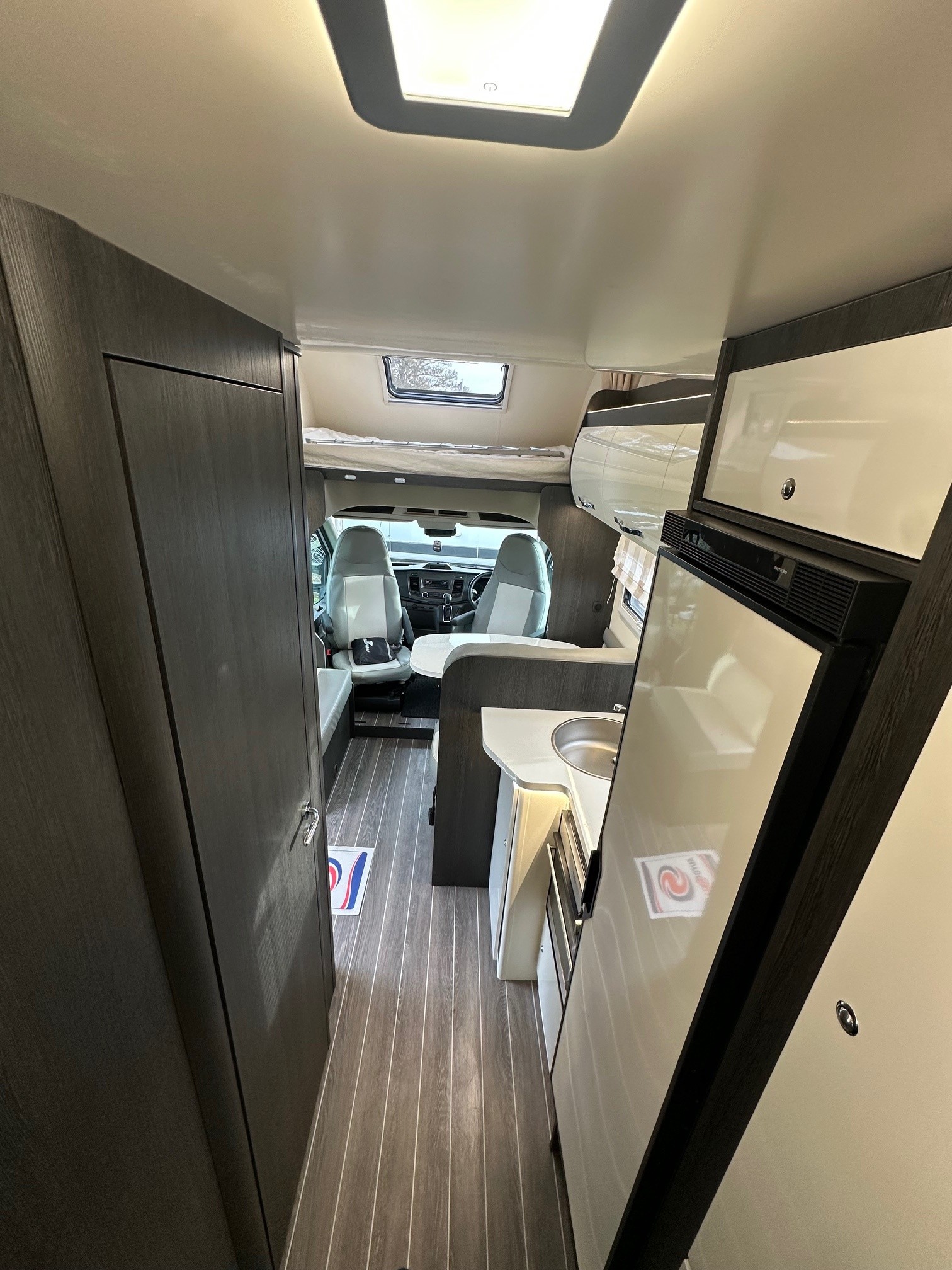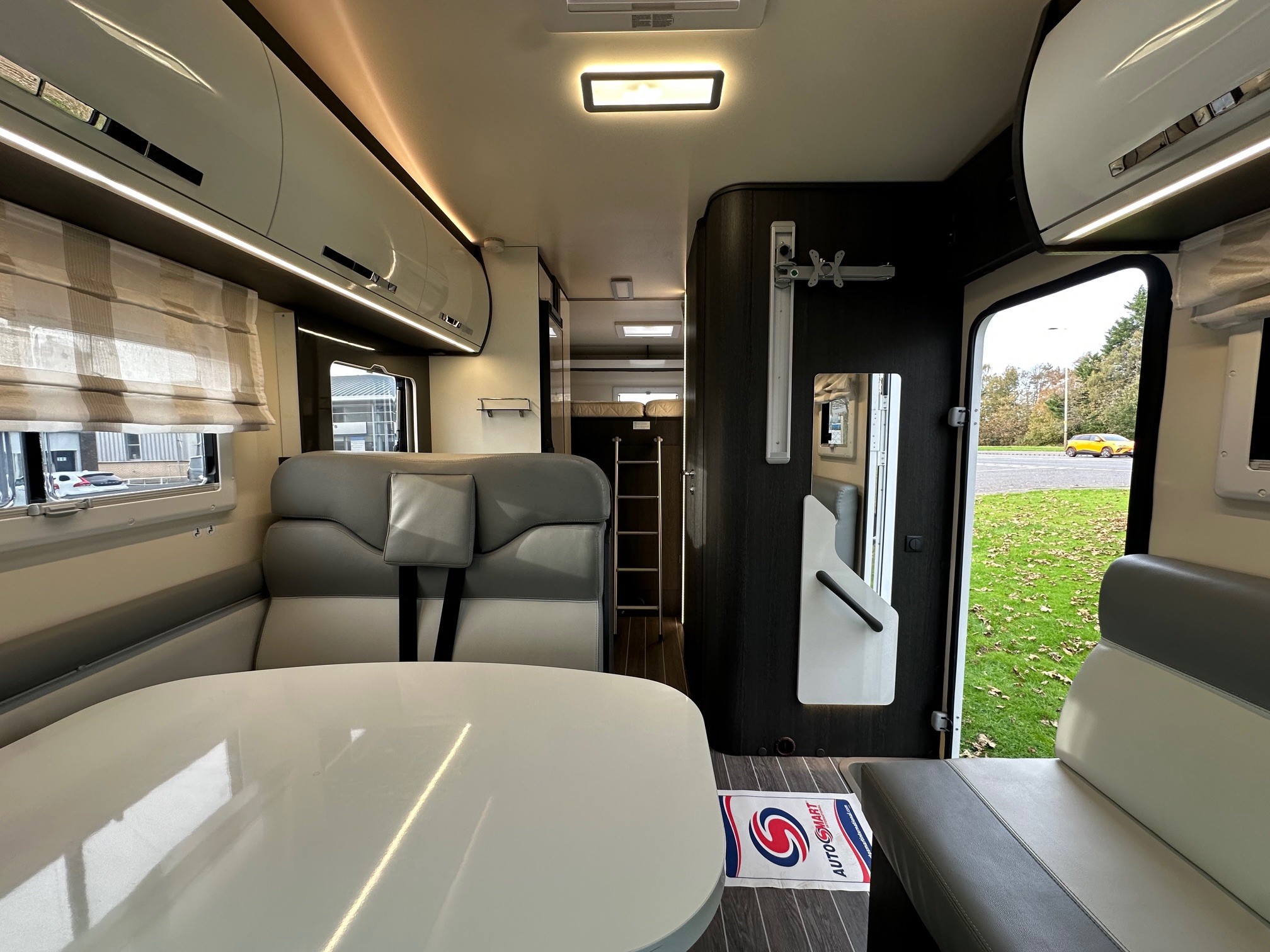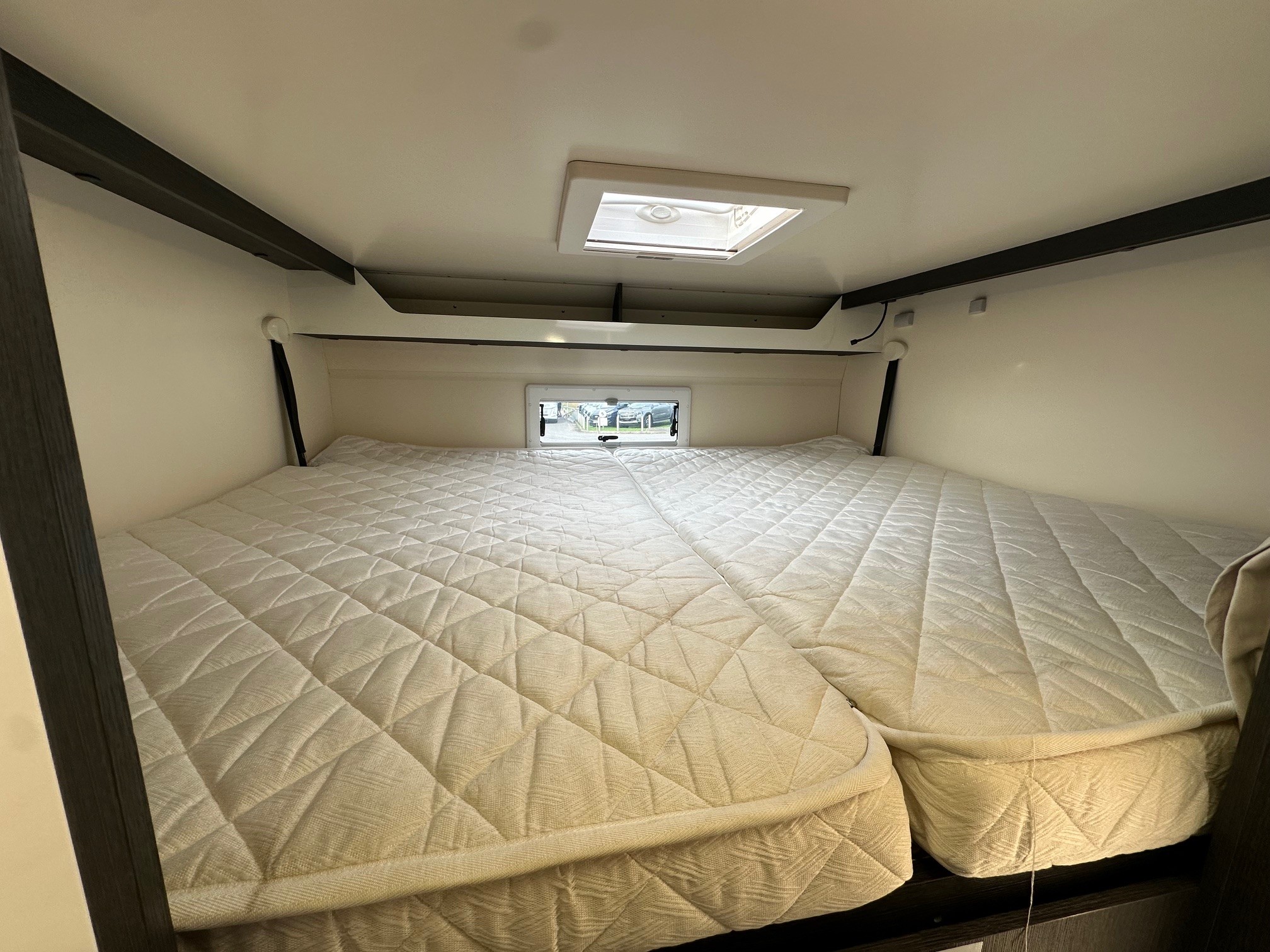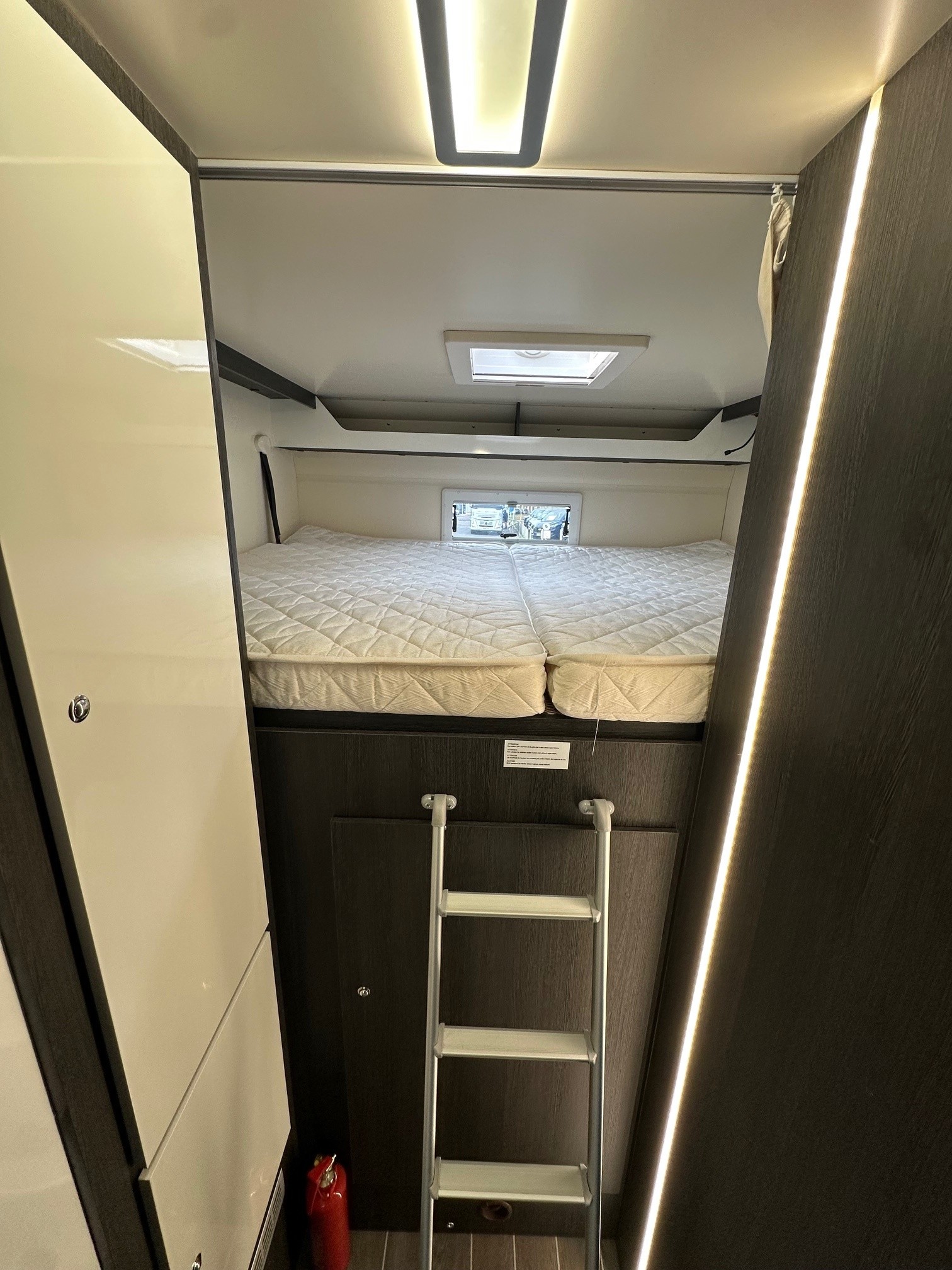 - Spacious 4-berth layout:Â This model offers versatile sleeping arrangements for four people, including a generous double bed over the cab and a rear transverse double bed, which is electrically height-adjustable to maximize garage space.