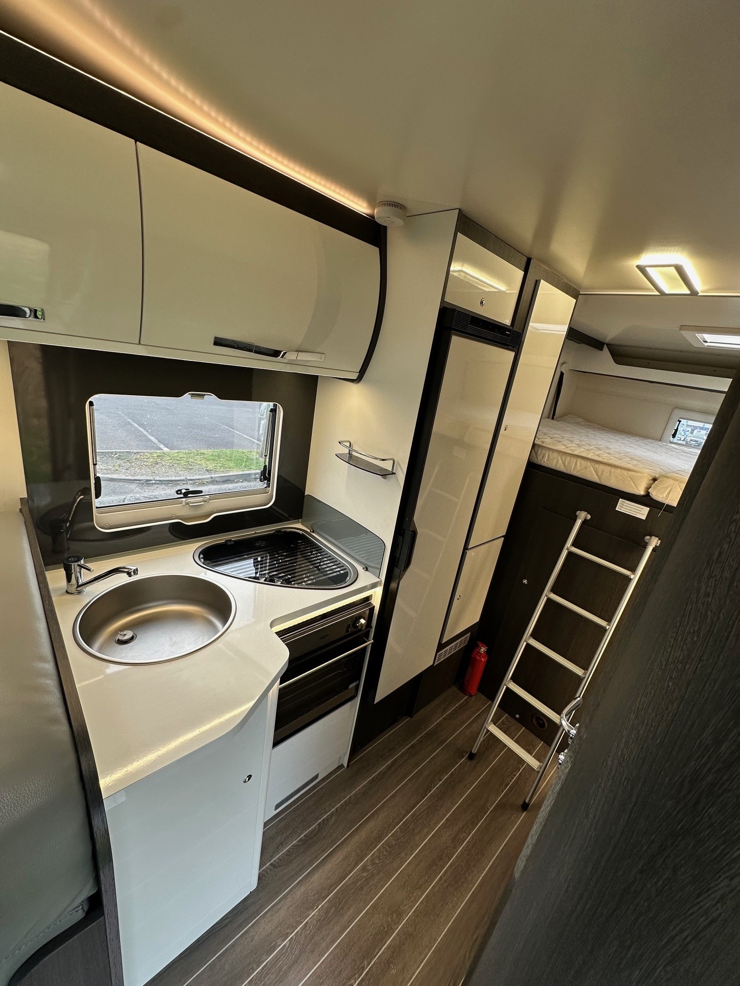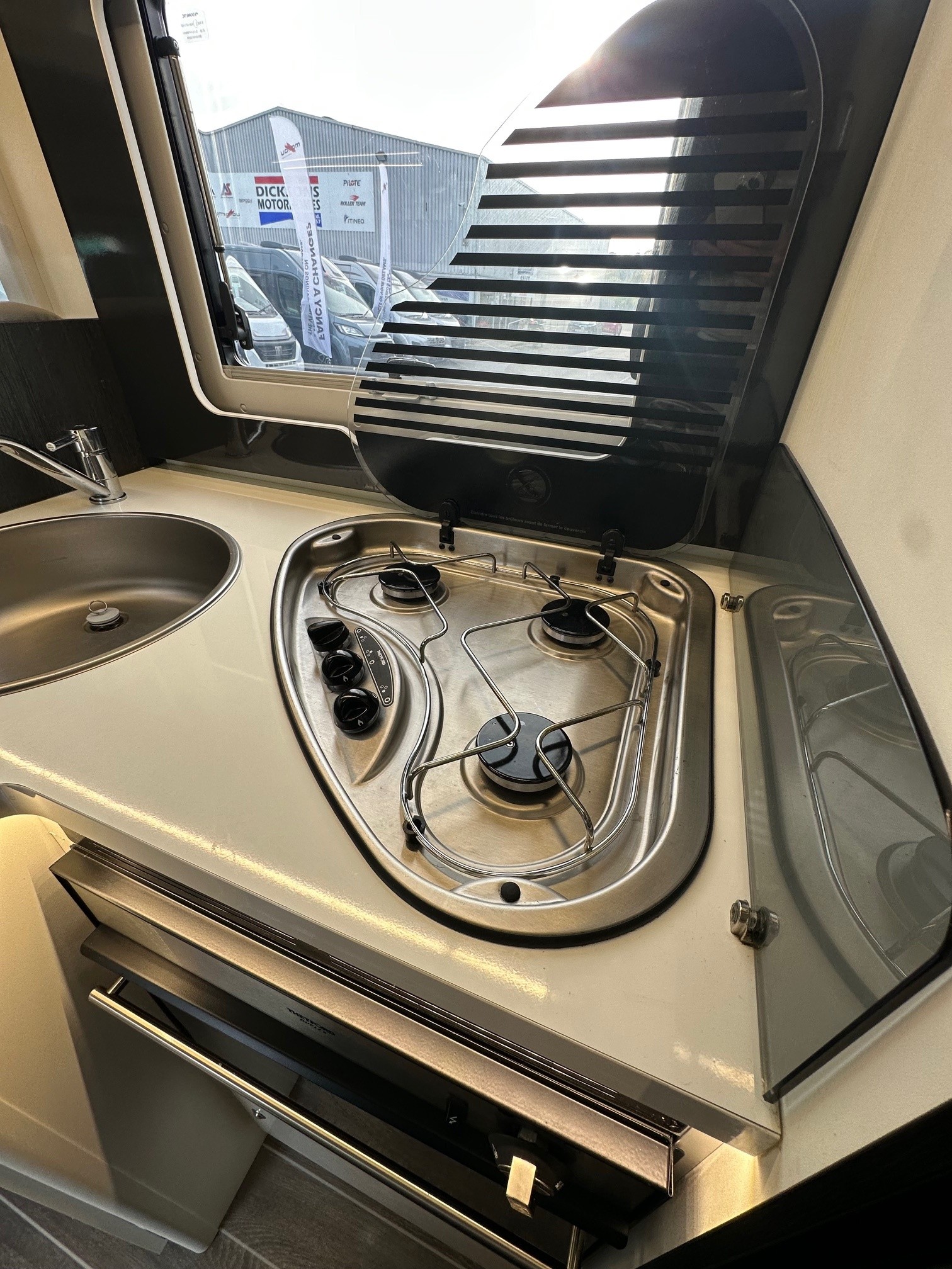 - Well-equipped kitchen:Â Prepare meals on the road with the centrally located kitchen, featuring a 3-burner gas hob, combined oven and grill, stainless-steel sink, and a large fridge/freezer.