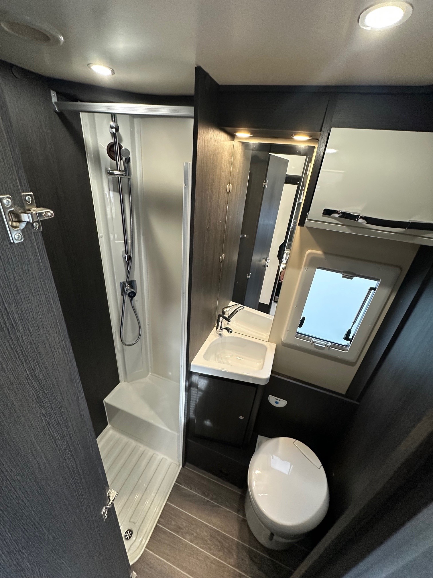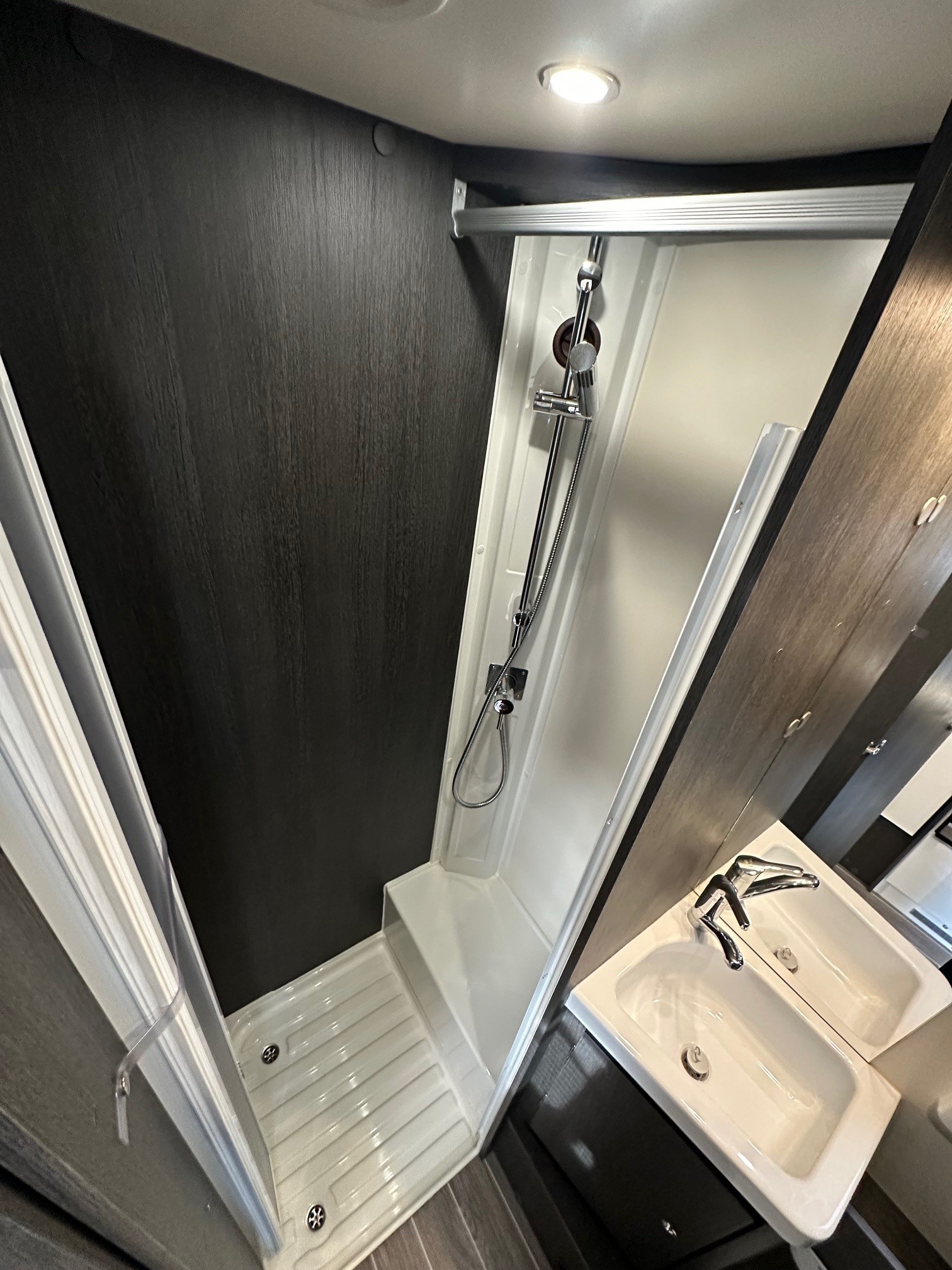 - Integrated washroom:Â The onboard washroom includes a solid-lined shower cubicle, a vanity sink, and a cassette toilet.