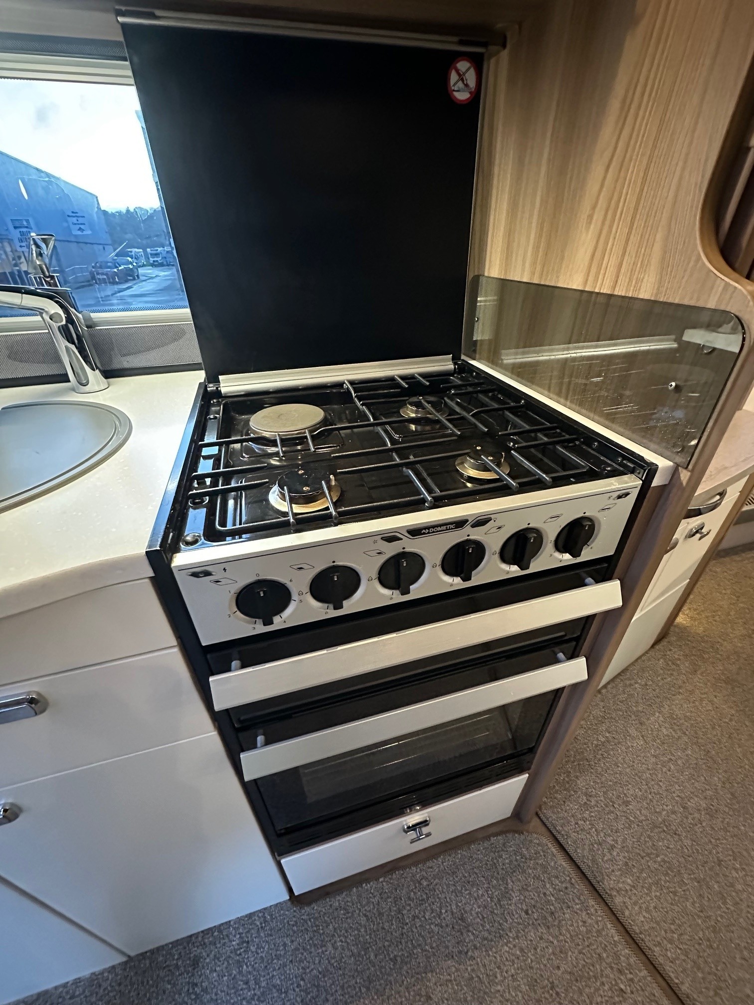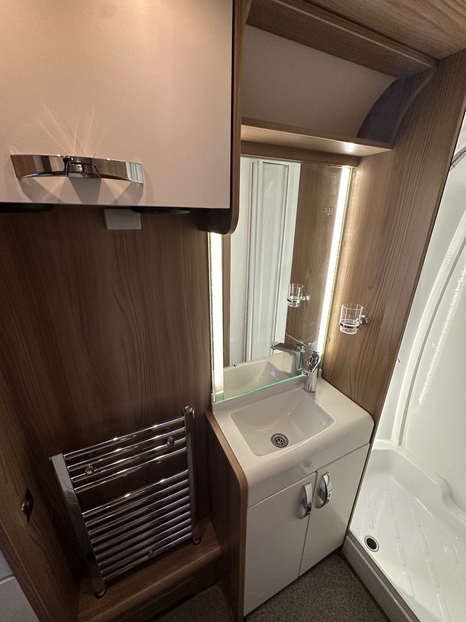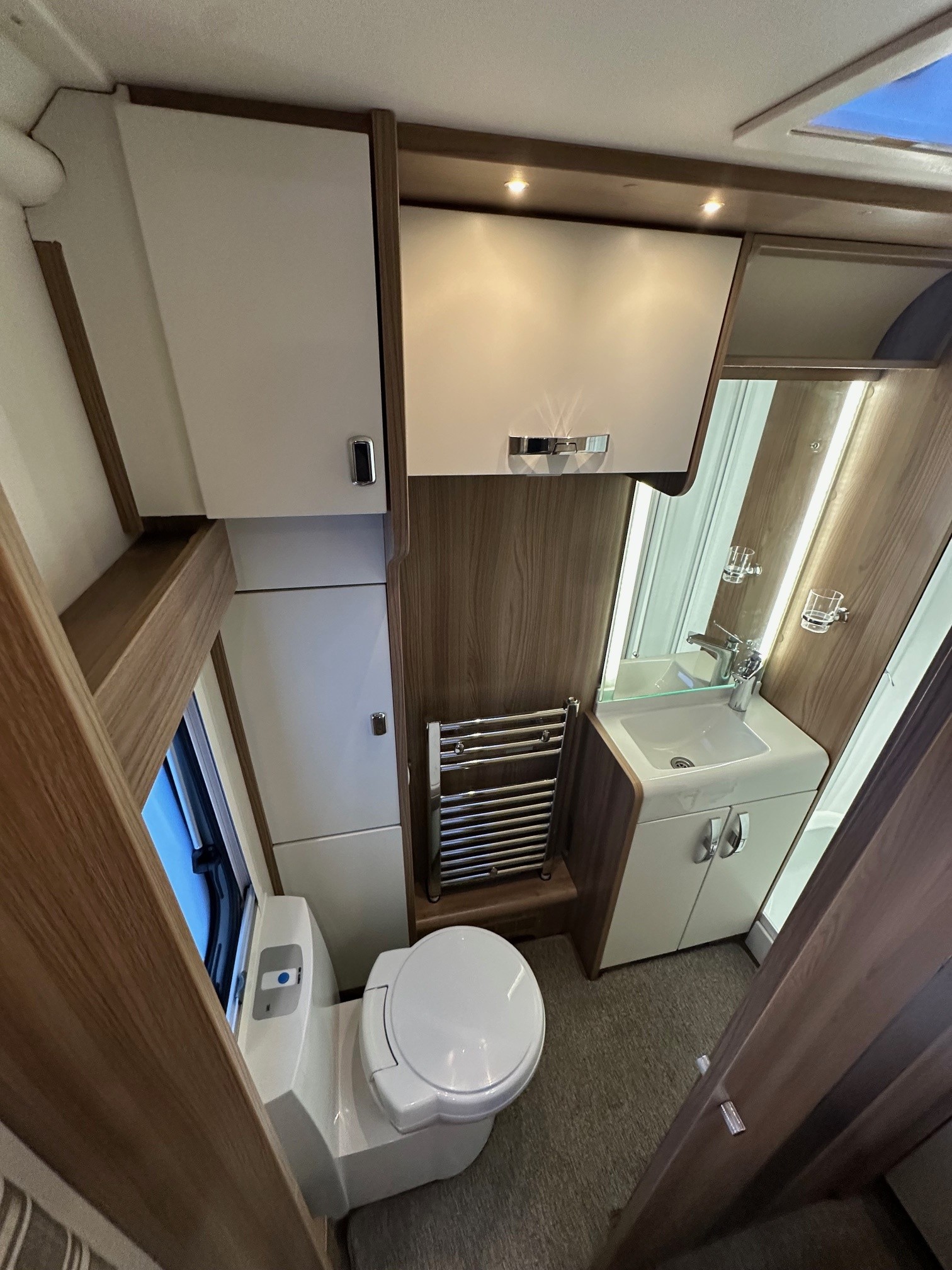 - Convenience & Practicality:Â Features like an 80W roof-mounted solar panel, external BBQ and 230V points, and a large front locker enhance your touring experience. The full-width end washroom includes a separate shower cubicle and a domestic-style heated towel rail.