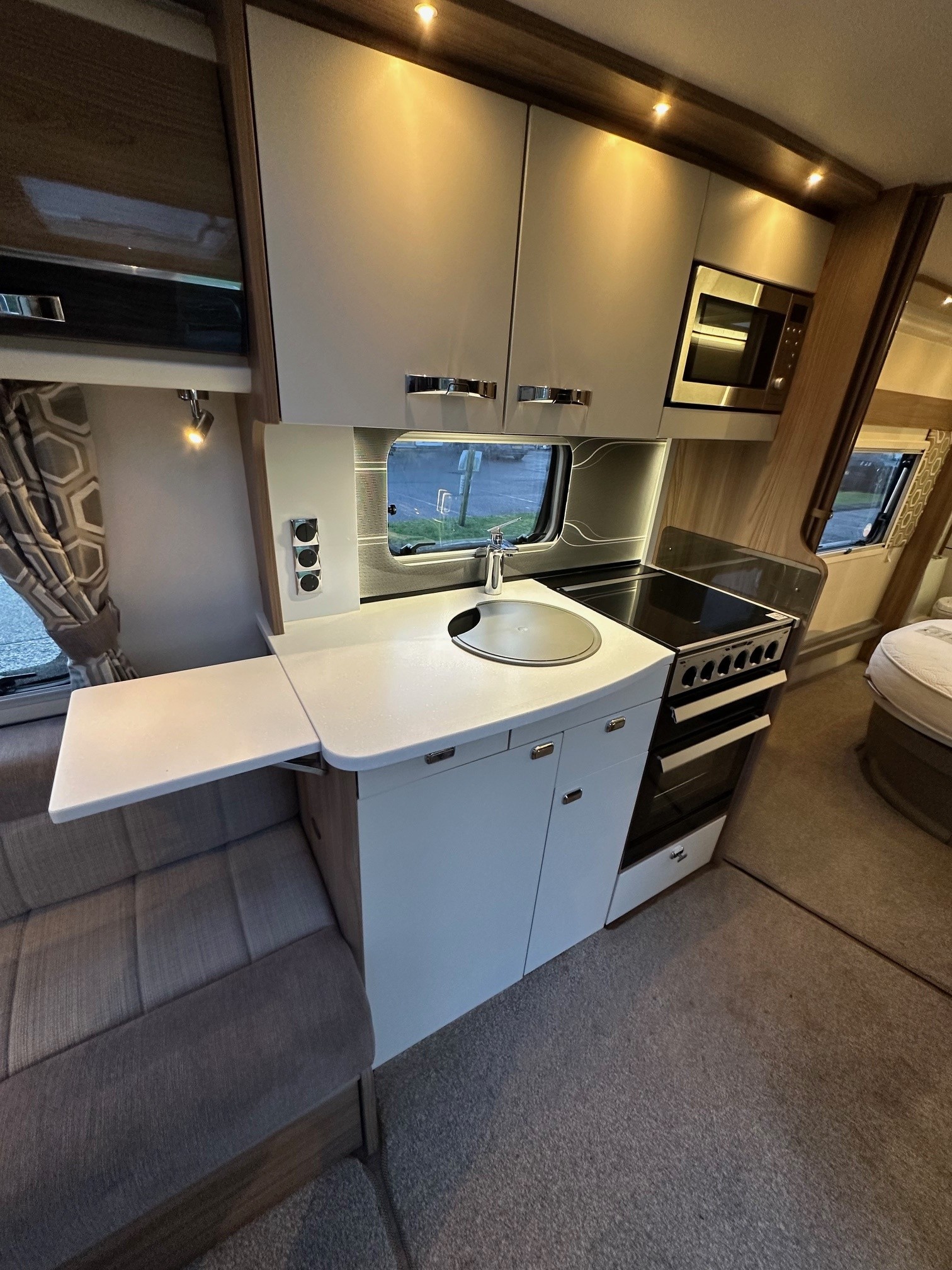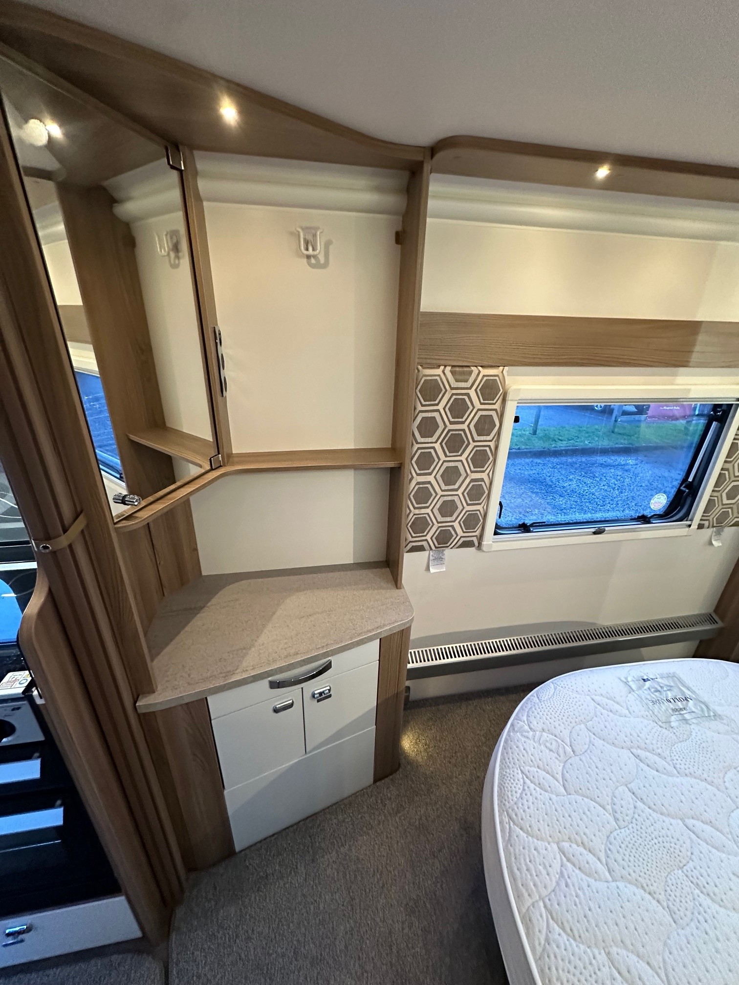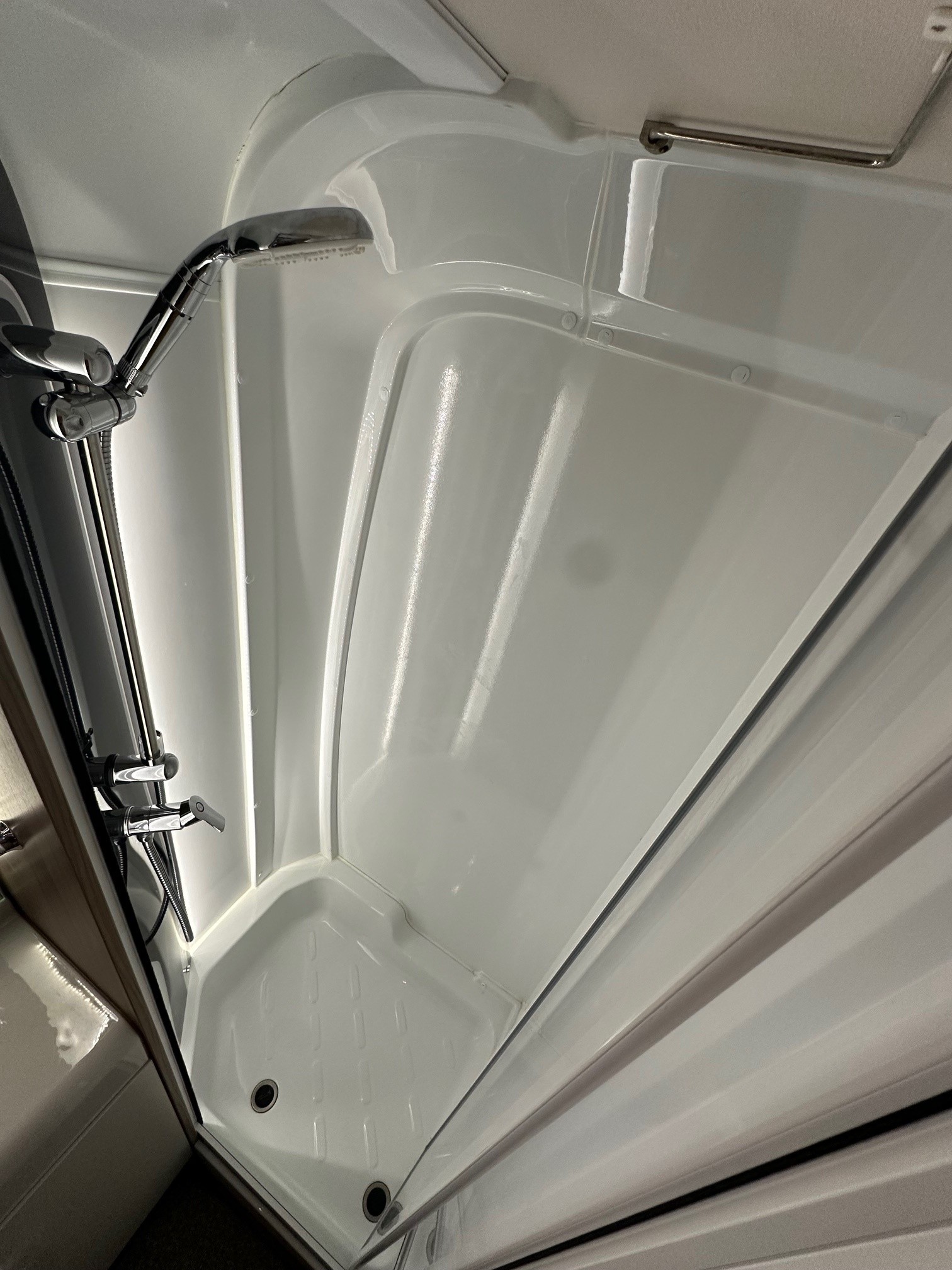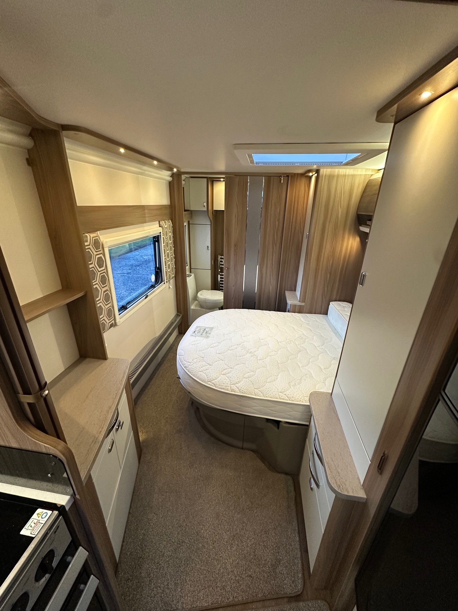 - Convenience & Practicality:Â Features like an 80W roof-mounted solar panel, external BBQ and 230V points, and a large front locker enhance your touring experience. The full-width end washroom includes a separate shower cubicle and a domestic-style heated towel rail.