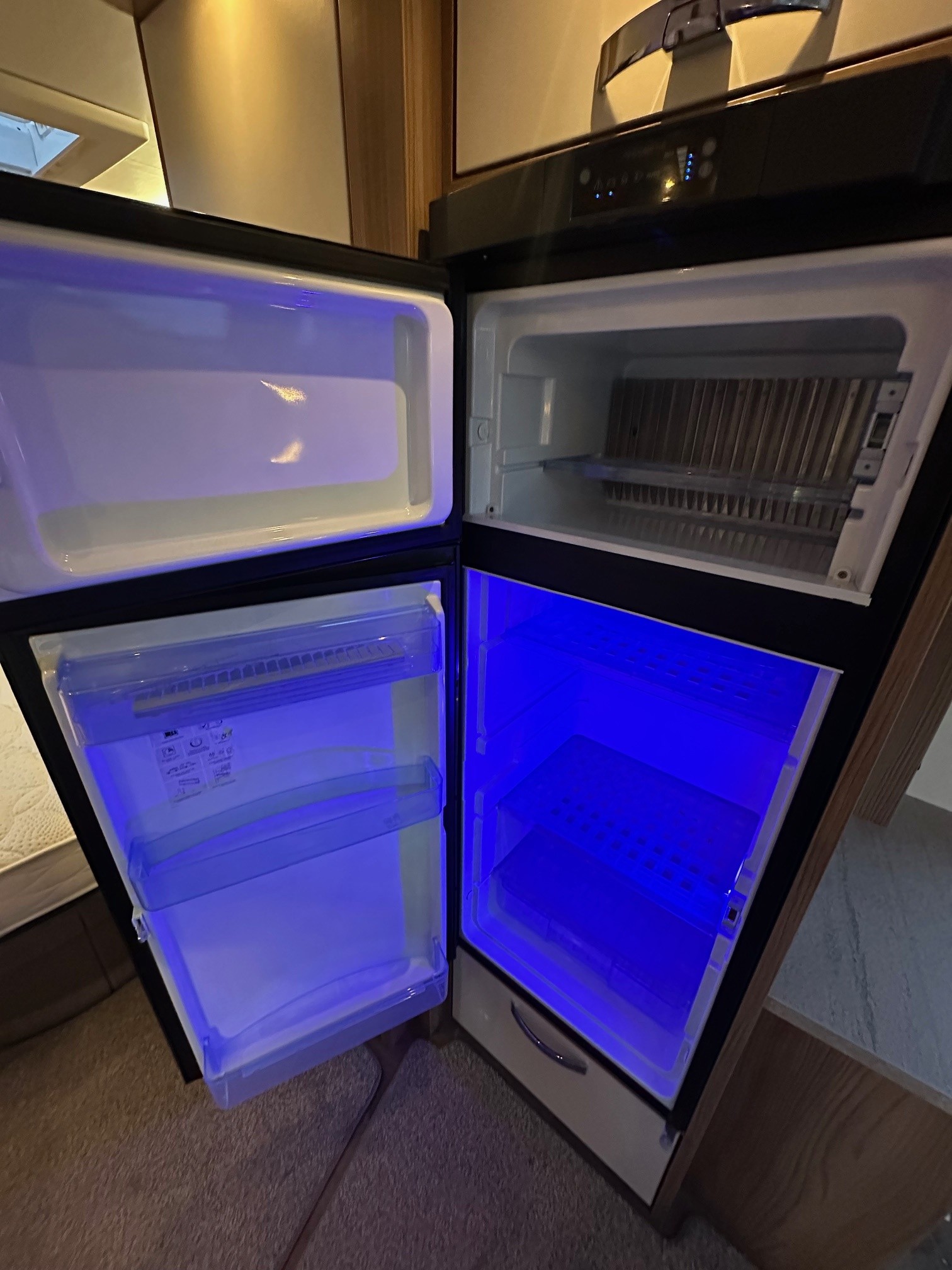 - Gourmet Kitchen: A well-appointed kitchen includes HI-MACS® natural acrylic stone worktops, a Dometic oven (3 gas hobs, 1 electric plate), a separate grill, a ventilated microwave, and a large 190-litre Dometic double-door fridge freezer.