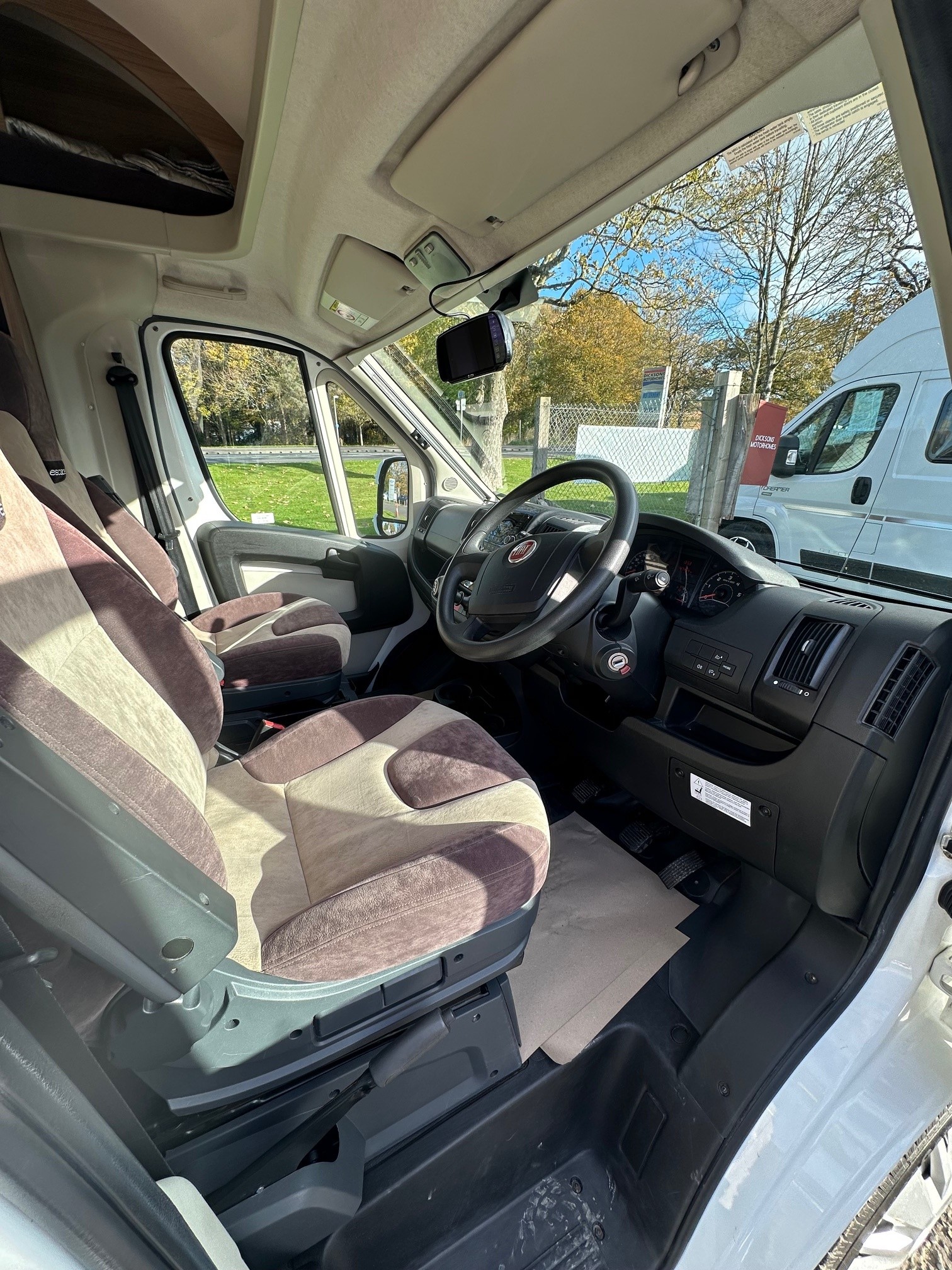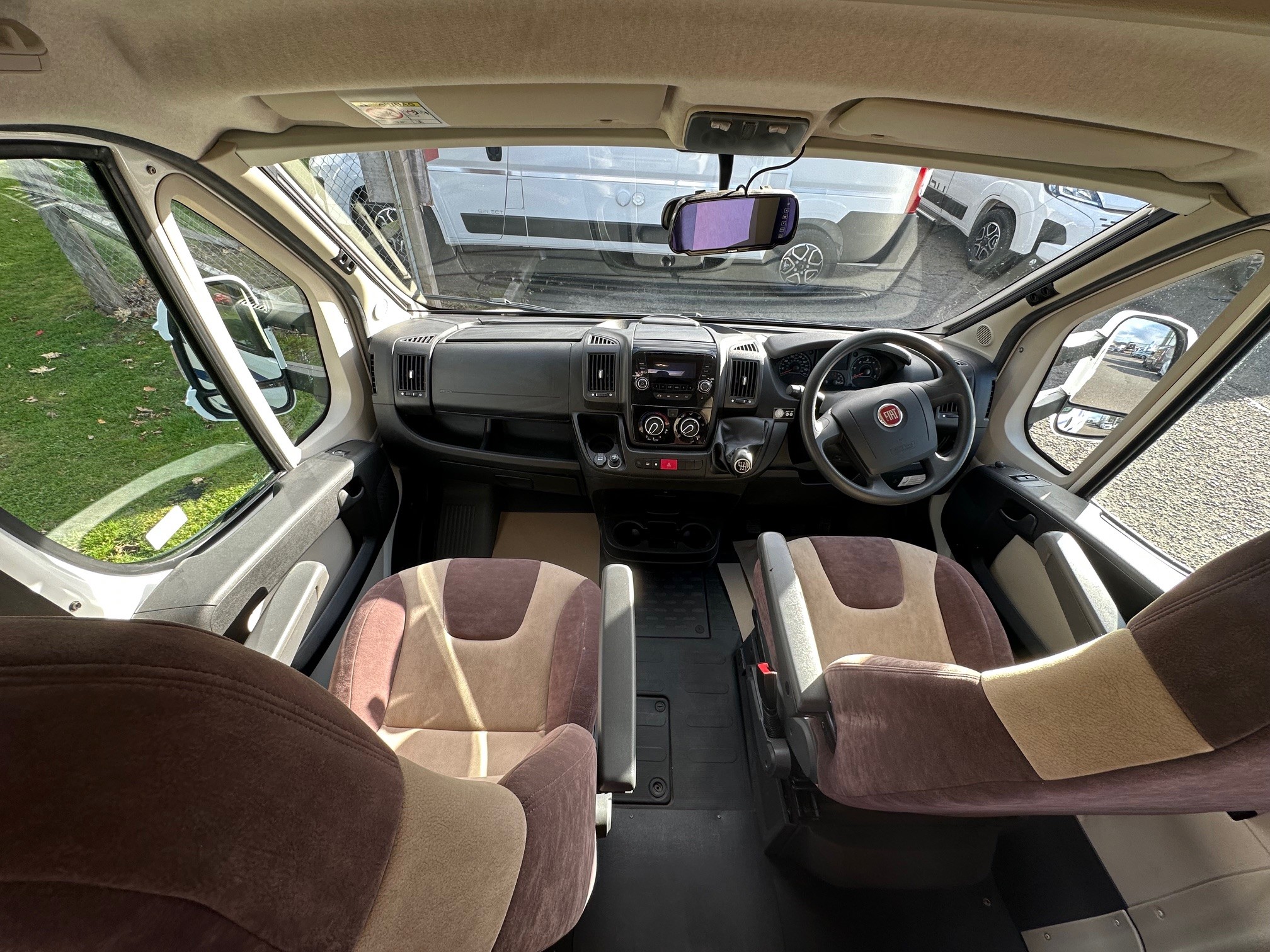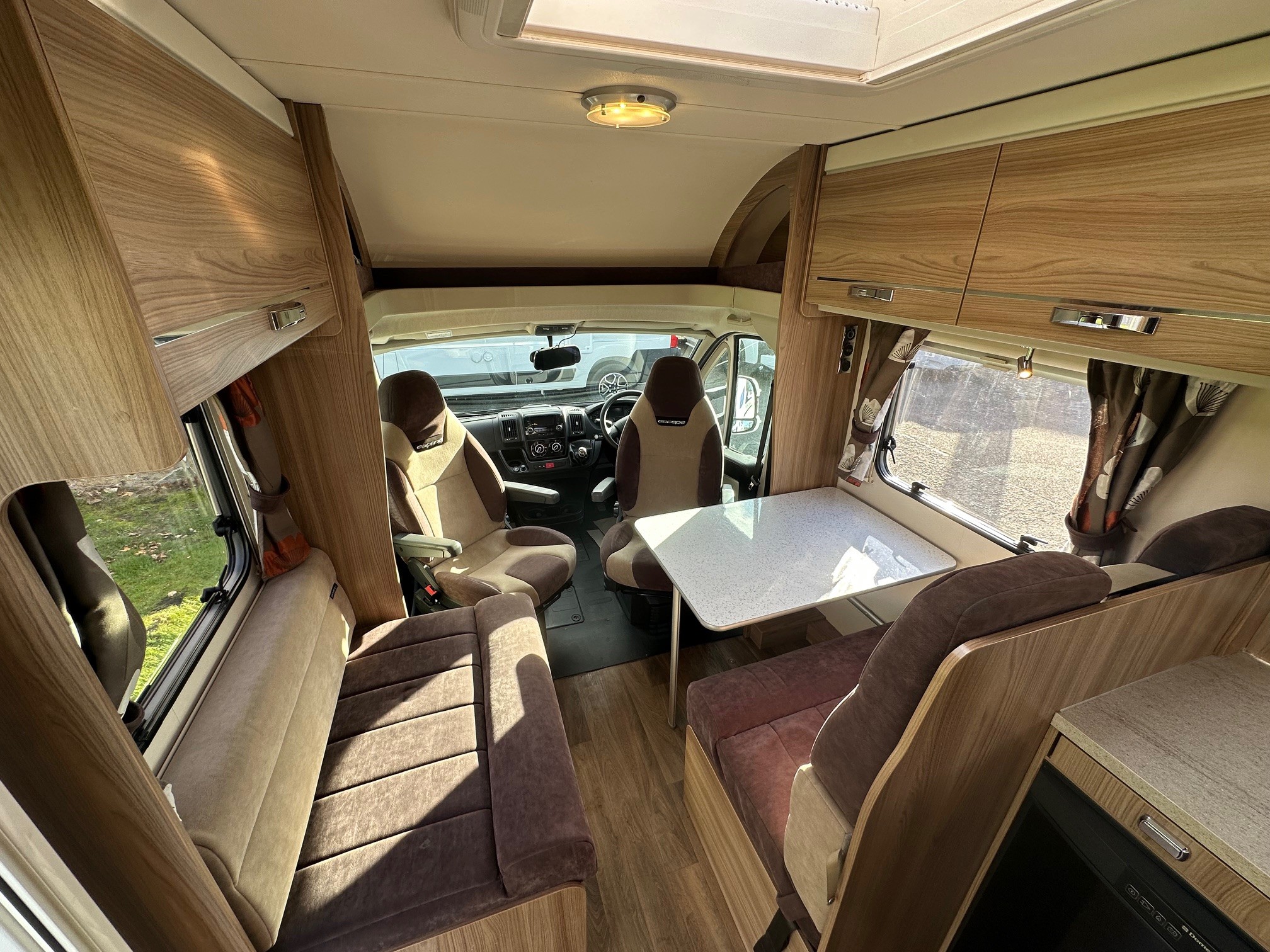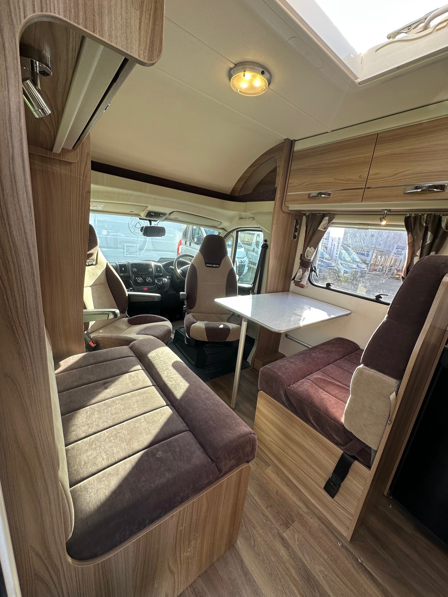 - Flexible living space: The front half-dinette, combined with the swivelling cab seats, creates a spacious and social area for up to six people to dine or relax. It easily converts into a second double bed for additional sleeping space, ideal for children or occasional guests.