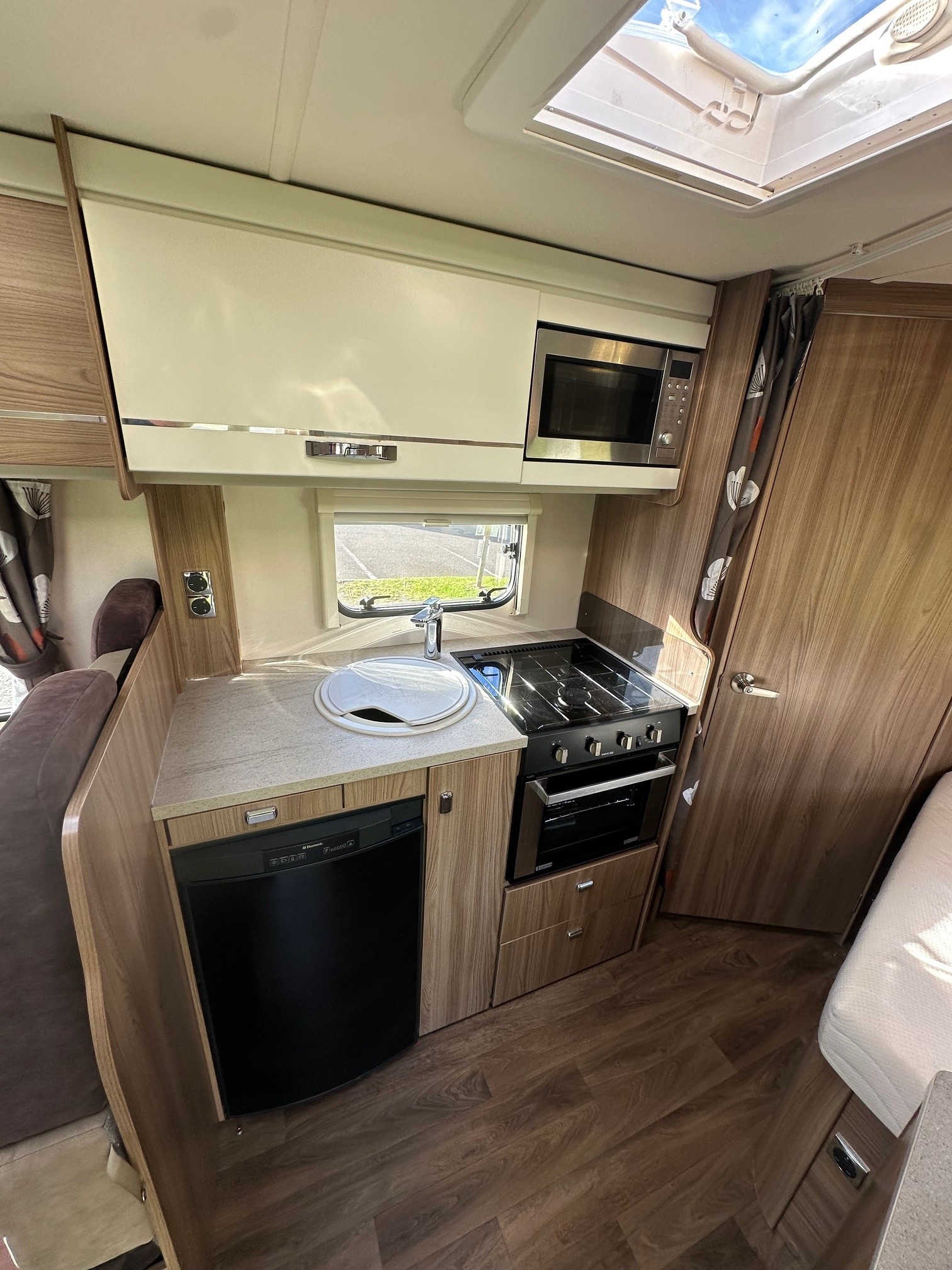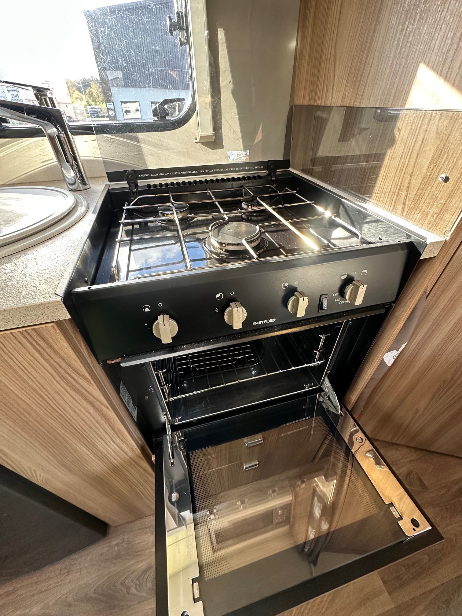 - Well-equipped kitchen: The practical kitchen includes a three-burner hob, a combined oven and grill, and a fridge with a freezer compartment, allowing you to prepare your favourite meals on the road.