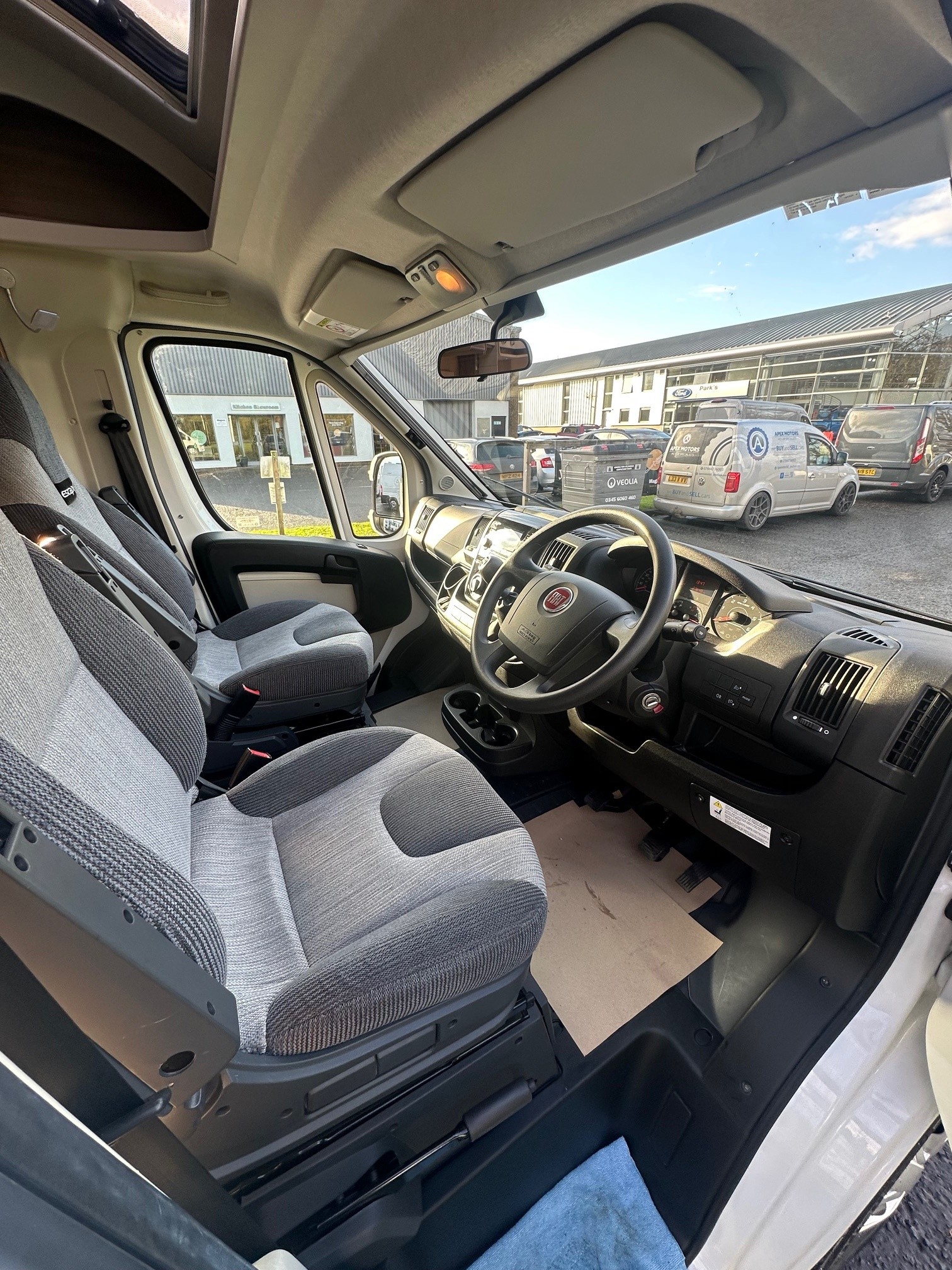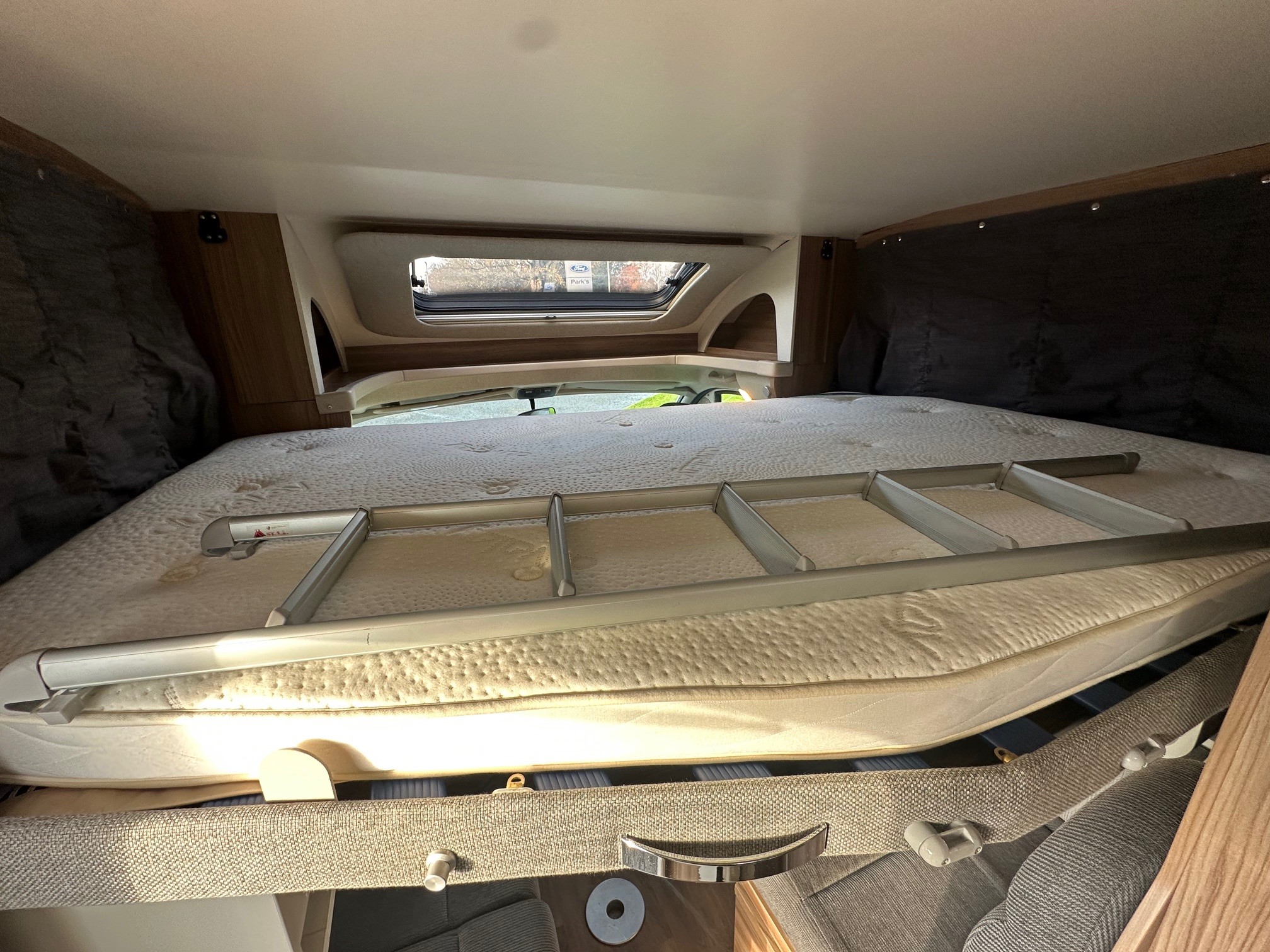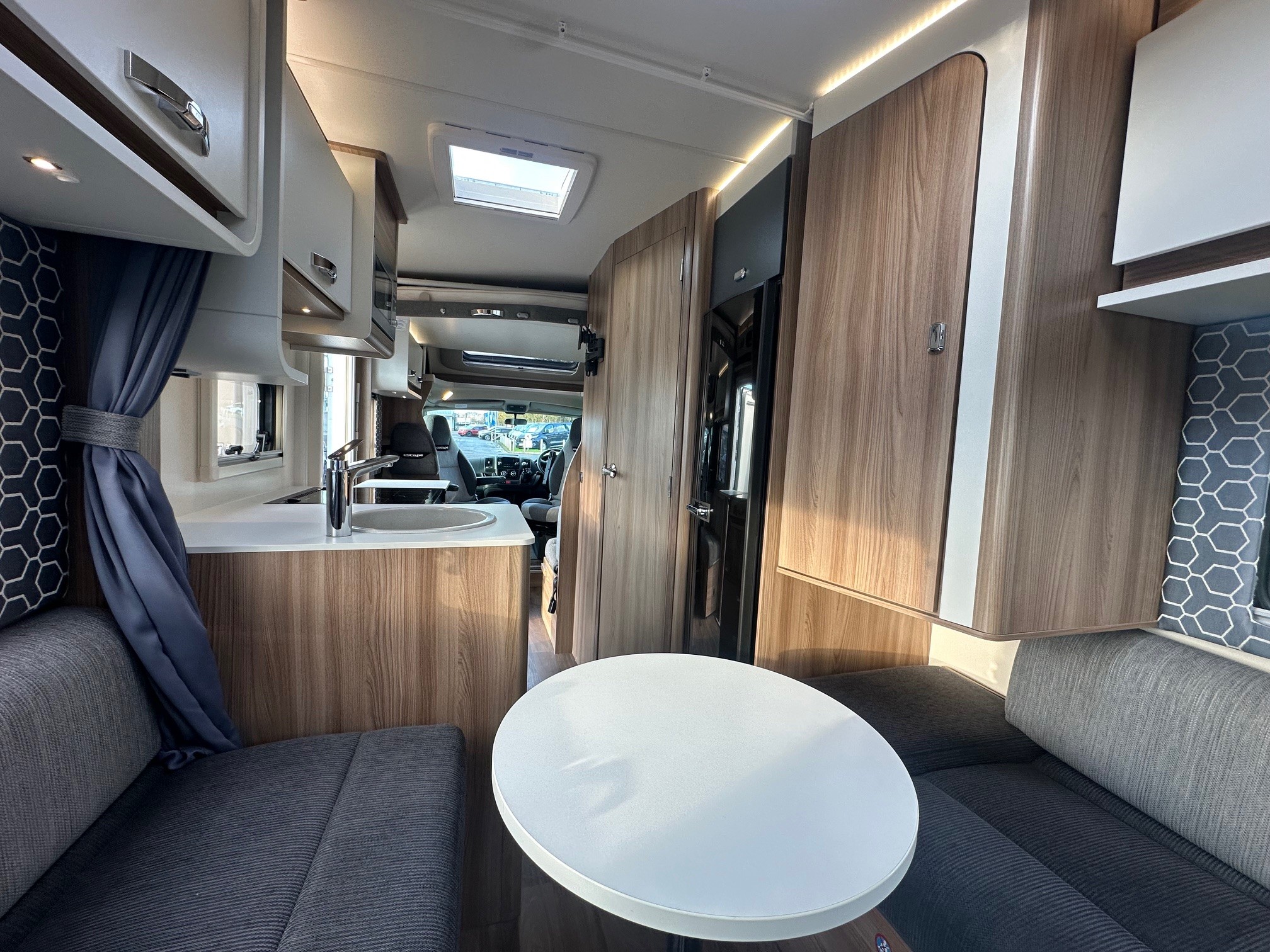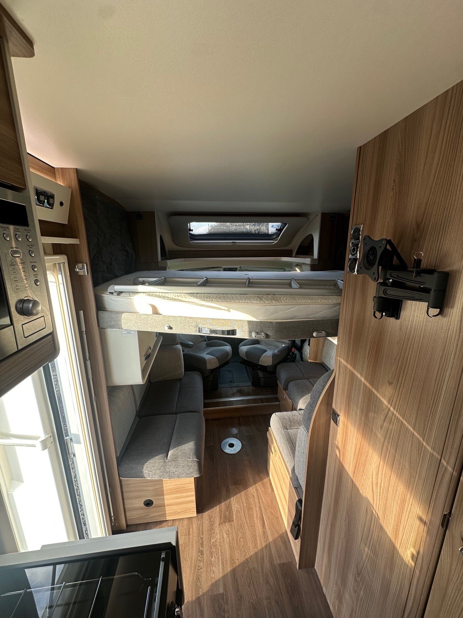 - Rear Lounge & Drop-Down Double Bed:Â The heart of this motorhome is its spacious U-shaped rear lounge, perfect for relaxing and entertaining. At night, a comfortable double bed drops down effortlessly from the ceiling, providing a versatile sleeping arrangement without the need for fixed beds.
