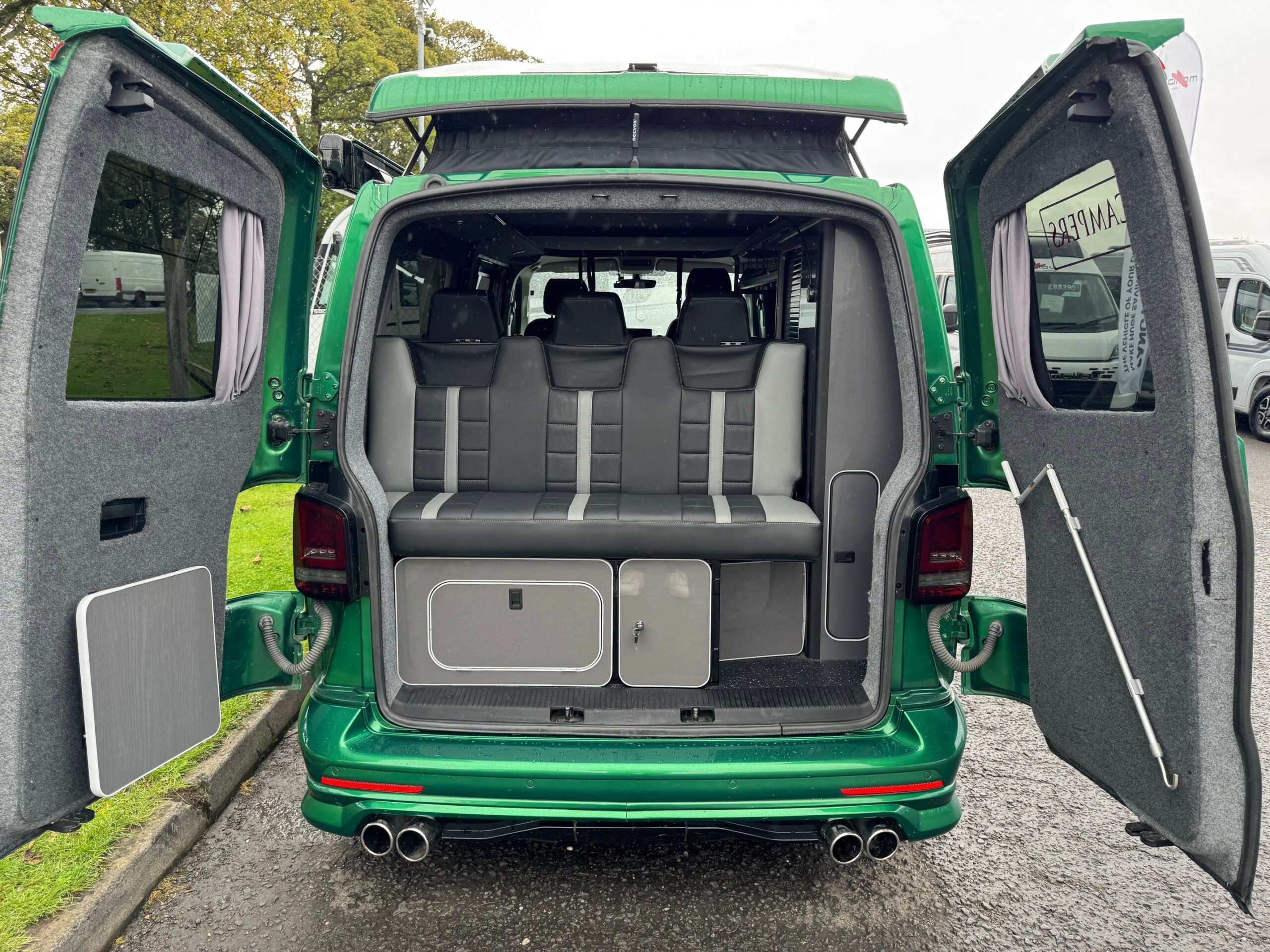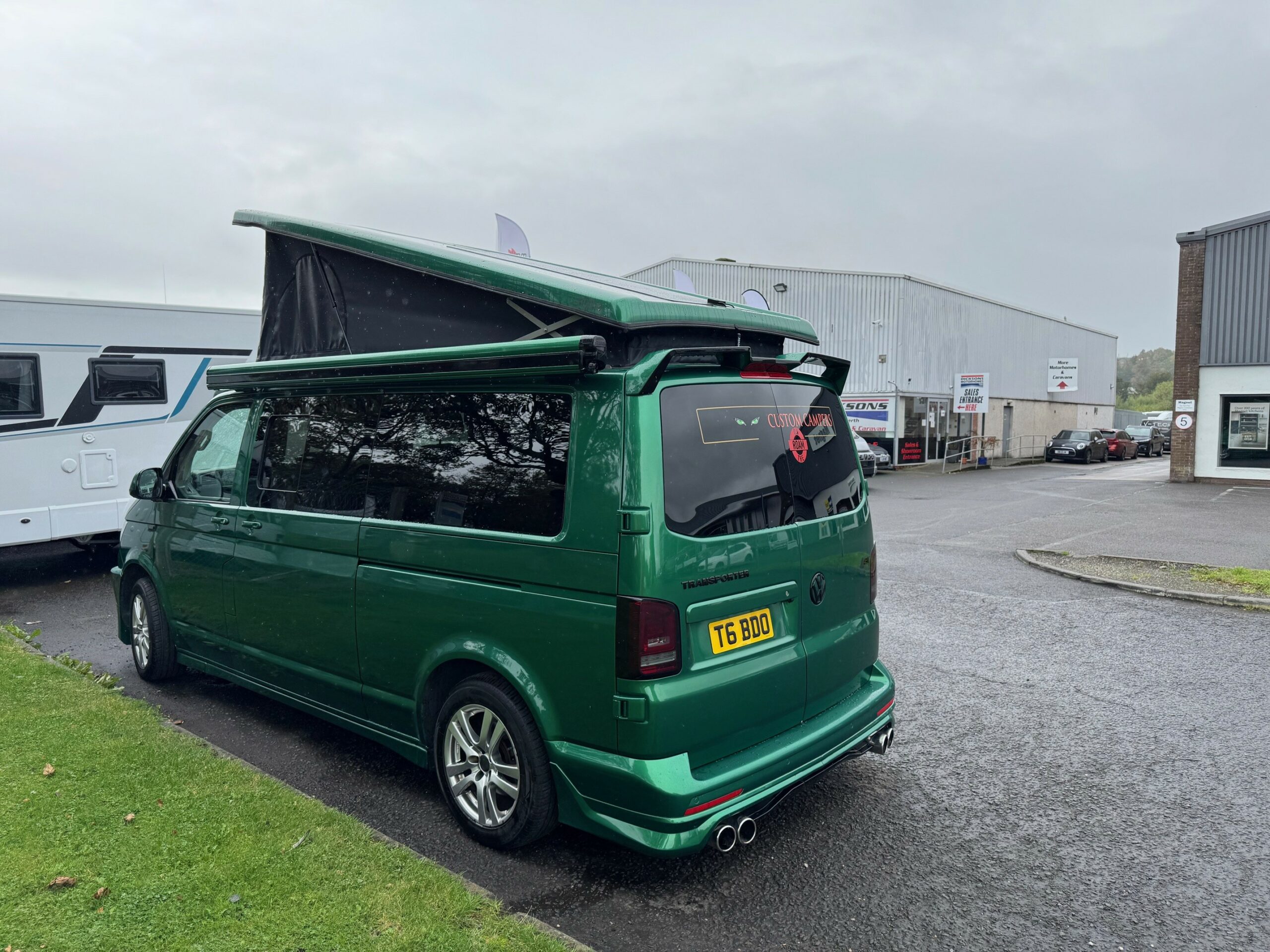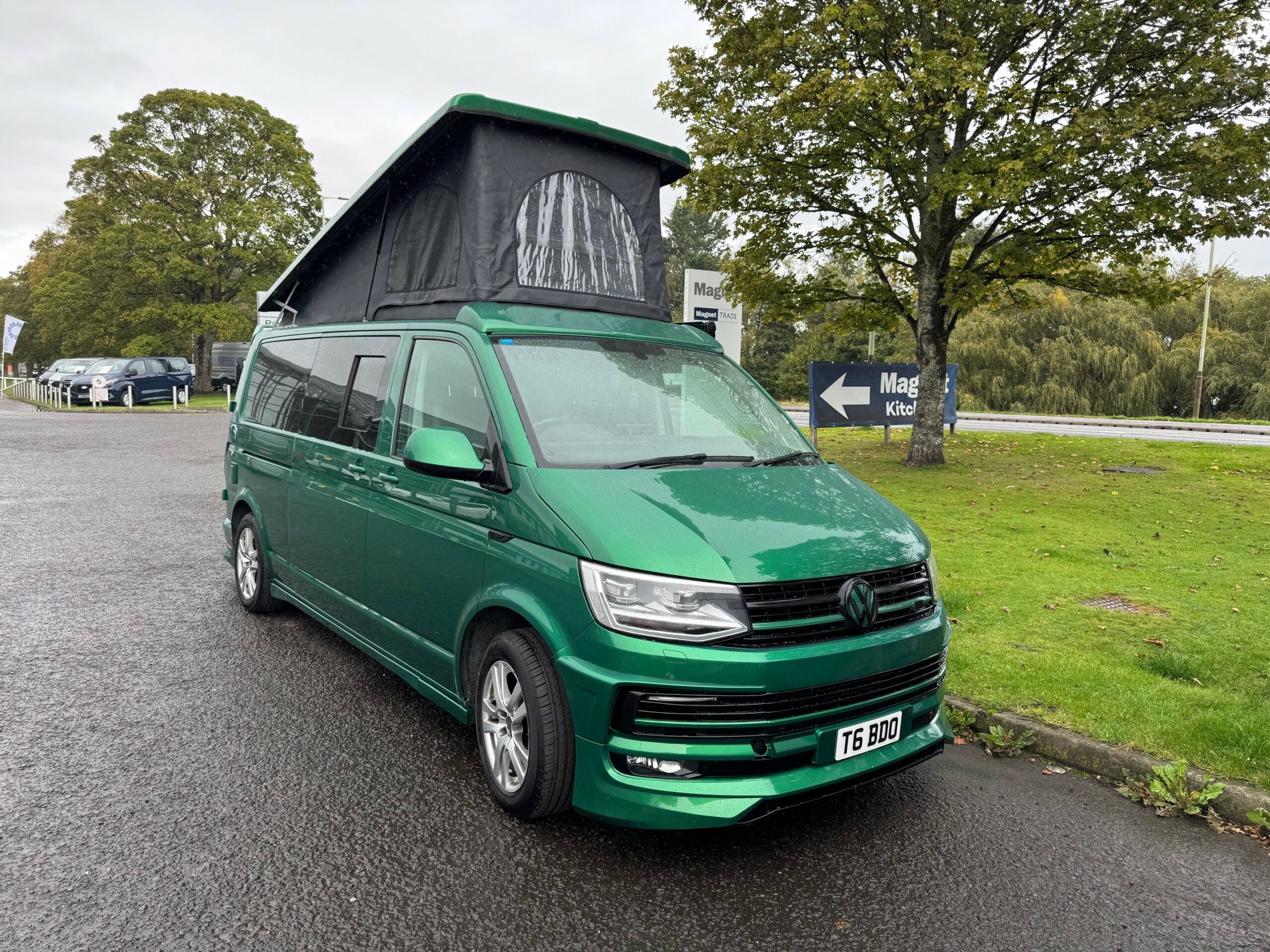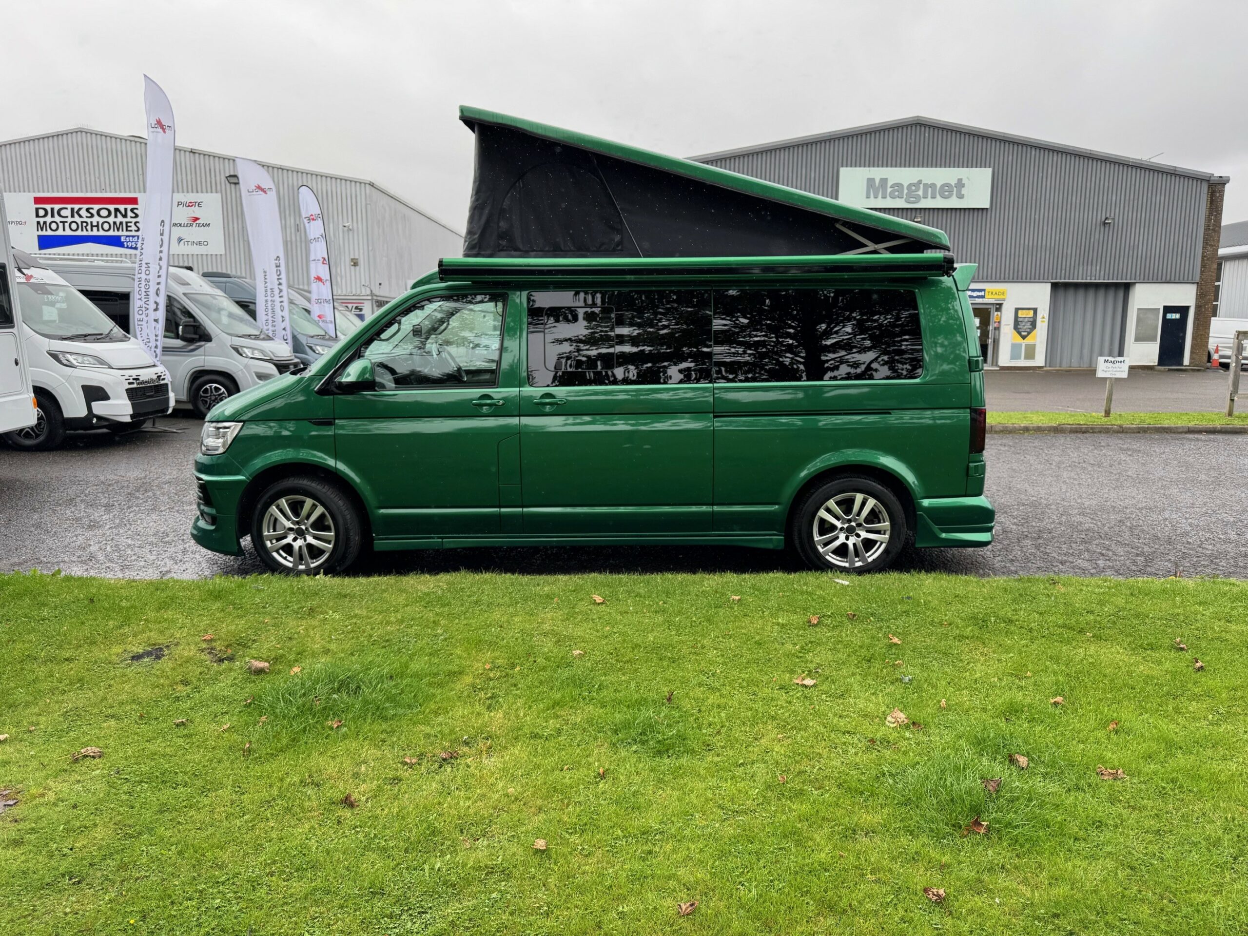 Stunning body kit and metallic green paint! Everything down to the last detail has been exceptionally thought out. This is a 5 belt 4 berth with rock n roll bed and pop up roof. Blown air gas heating system. Solar Panel. AWD. Automatic DSG Gearbox. Awning. Air Awning. Rear Camera & Sensors.
