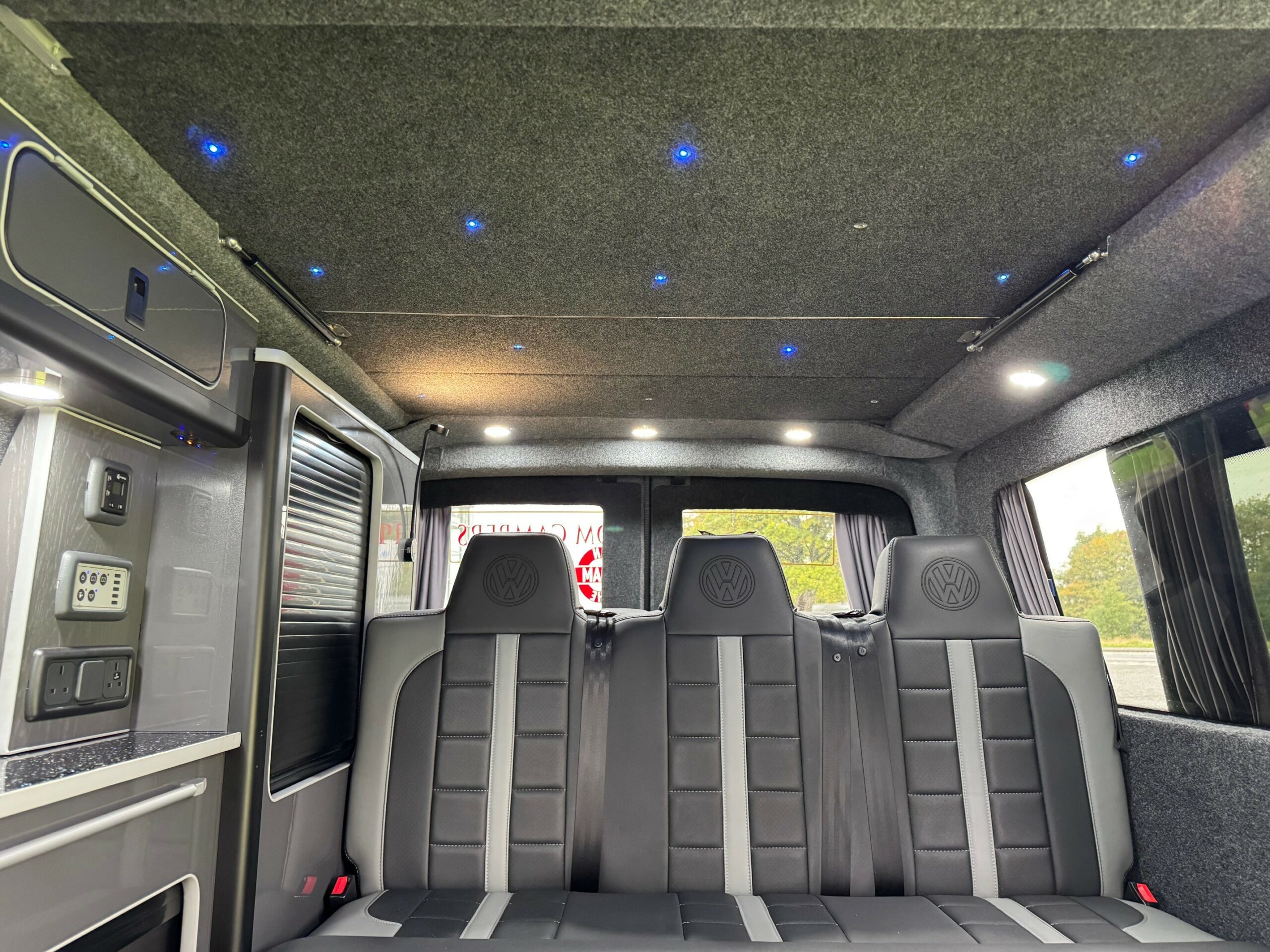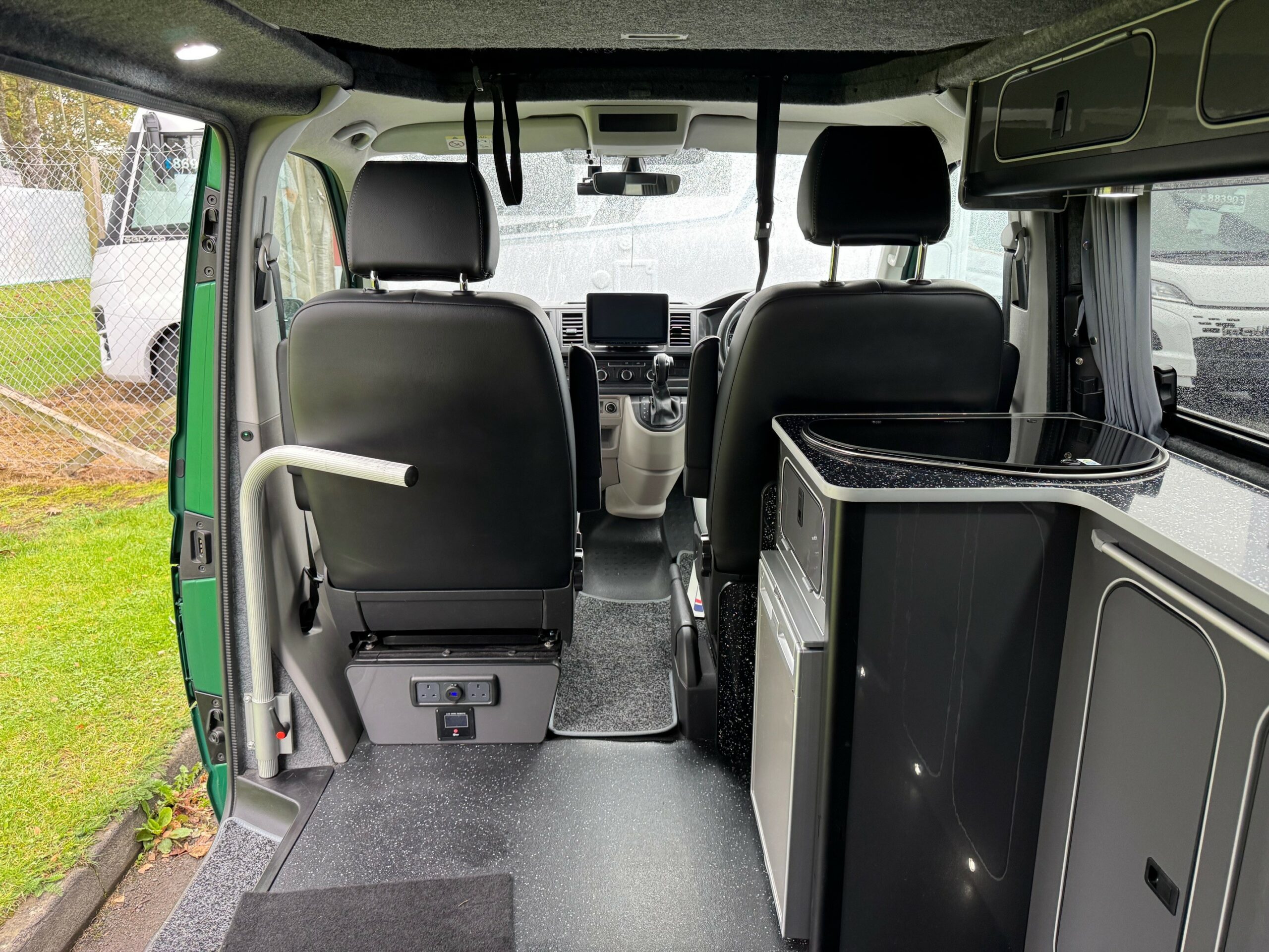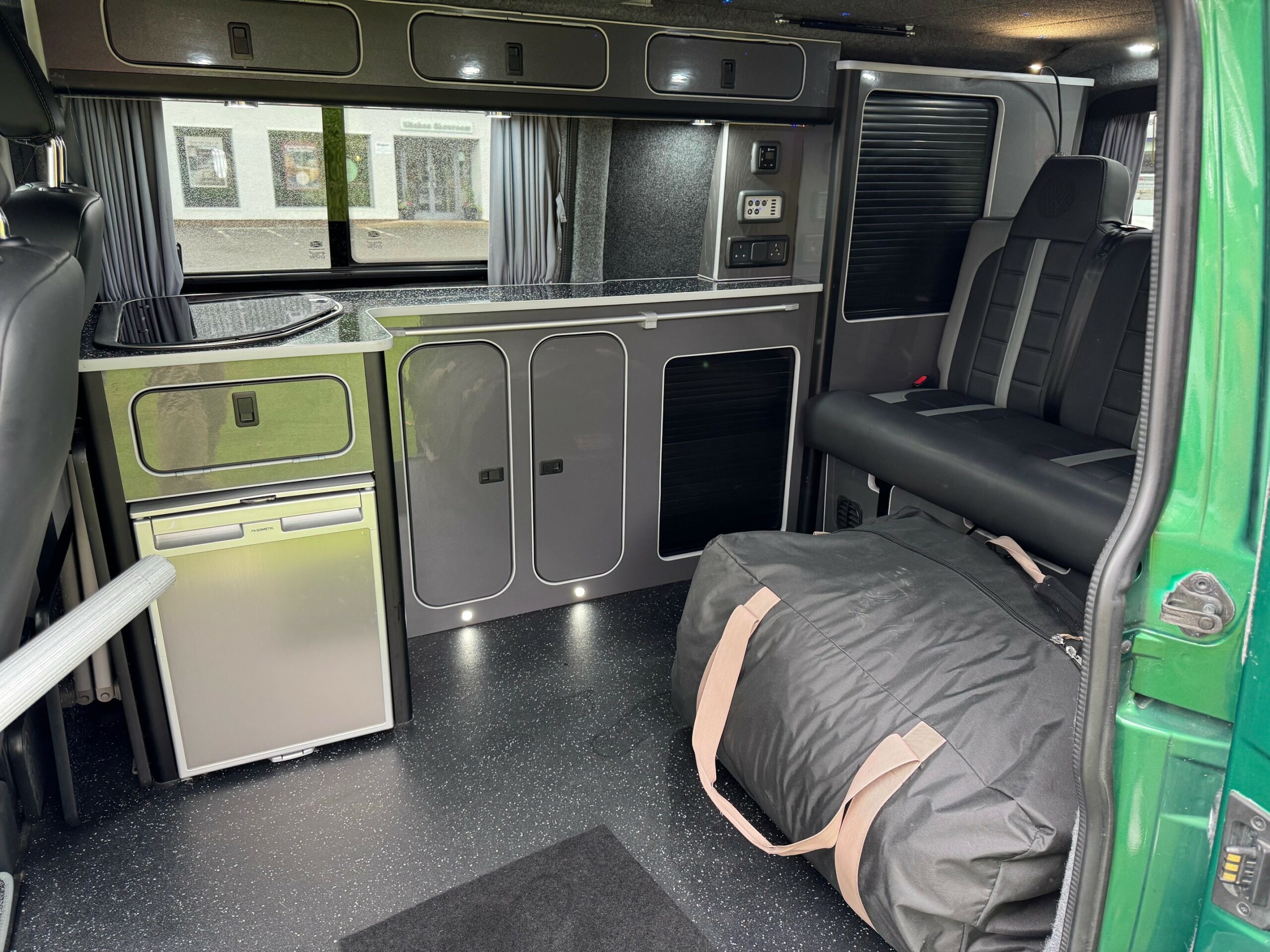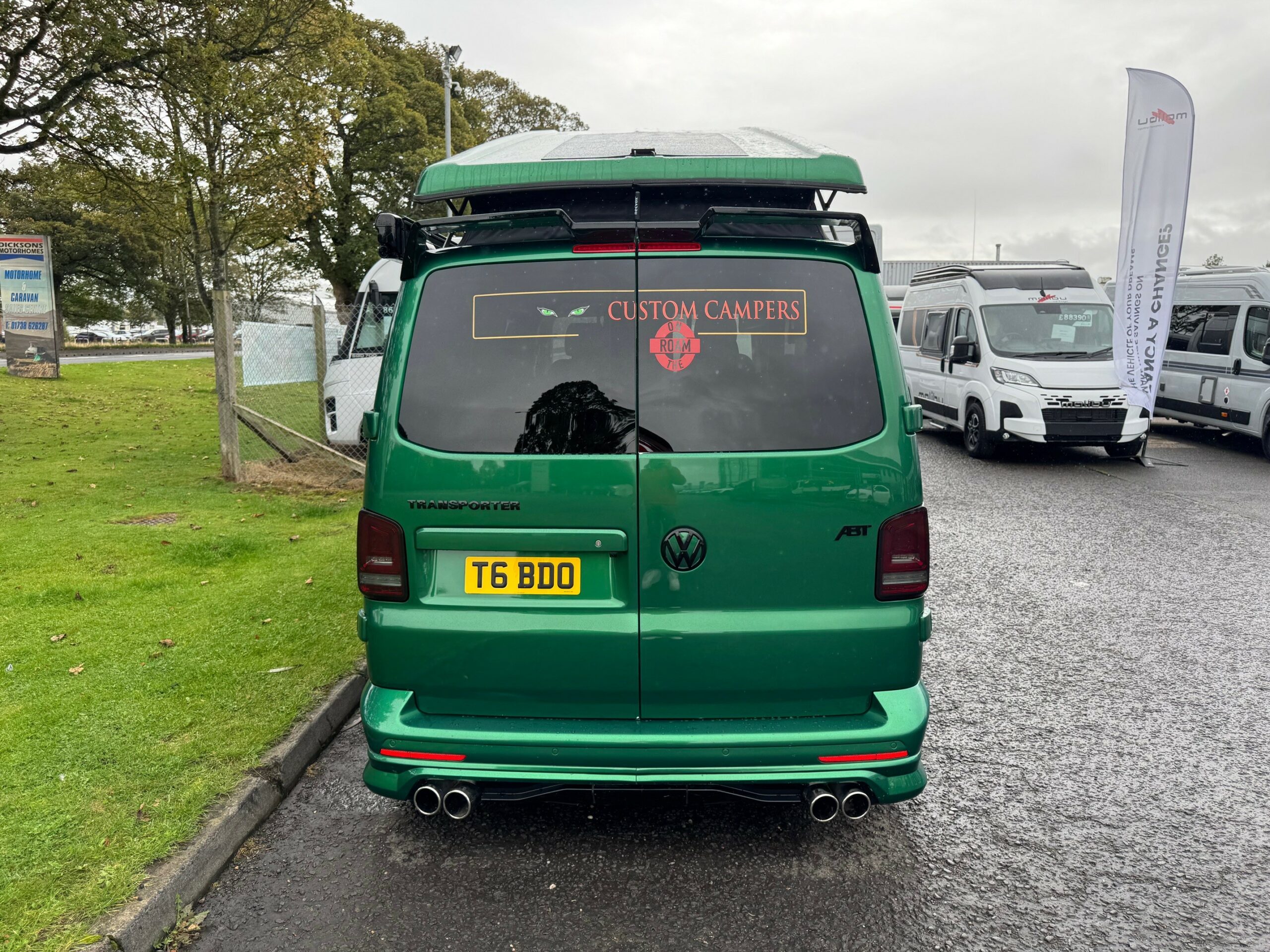 Stunning body kit and metallic green paint! Everything down to the last detail has been exceptionally thought out. This is a 5 belt 4 berth with rock n roll bed and pop up roof. Blown air gas heating system. Solar Panel. AWD. Automatic DSG Gearbox. Awning. Air Awning. Rear Camera & Sensors.