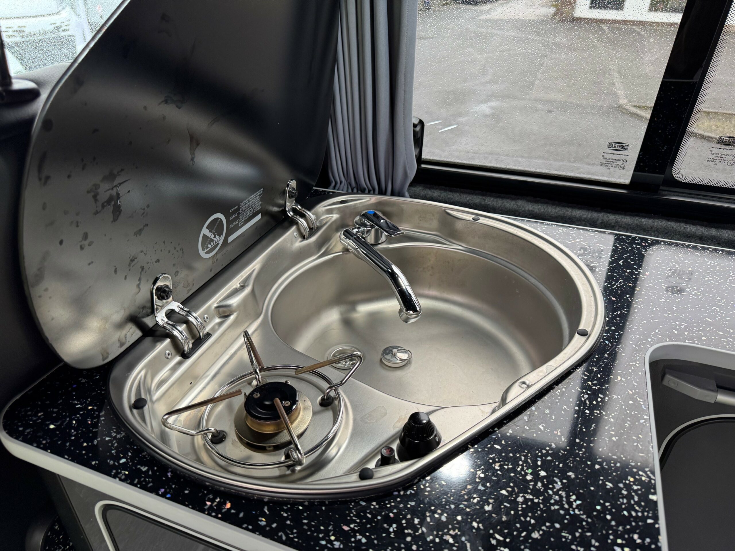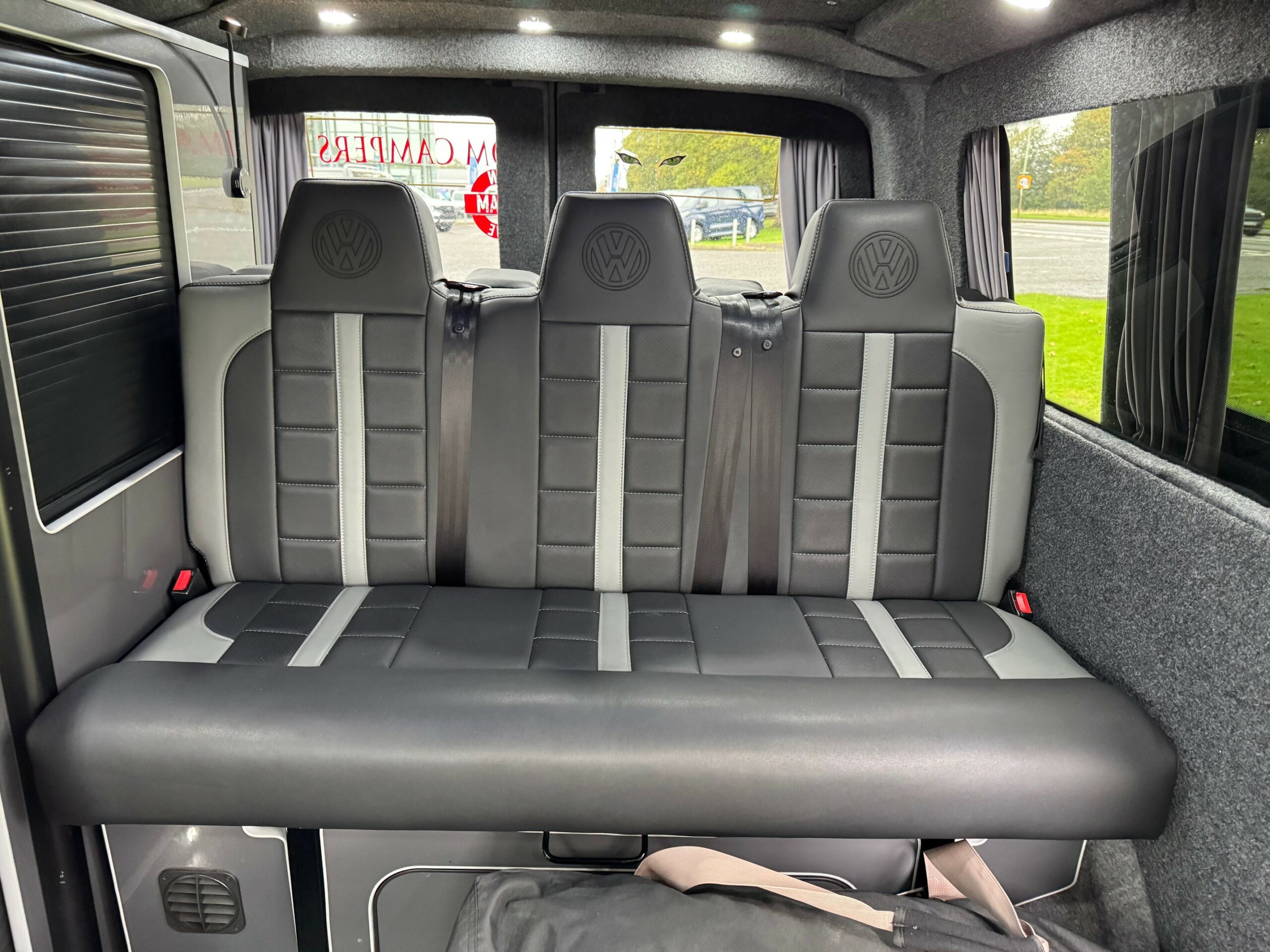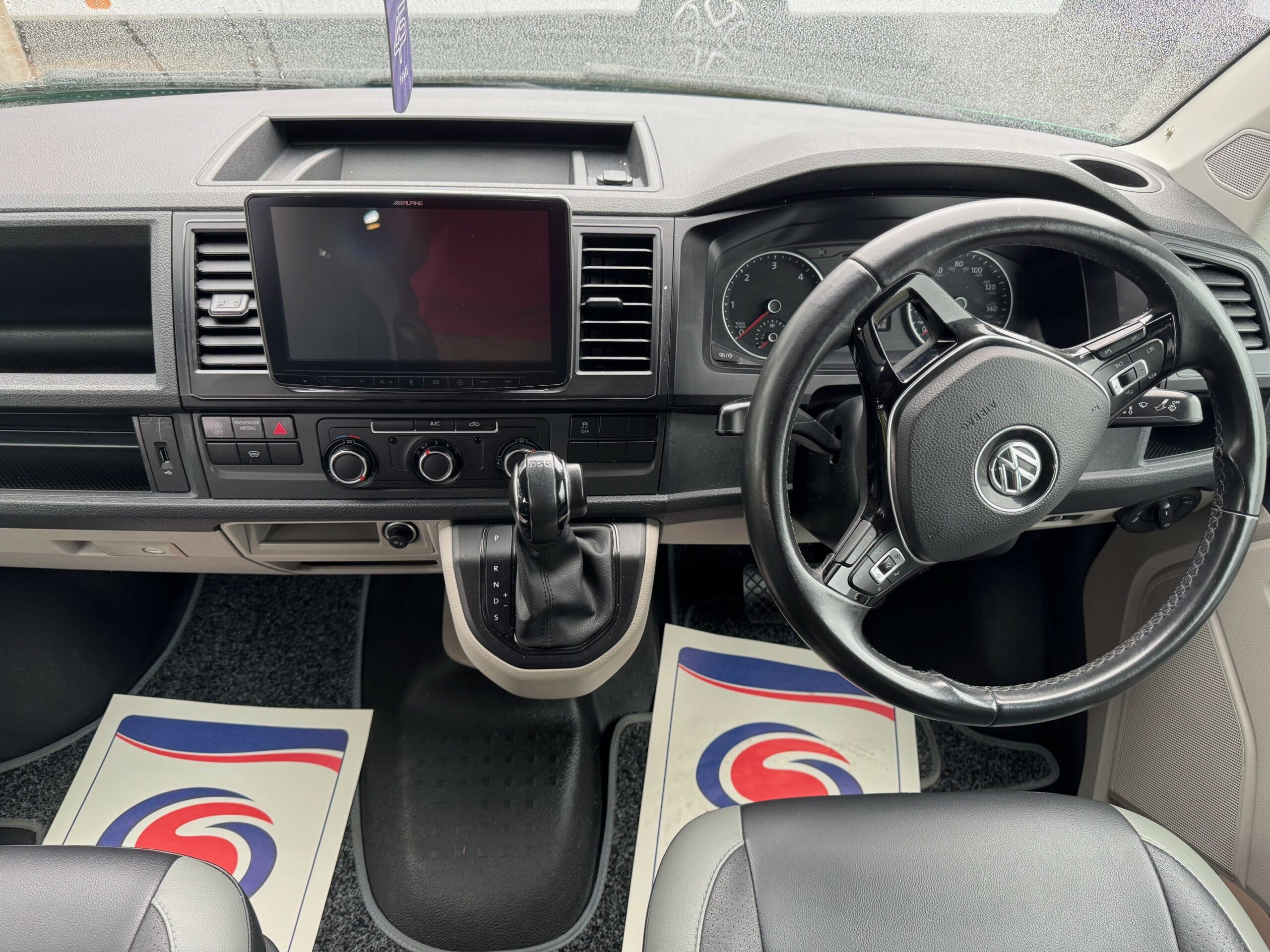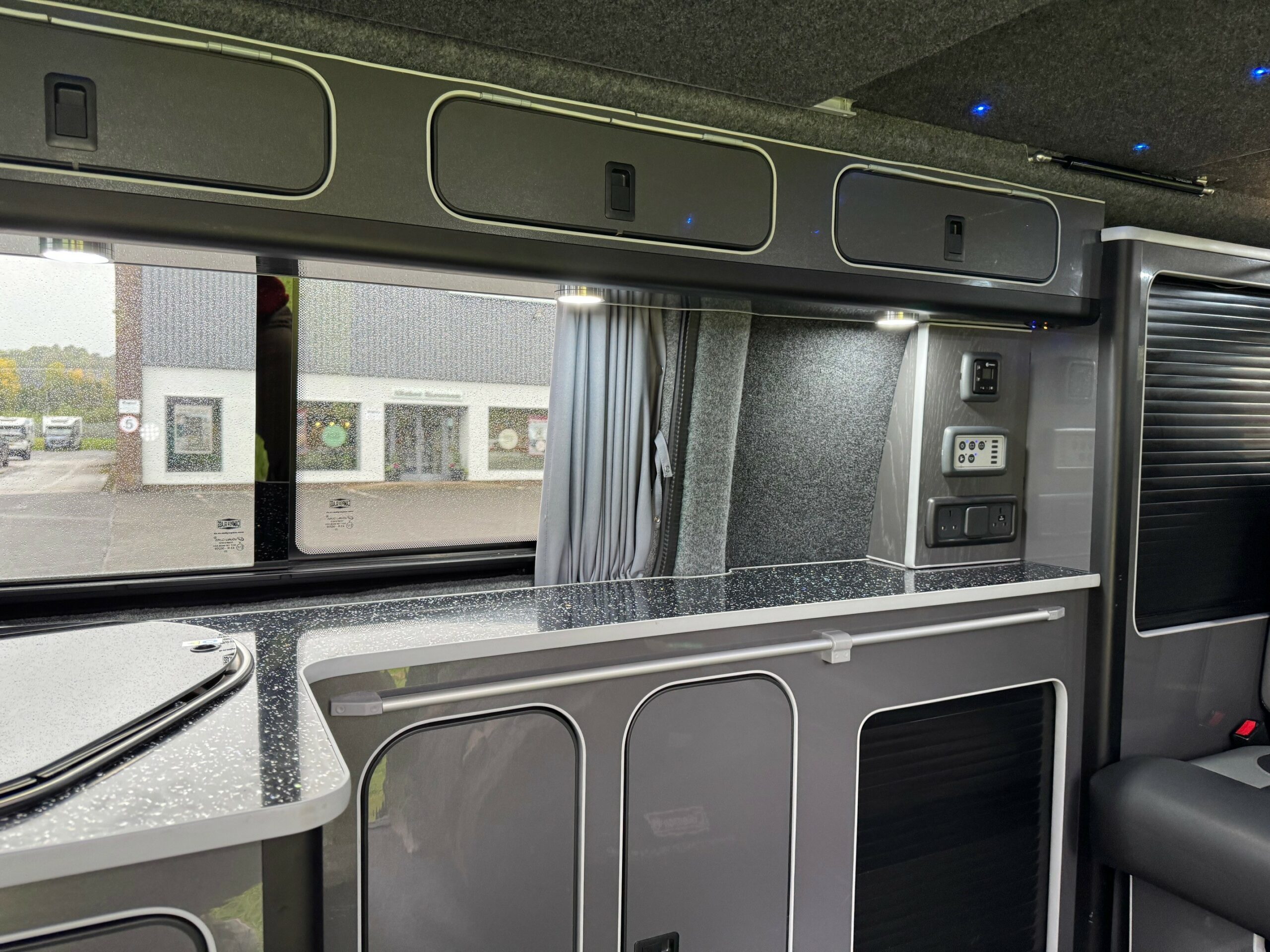 Stunning body kit and metallic green paint! Everything down to the last detail has been exceptionally thought out. This is a 5 belt 4 berth with rock n roll bed and pop up roof. Blown air gas heating system. Solar Panel. AWD. Automatic DSG Gearbox. Awning. Air Awning. Rear Camera & Sensors.